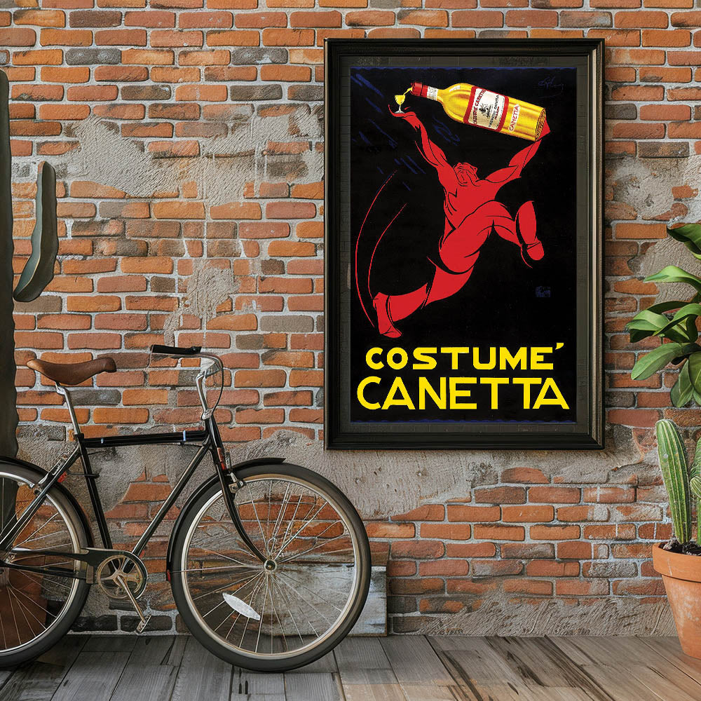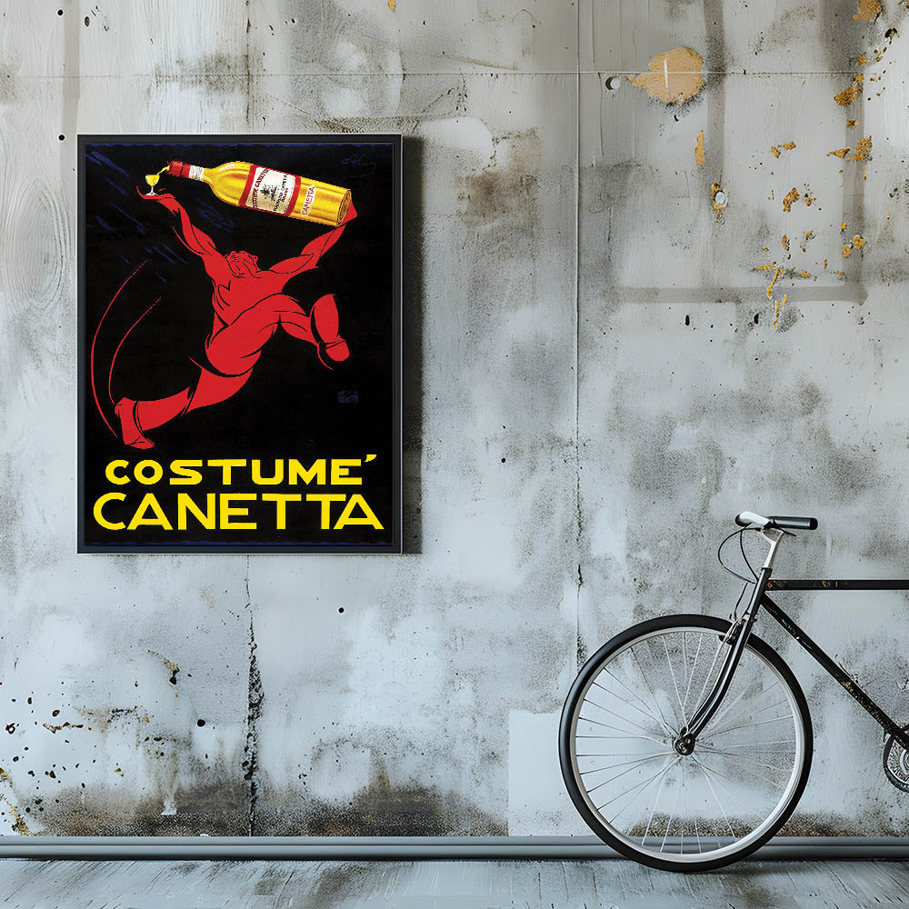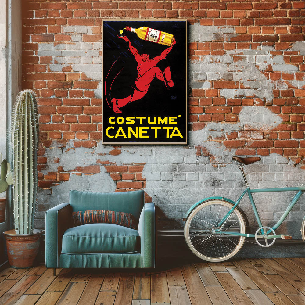 This bold and striking Vintage Costumé Canetta Poster is an iconic example of early 20th-century Italian advertising. Featuring a dynamic figure in red with a bottle of Costumé Canetta being poured into a glass, this piece embodies the elegance and energy of Italian spirit culture. The powerful imagery and vivid color contrast make this poster a standout addition to any collection or home bar.