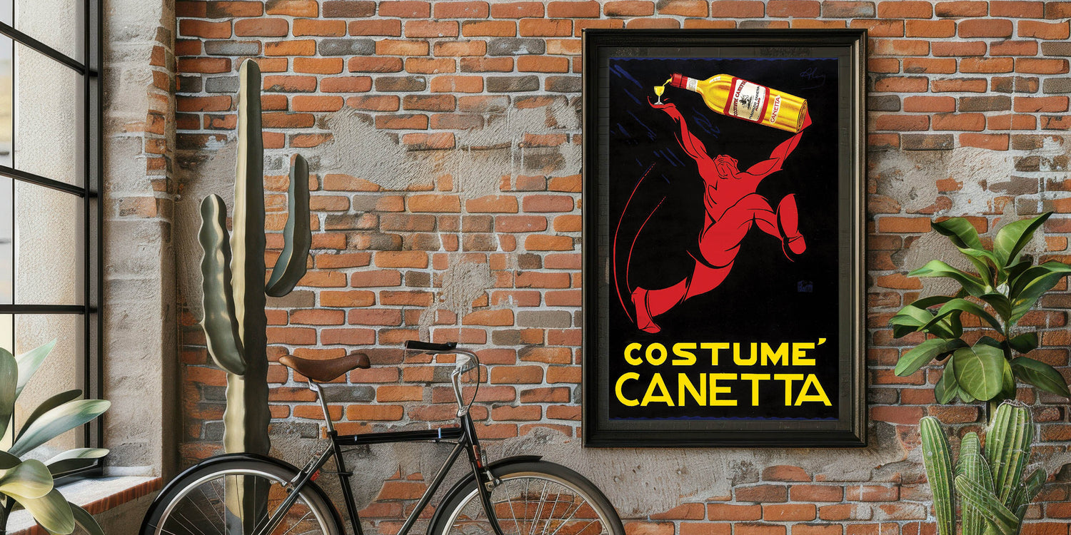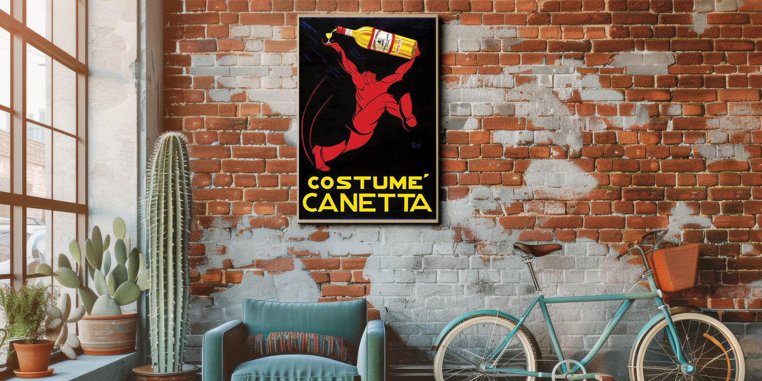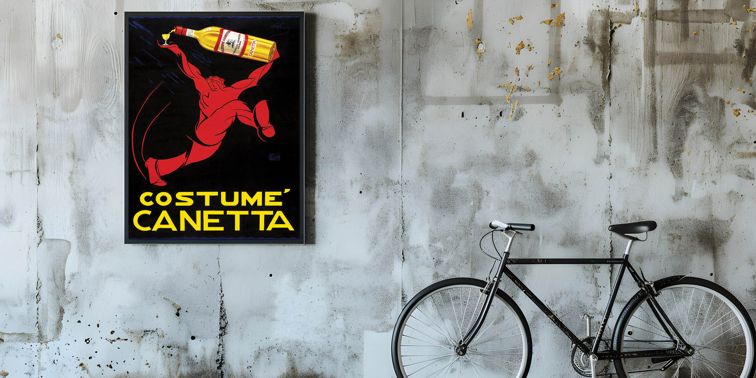 This bold and striking Vintage Costumé Canetta Poster is an iconic example of early 20th-century Italian advertising. Featuring a dynamic figure in red with a bottle of Costumé Canetta being poured into a glass, this piece embodies the elegance and energy of Italian spirit culture. The powerful imagery and vivid color contrast make this poster a standout addition to any collection or home bar.
