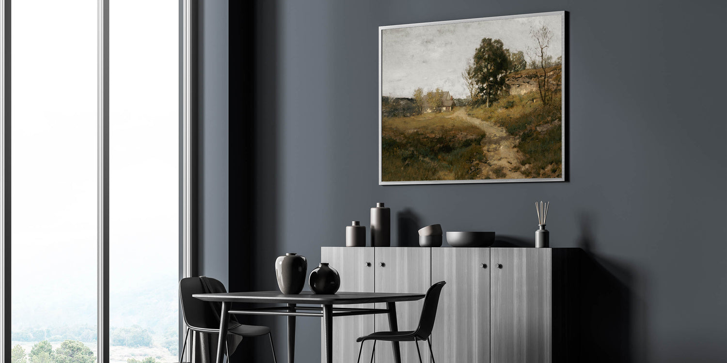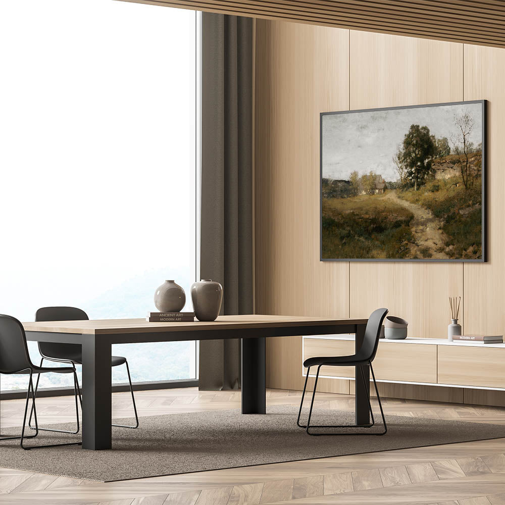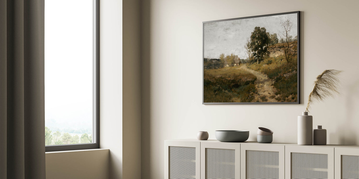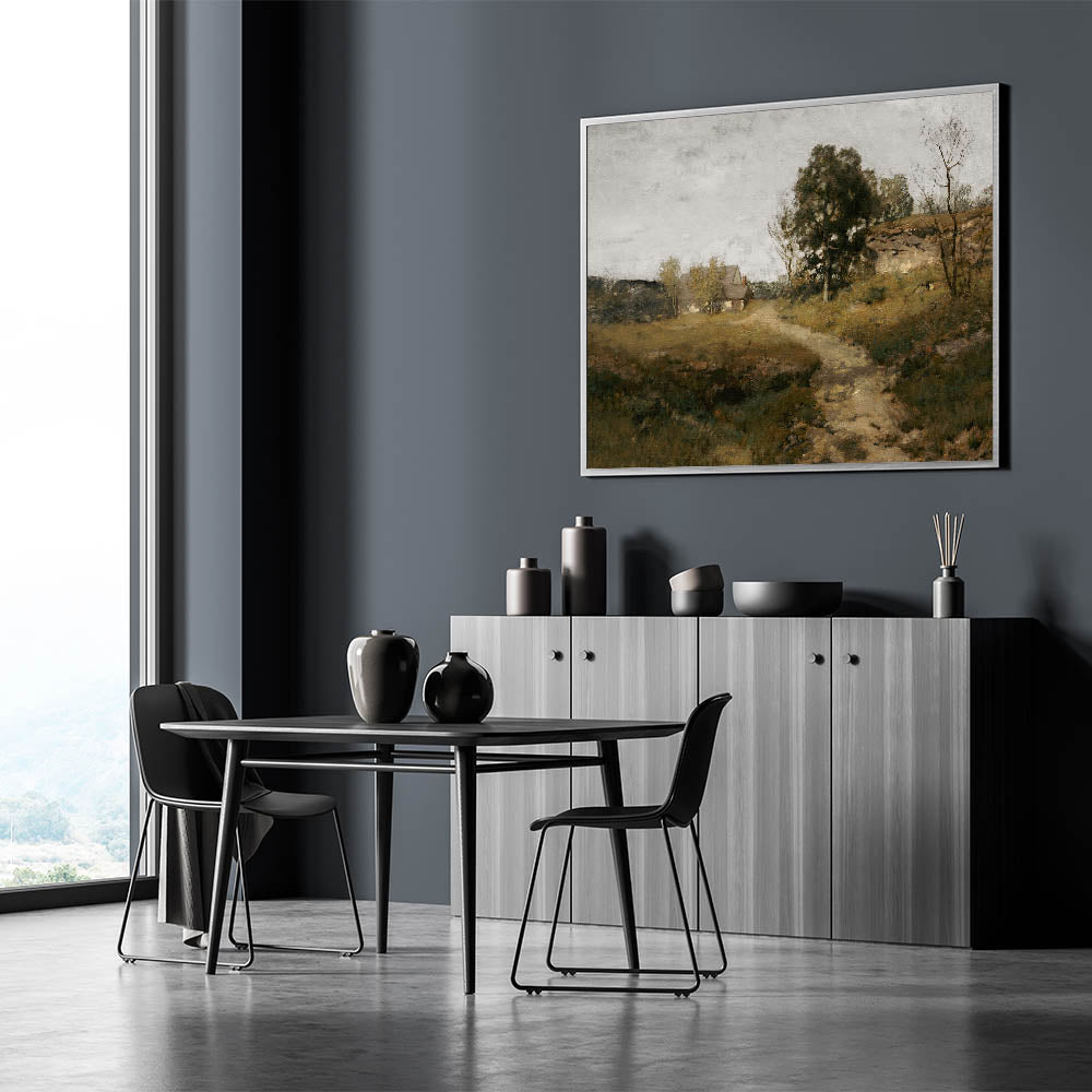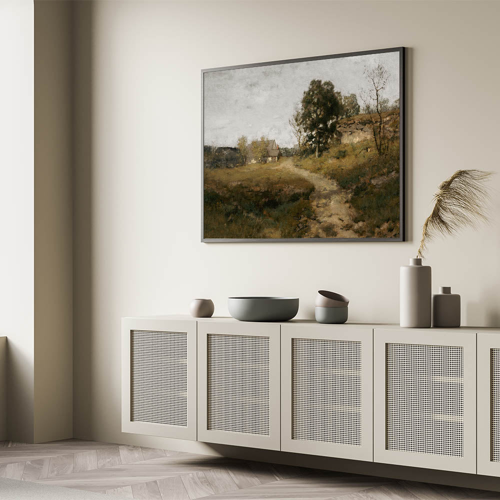 Immerse your space in the serene beauty of rural life with this vintage countryside landscape artwork. Featuring a quaint cottage nestled among trees, with a winding path leading into the distance, this piece captures the essence of peaceful country living. The soft, earthy tones and tranquil setting make this artwork an ideal choice for creating a calm and welcoming atmosphere in your home.