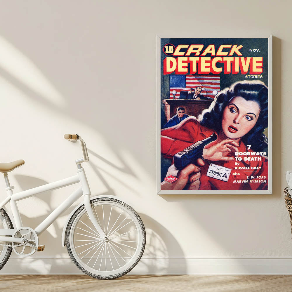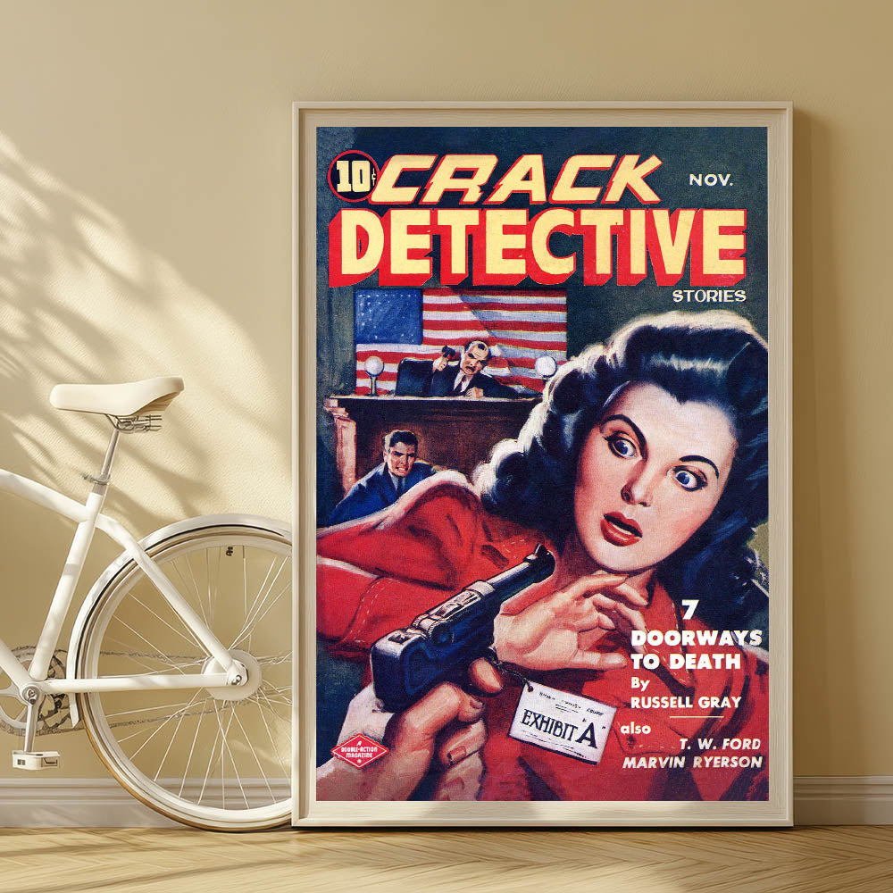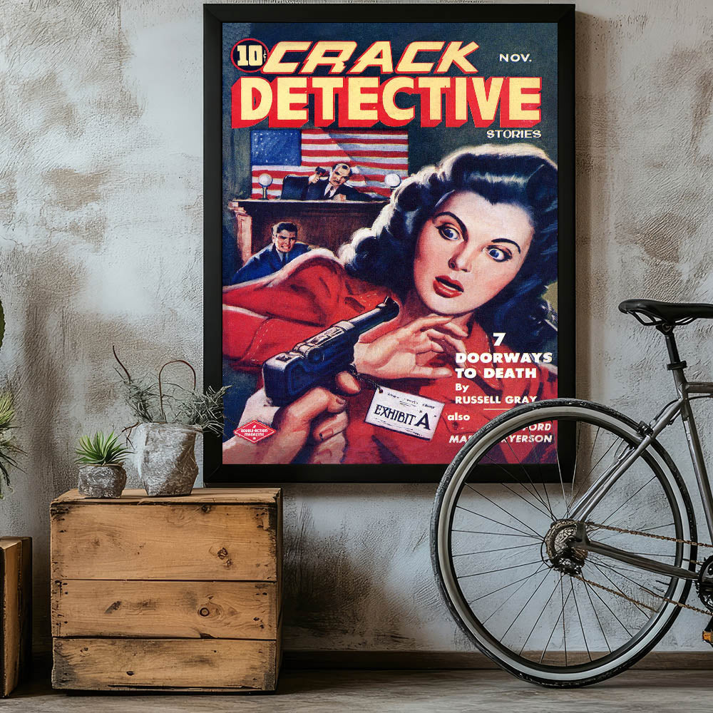 Step into the world of mystery and suspense with this Vintage Magazine Cover Art from Crack Detective Stories (November issue). Featuring an intense courtroom scene with a woman holding a revolver and a judge in action, this cover art perfectly captures the drama of the detective genre. The vibrant colors, including bold reds and yellows, make this retro magazine cover print a striking addition to any collection. Perfect for fans of nostalgic vintage decor prints or collectors of iconic magazine cover reproductions, this cover adds a thrilling touch to any room.
