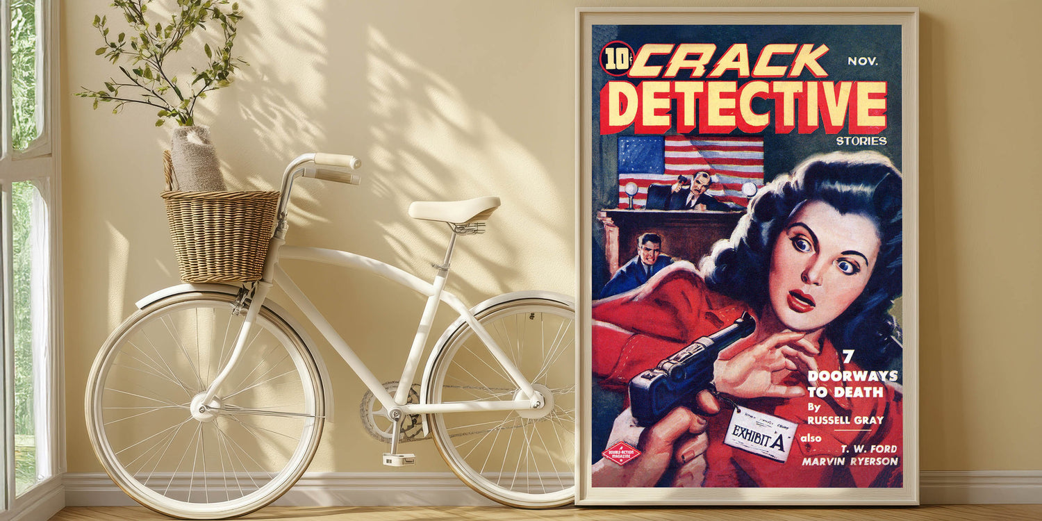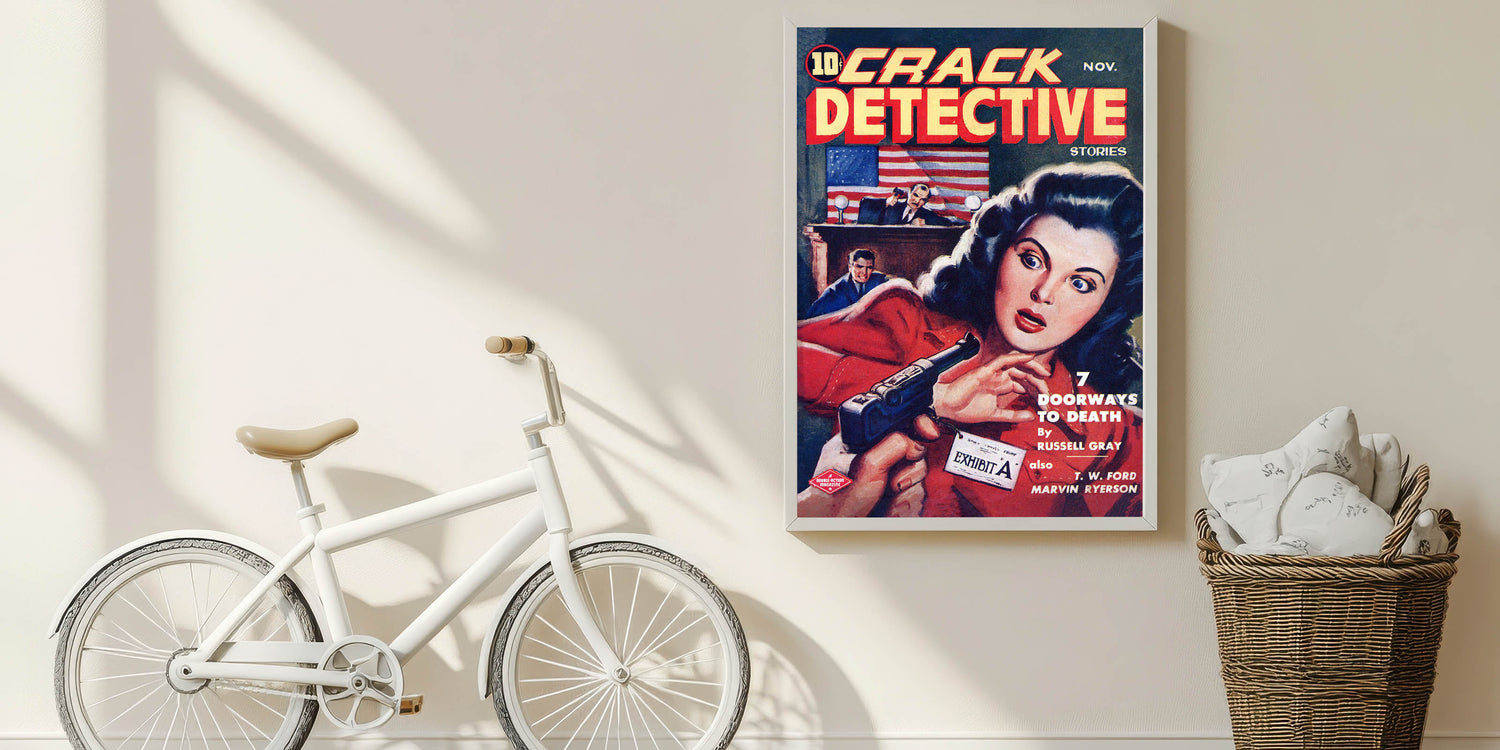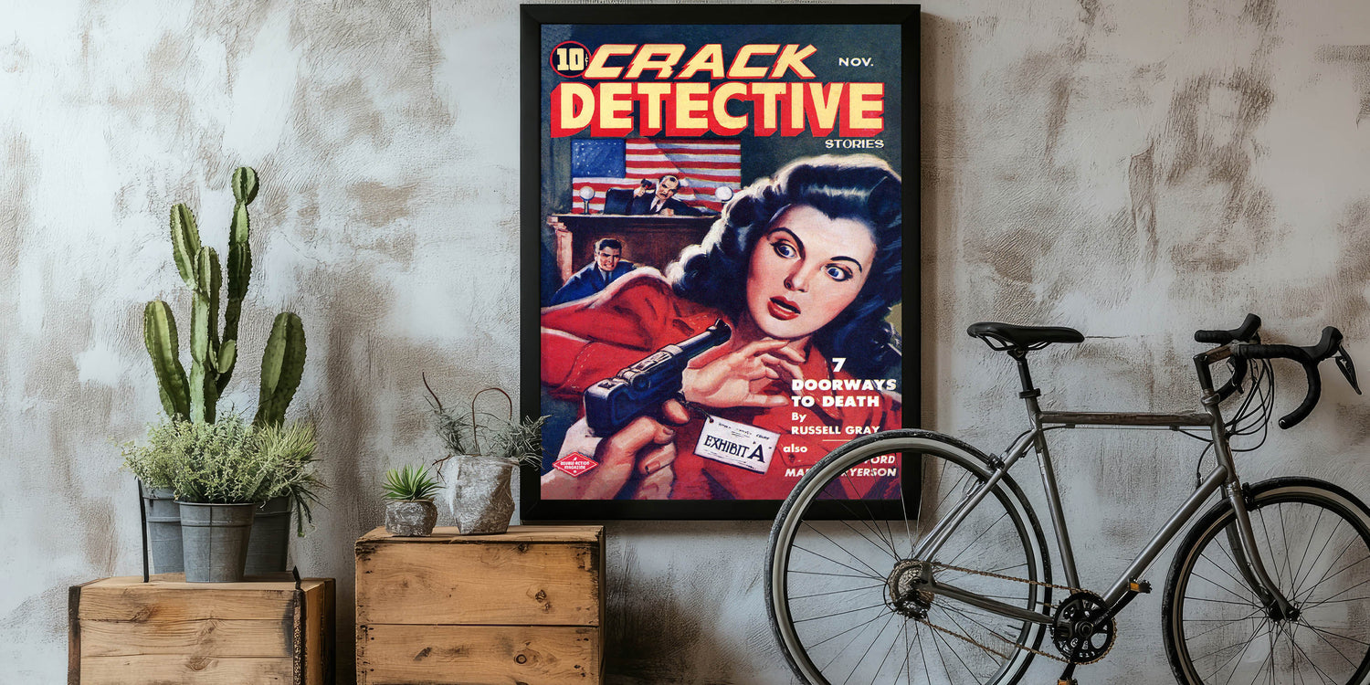 Step into the world of mystery and suspense with this Vintage Magazine Cover Art from Crack Detective Stories (November issue). Featuring an intense courtroom scene with a woman holding a revolver and a judge in action, this cover art perfectly captures the drama of the detective genre. The vibrant colors, including bold reds and yellows, make this retro magazine cover print a striking addition to any collection. Perfect for fans of nostalgic vintage decor prints or collectors of iconic magazine cover reproductions, this cover adds a thrilling touch to any room.