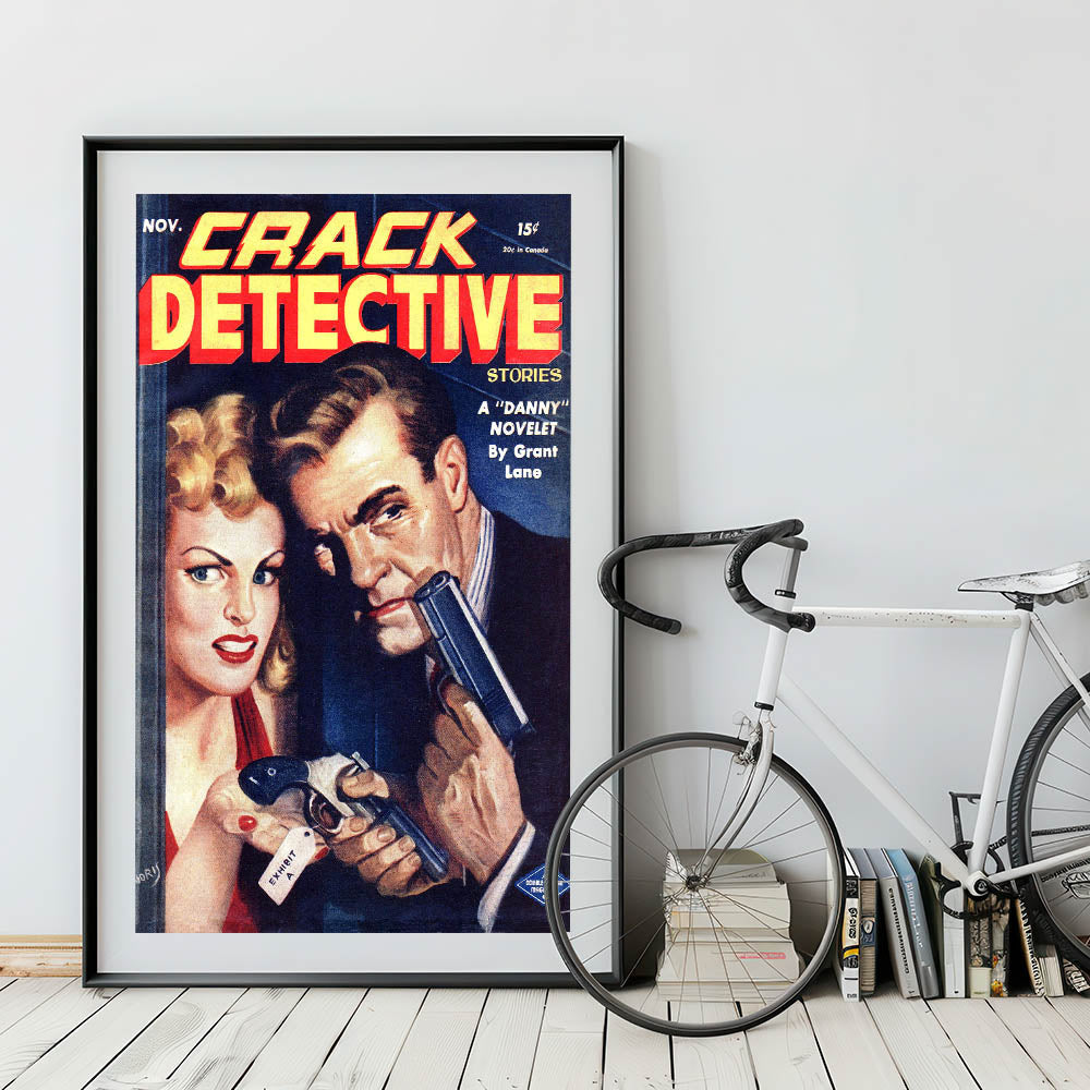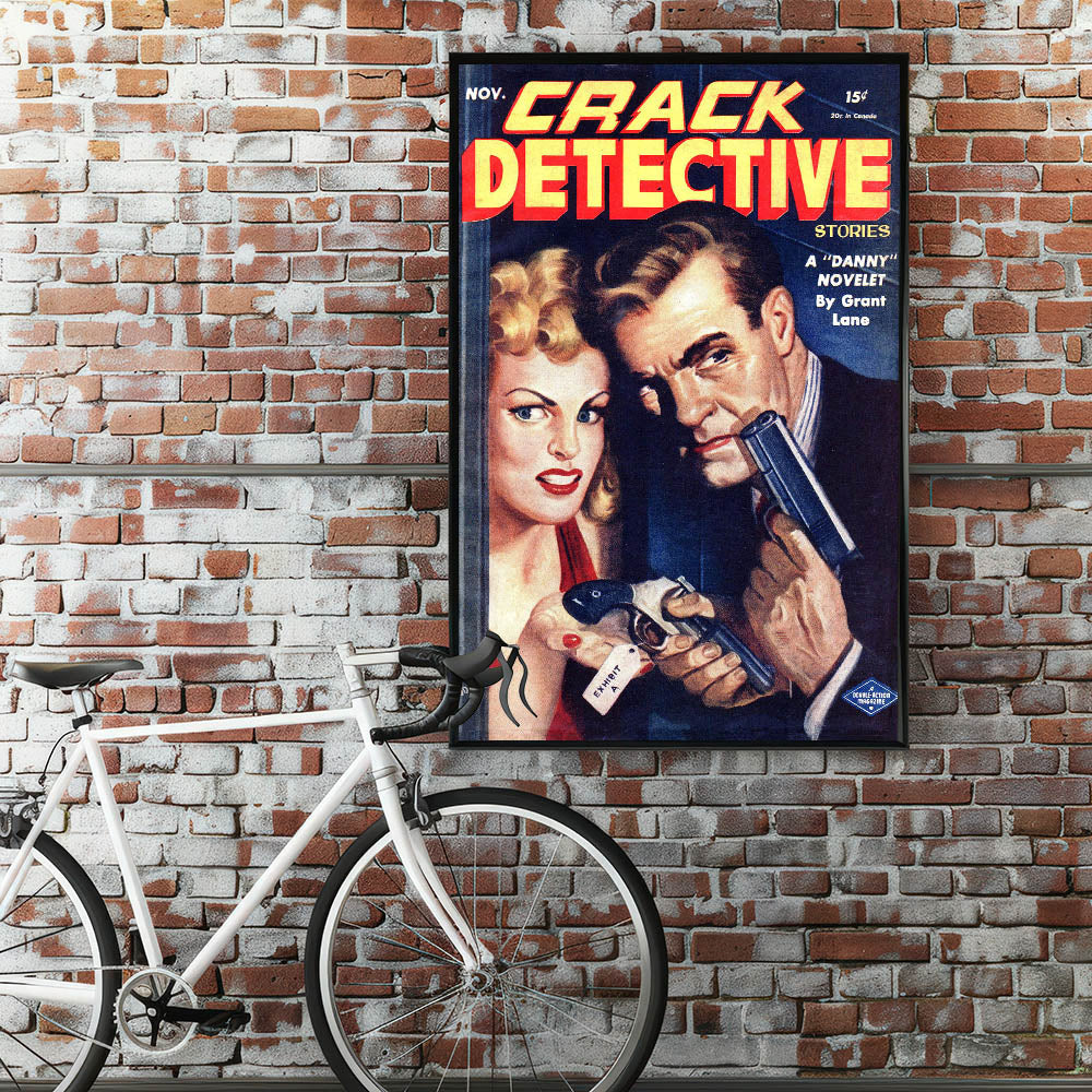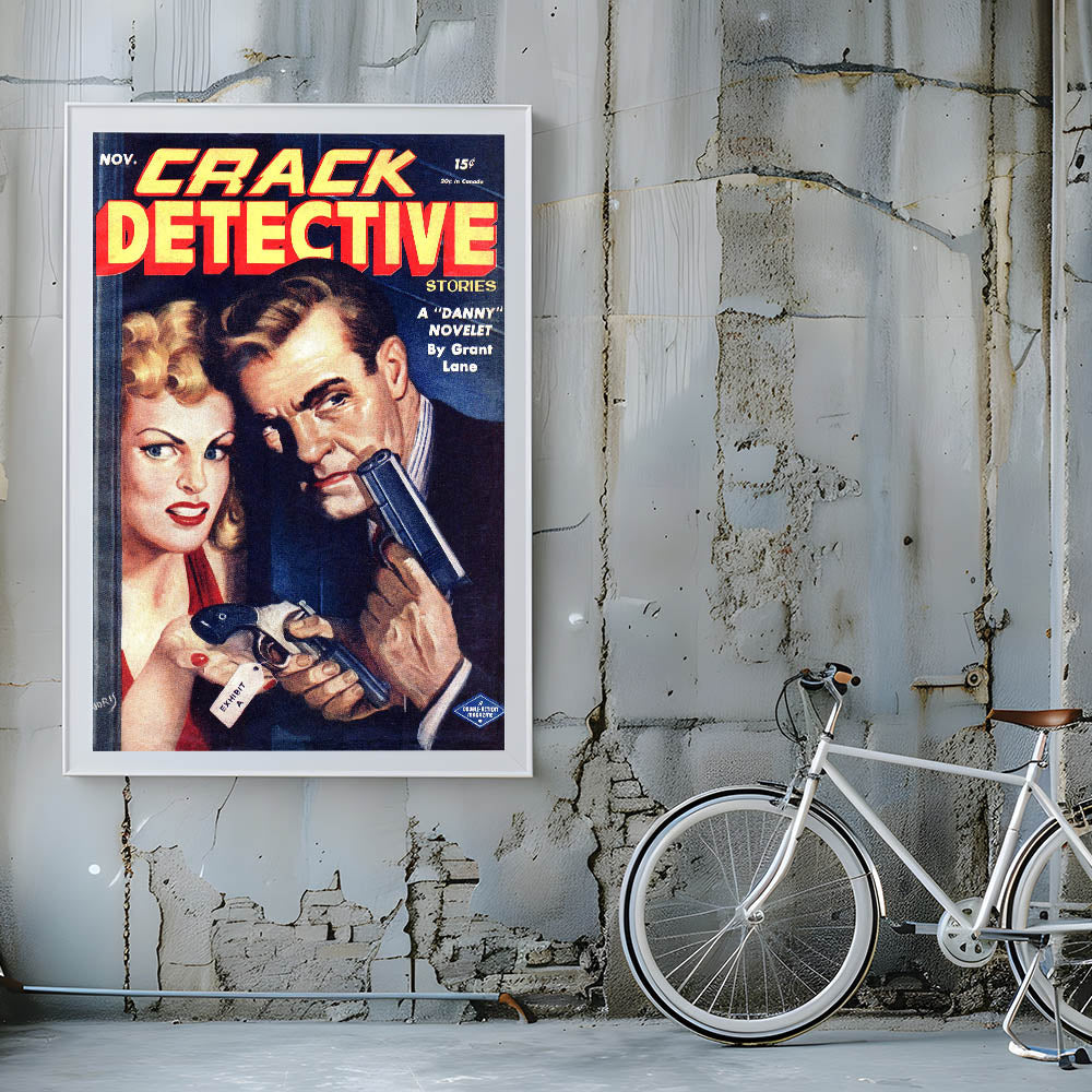 Step into the thrilling world of crime and suspense with this Vintage Magazine Cover Art from Crack Detective Stories (November issue). Featuring a dramatic scene with a woman and a man holding guns, this cover perfectly embodies the classic detective genre. The bold red and yellow title contrasts with the deep blues and shadows, enhancing the intensity of the moment. This retro magazine cover print is a must-have for collectors of nostalgic vintage decor prints or those seeking iconic magazine cover reproductions to complete their space.