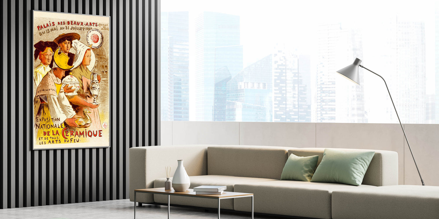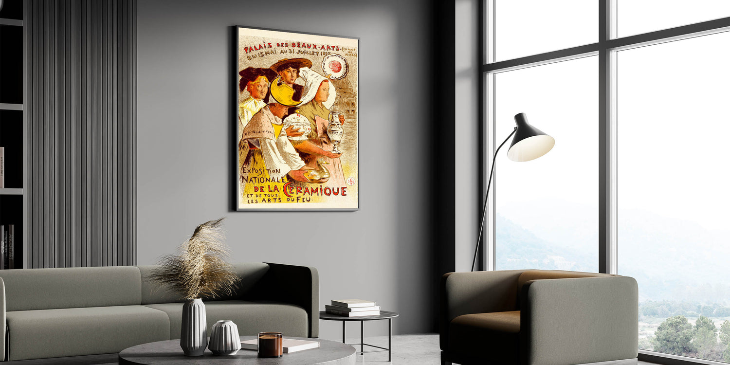 Celebrate the beauty of ceramics with this vintage exhibition poster for the Exposition Nationale de la Céramique held in 1897. Featuring elegant women holding exquisite ceramic pieces, this retro art print captures the artistry of the ceramic and pottery world during this historical exhibition. The use of vibrant colors and bold illustrations makes this piece a stunning addition to any collection.
