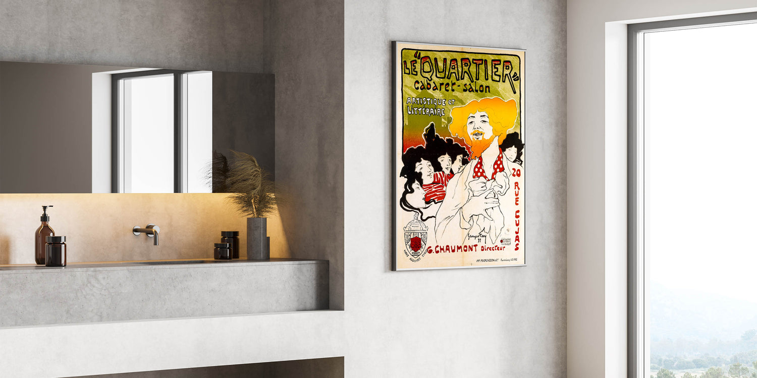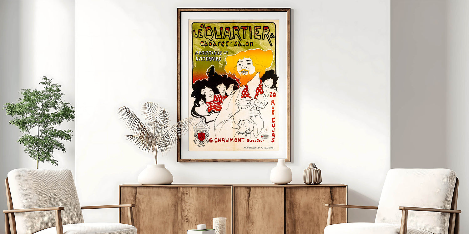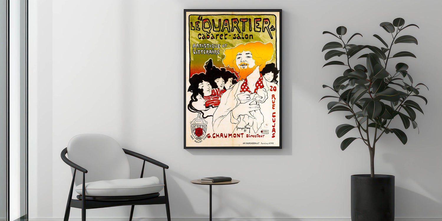 Capture the spirit of Parisian nightlife with this vintage exhibition poster for Le Quartier Cabaret-Salon. This retro art print from 1897 showcases the lively atmosphere of a literary and artistic salon, bringing together iconic figures from the late 19th century. Featuring bold colors and striking imagery, this nostalgic wall décor evokes the energy and creativity of Parisian bohemia.
