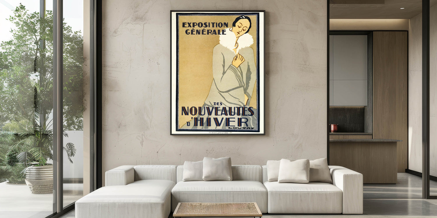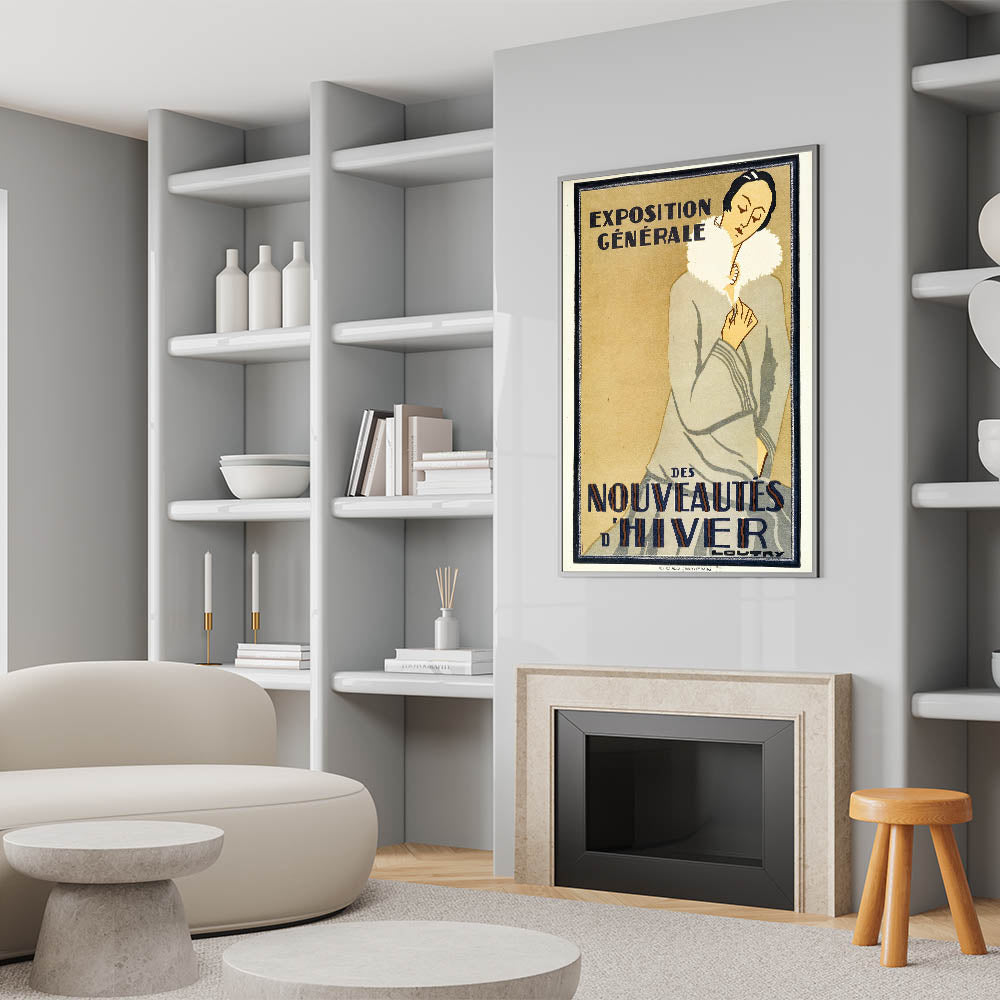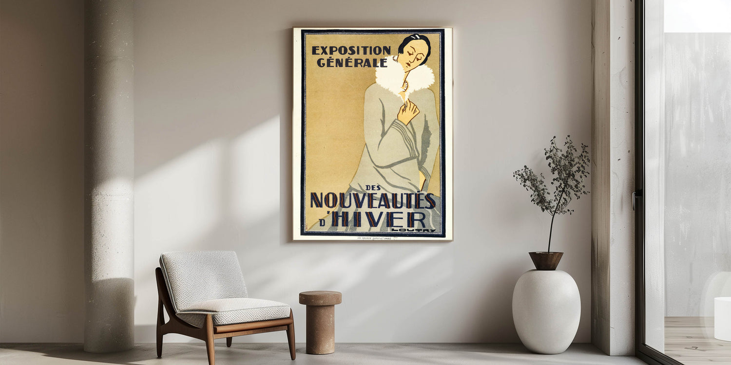 Embrace the elegance of winter fashion with this vintage exhibition poster for the Exposition Générale des Nouveautés d'Hiver. Featuring a chic woman in a winter coat, this retro art print captures the sophistication of 1920s Paris fashion. The clean lines, soft colors, and refined style of the piece make it a timeless addition to any collection.