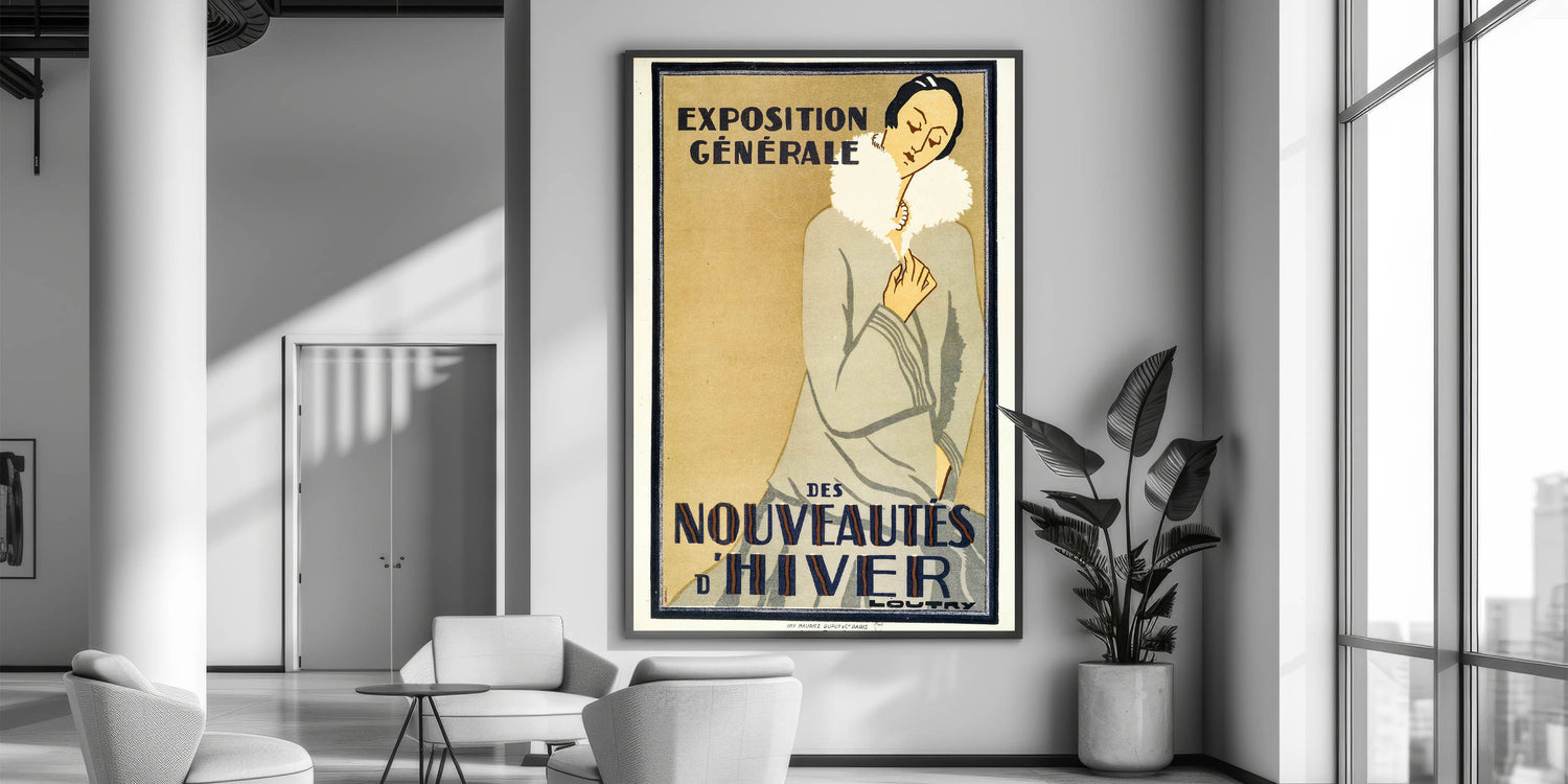This vintage art exhibition poster is a beautiful representation of the Nouveautés d'Hiver event, offering a glimpse into the world of winter fashion from the early 20th century. Whether you're a collector of historical exhibition prints or someone who appreciates the elegance of classic poster designs, this piece will elevate your décor.