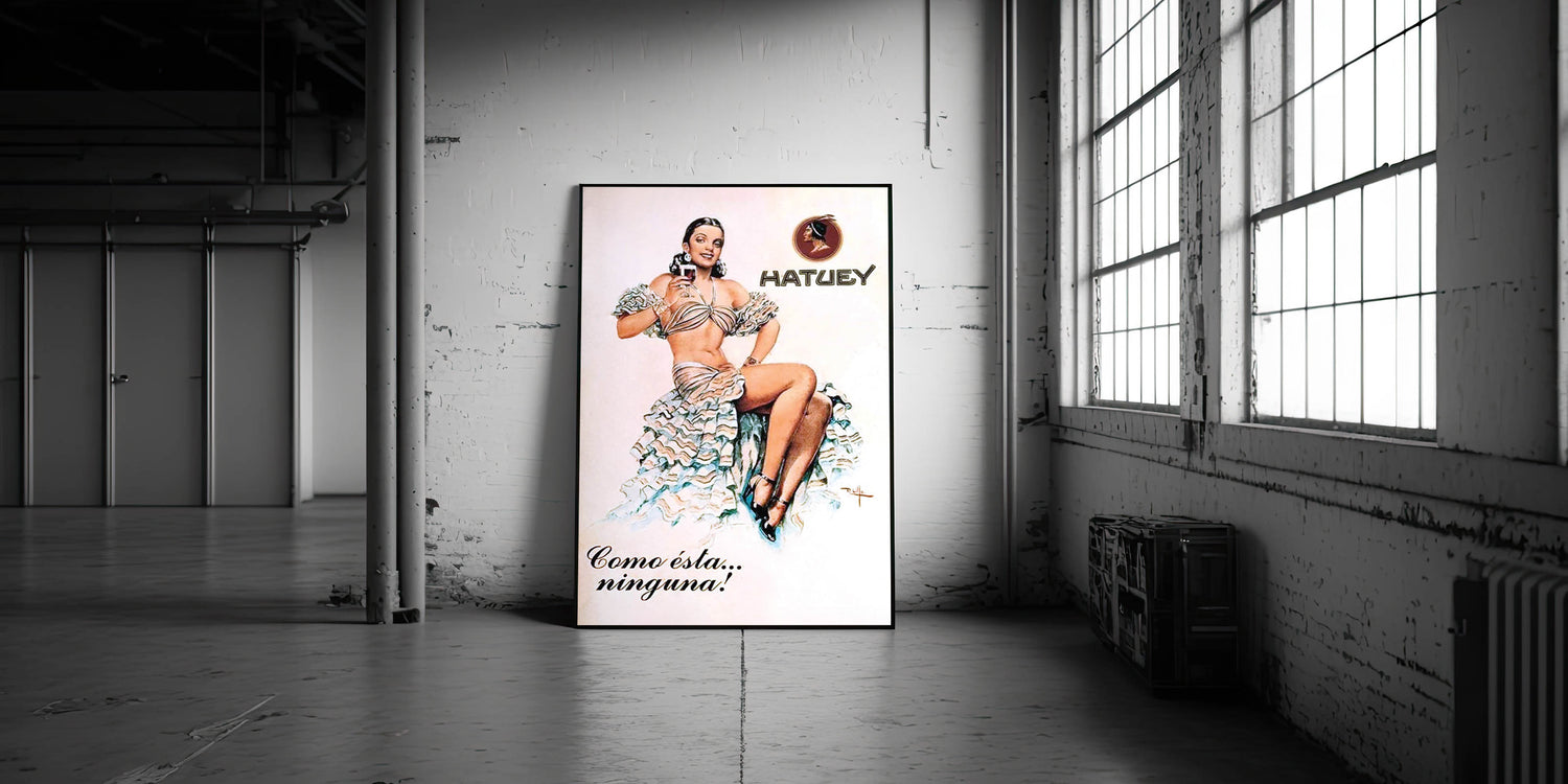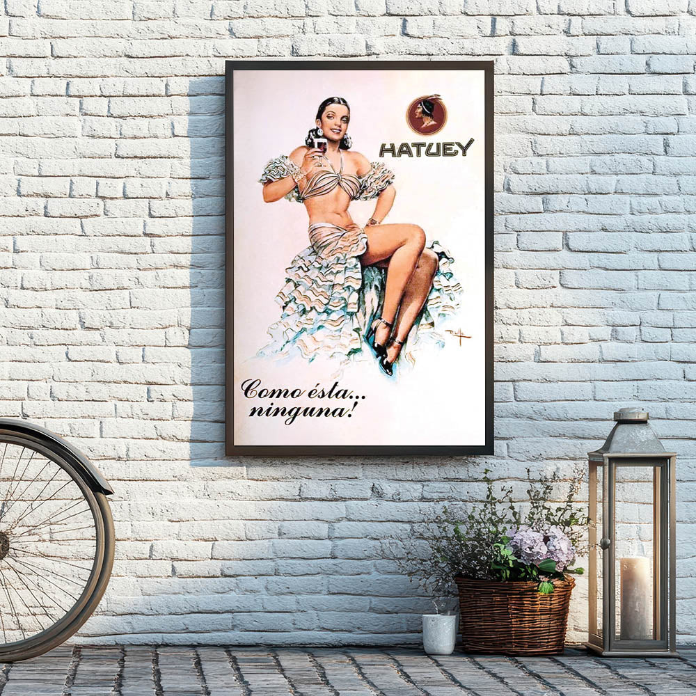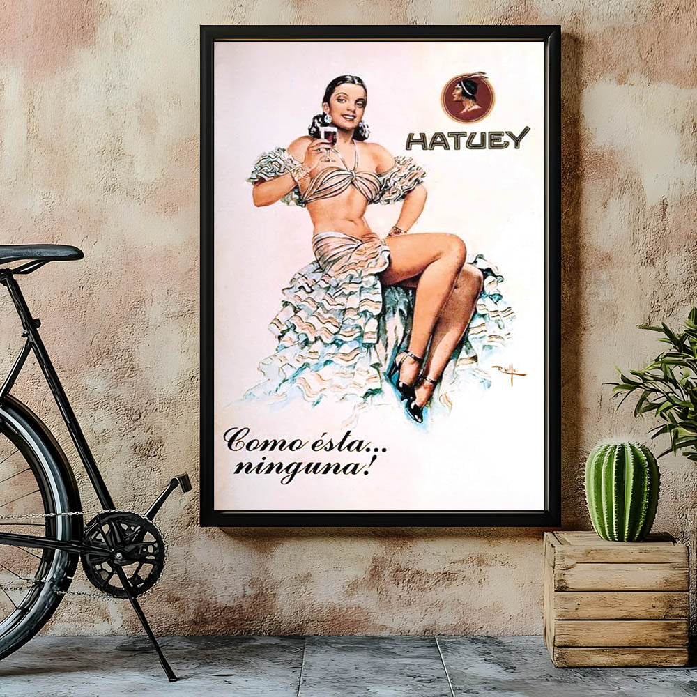 Add a touch of classic Cuban charm to your space with this Vintage Hatuey Advertising Poster. Featuring a vibrant depiction of a woman in a glamorous ruffled dress holding a glass of Hatuey beer, this nostalgic advertising print perfectly captures the allure of vintage Cuban advertising. The playful tagline, "Como ésta...ninguna!" (None like this!), adds a fun, unforgettable flair to this iconic piece.