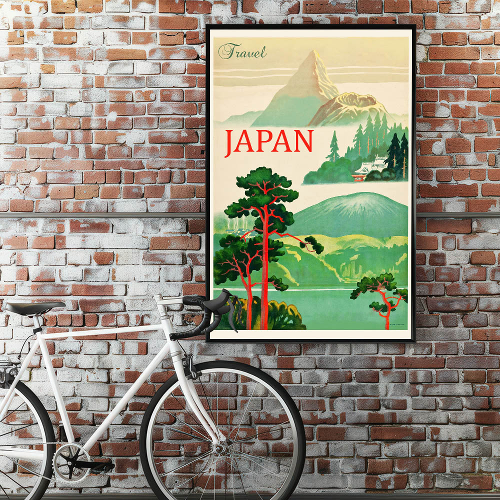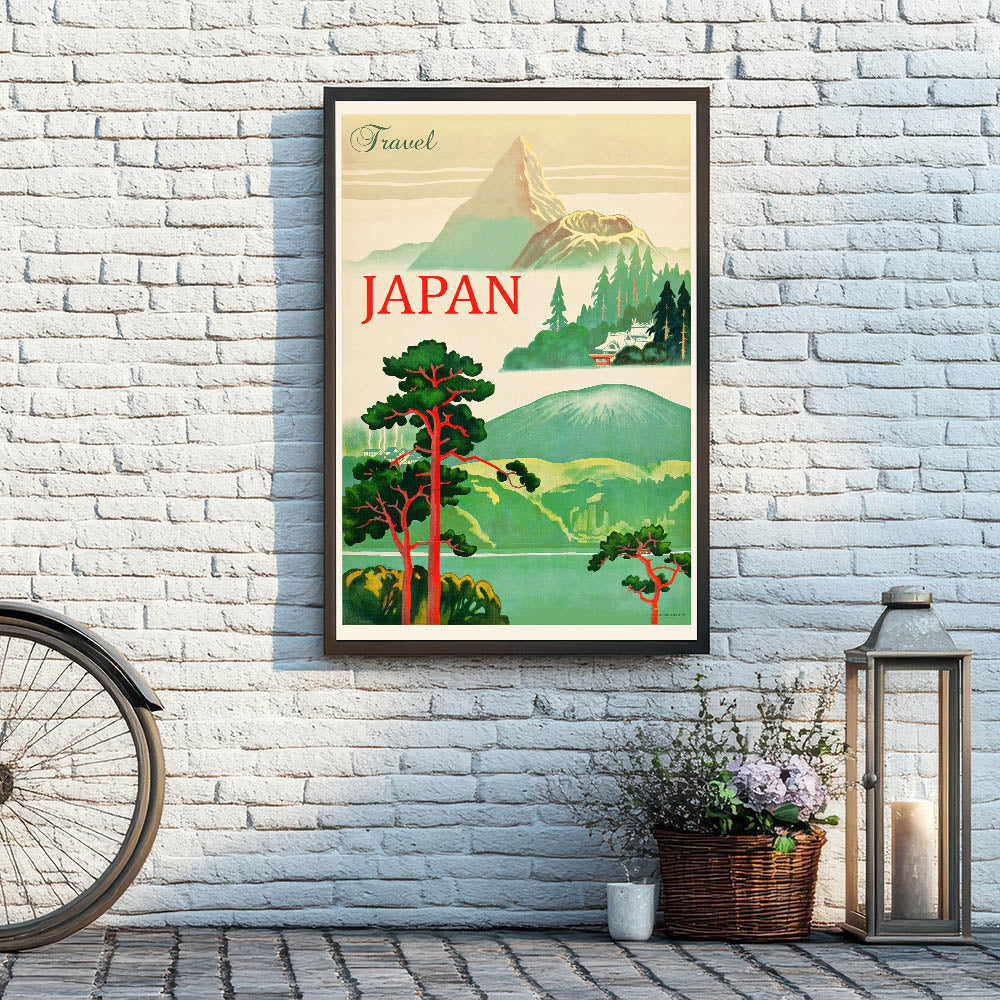 Immerse yourself in the tranquil beauty of Japan with this stunning vintage travel poster featuring the majestic Mount Fuji and lush surrounding landscapes. The vibrant green and earthy tones, along with the iconic red-tipped pine trees, create a striking contrast against the soft misty background. This retro art print showcases the peaceful harmony of nature, with traditional Japanese elements such as the pagoda nestled among the hills and mist, capturing the serene beauty of rural Japan.