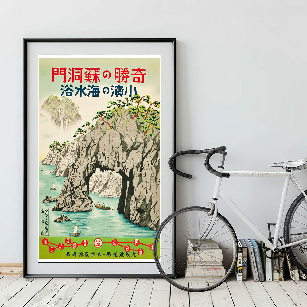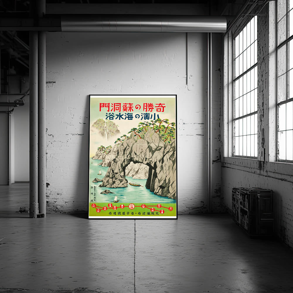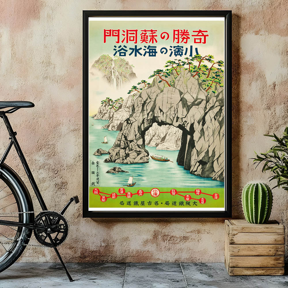 Transport yourself to the tranquil beauty of Japan’s coastal landscape with this vintage travel poster. Featuring a scenic view of dramatic rock formations, a boat gliding through calm waters, and lush greenery, this retro art print captures the essence of Japan’s natural wonders. The soft pastel hues and traditional Japanese artwork style bring this serene view to life, evoking the peaceful charm of the country’s coastal regions.