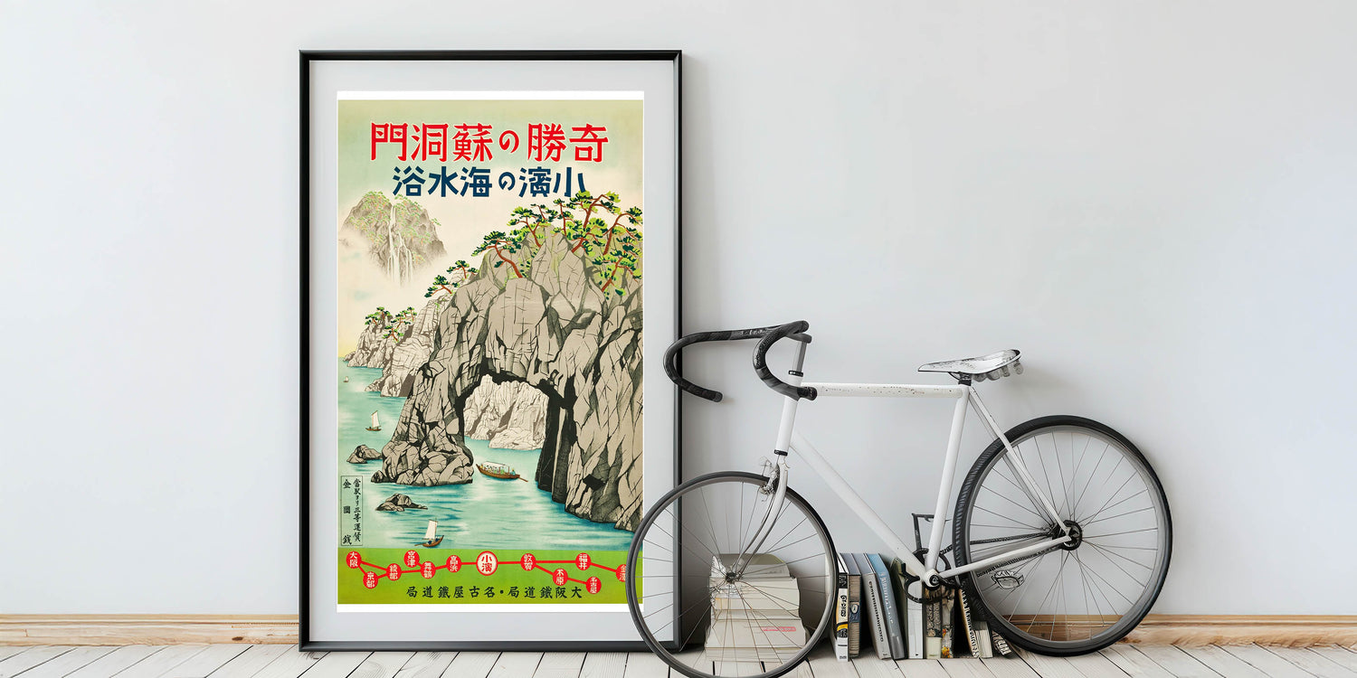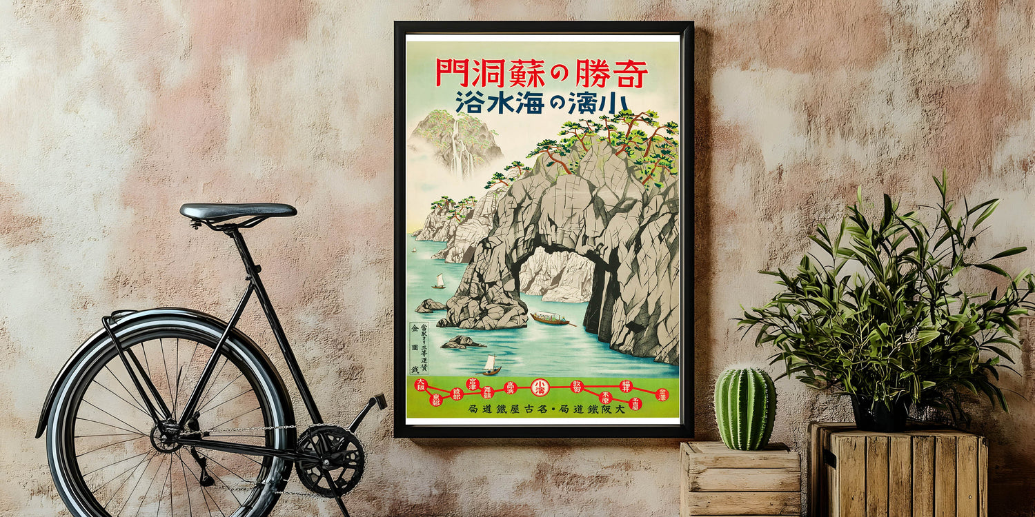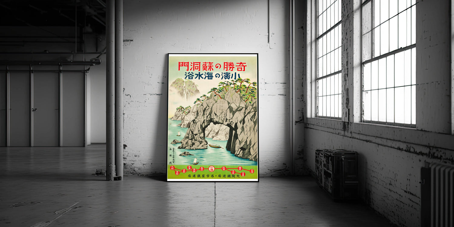 Transport yourself to the tranquil beauty of Japan’s coastal landscape with this vintage travel poster. Featuring a scenic view of dramatic rock formations, a boat gliding through calm waters, and lush greenery, this retro art print captures the essence of Japan’s natural wonders. The soft pastel hues and traditional Japanese artwork style bring this serene view to life, evoking the peaceful charm of the country’s coastal regions.