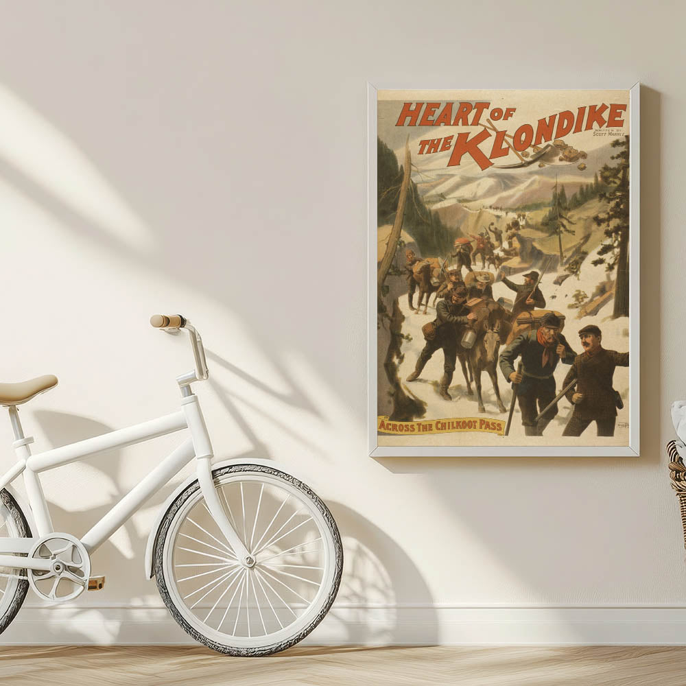 Journey into the past with this Vintage Klondike Travel Poster, inspired by the adventurous spirit of the Gold Rush. Featuring rugged prospectors crossing the snowy Chilkoot Pass with mules and packs, this retro travel print captures the determination and hope of those seeking fortune in the heart of the Klondike. The warm tones of brown, beige, and muted green, combined with detailed illustrations, make it a perfect piece for fans of classic travel decor and authentic vintage travel art.