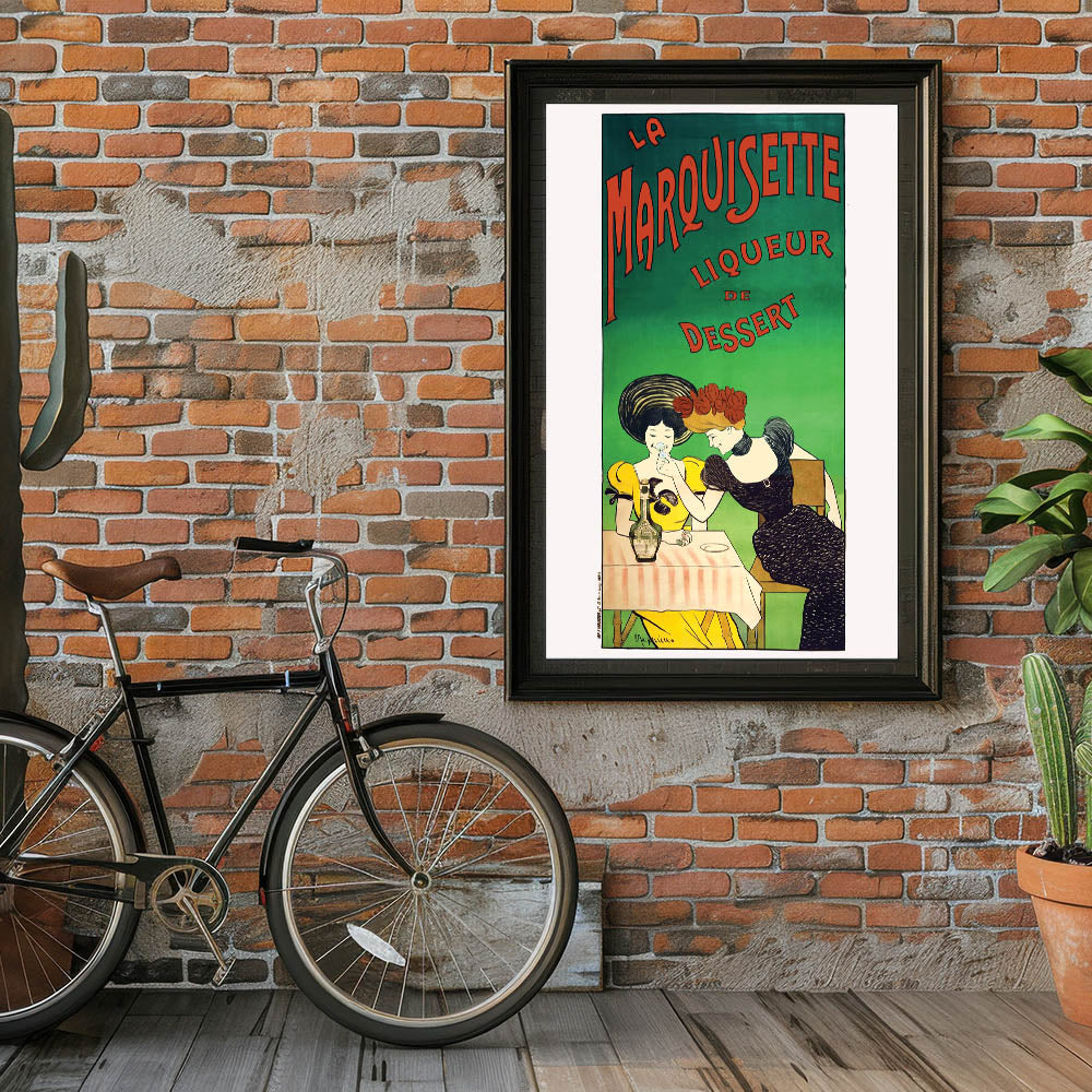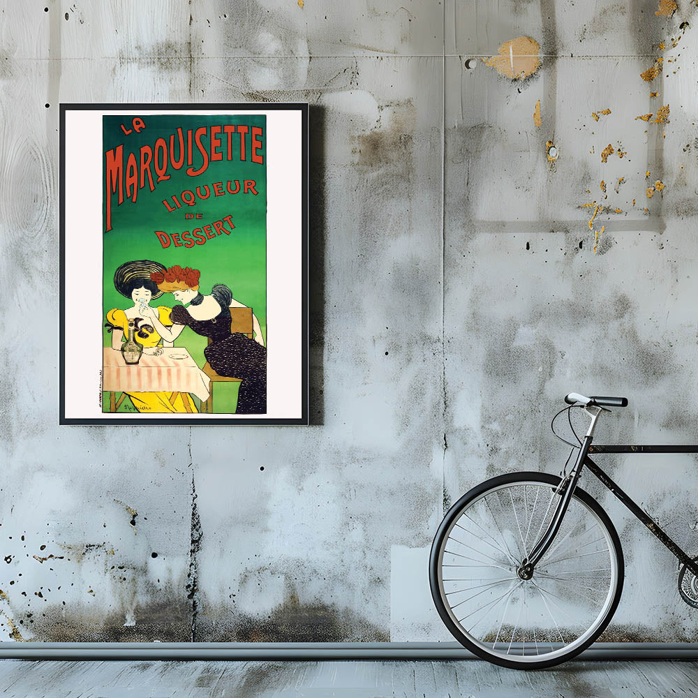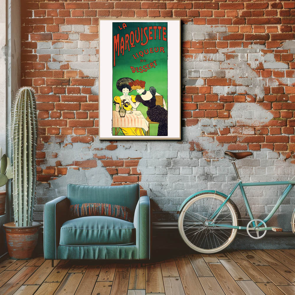 Add a touch of French elegance to your space with this Vintage La Marquisette Liqueur Advertising Poster. Featuring two stylish women enjoying a glass of the famous liqueur de dessert, this charming design captures the playful and sophisticated vibe of vintage-inspired wall art. The soft pastel colors and bold typography make this piece a standout addition to any room.