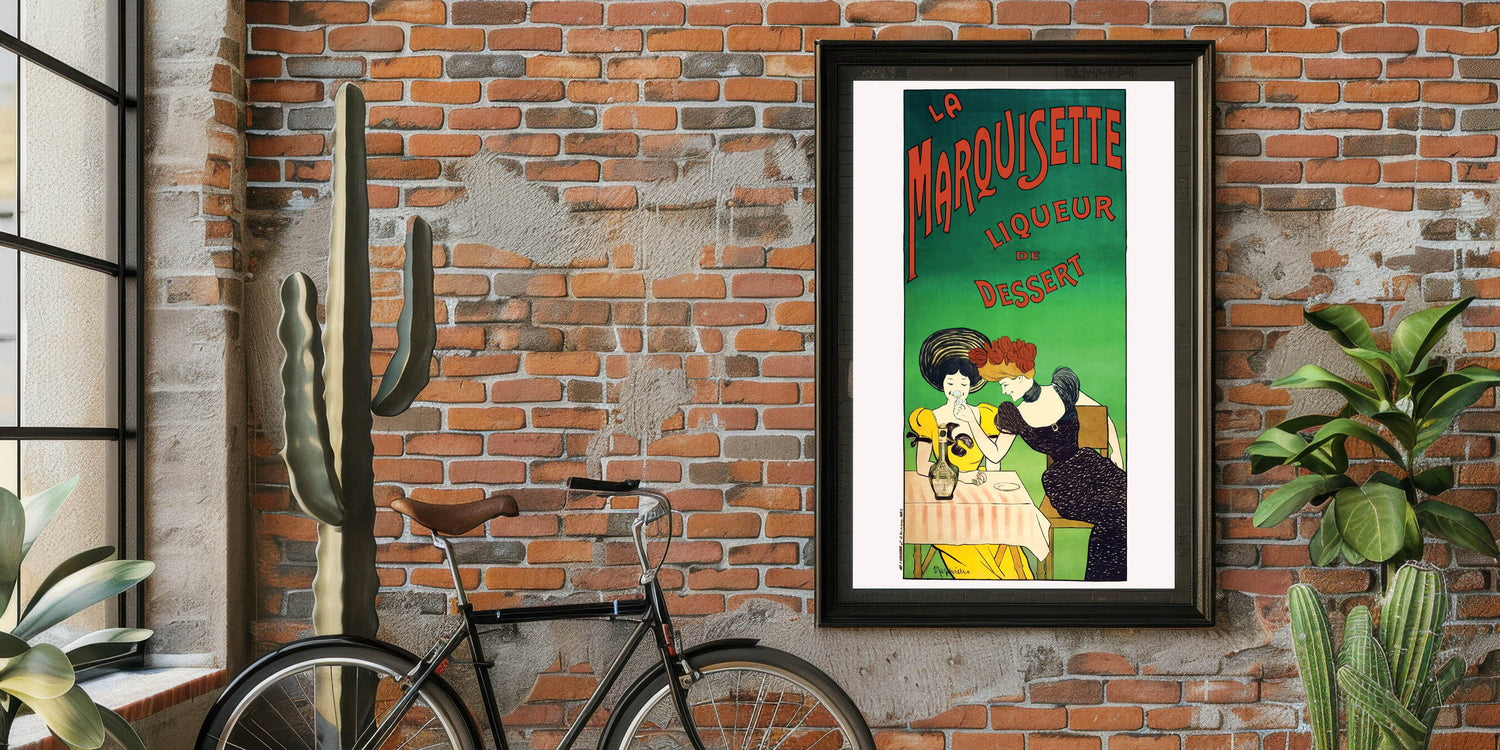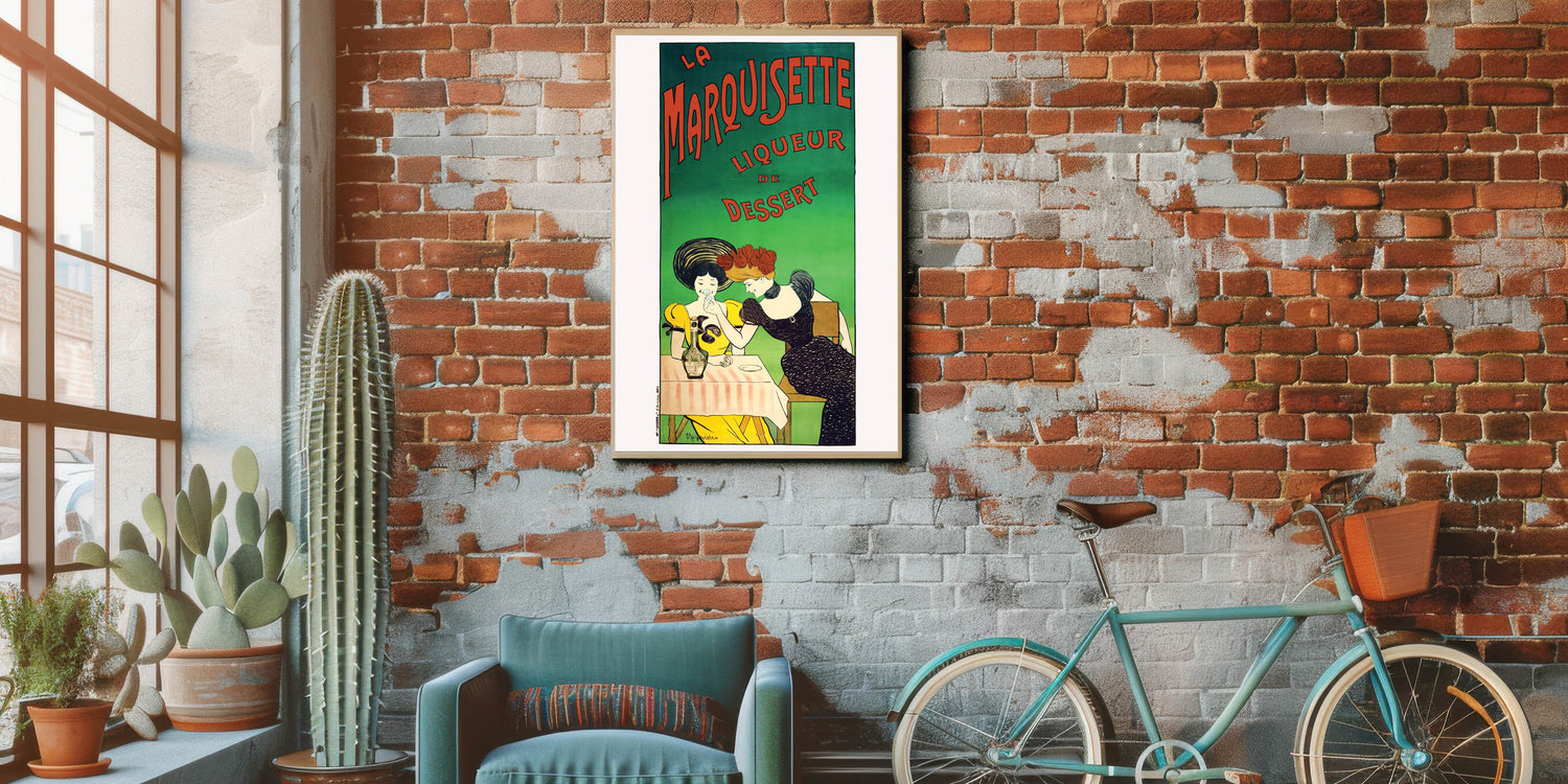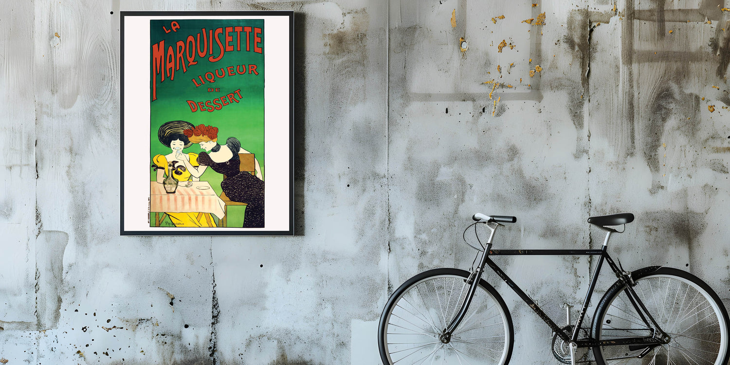 Add a touch of French elegance to your space with this Vintage La Marquisette Liqueur Advertising Poster. Featuring two stylish women enjoying a glass of the famous liqueur de dessert, this charming design captures the playful and sophisticated vibe of vintage-inspired wall art. The soft pastel colors and bold typography make this piece a standout addition to any room.