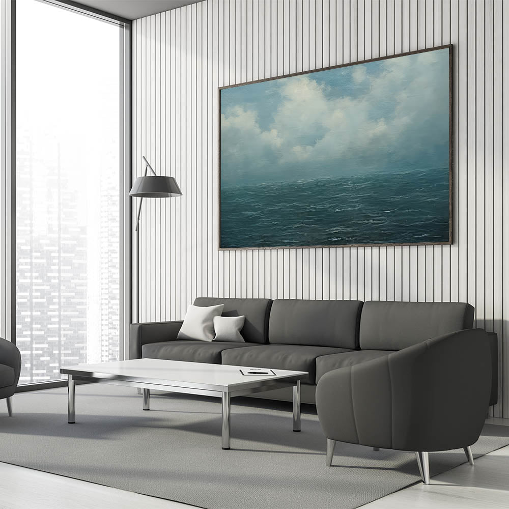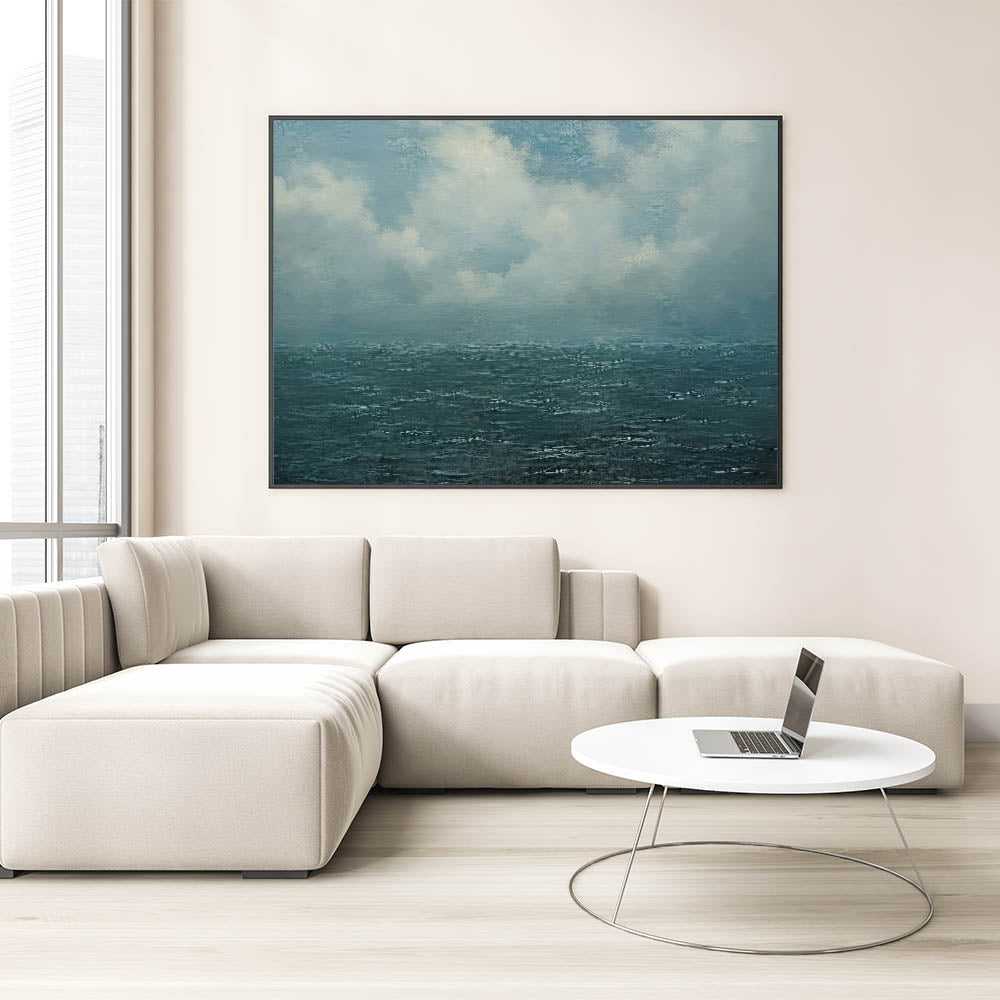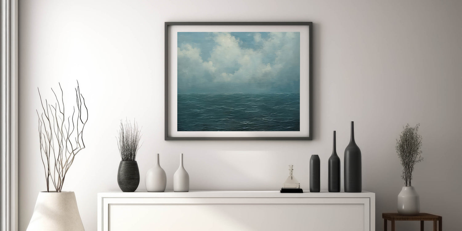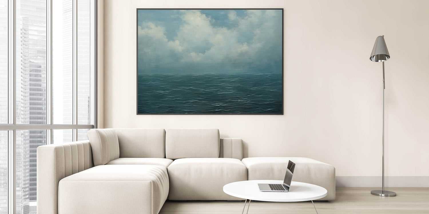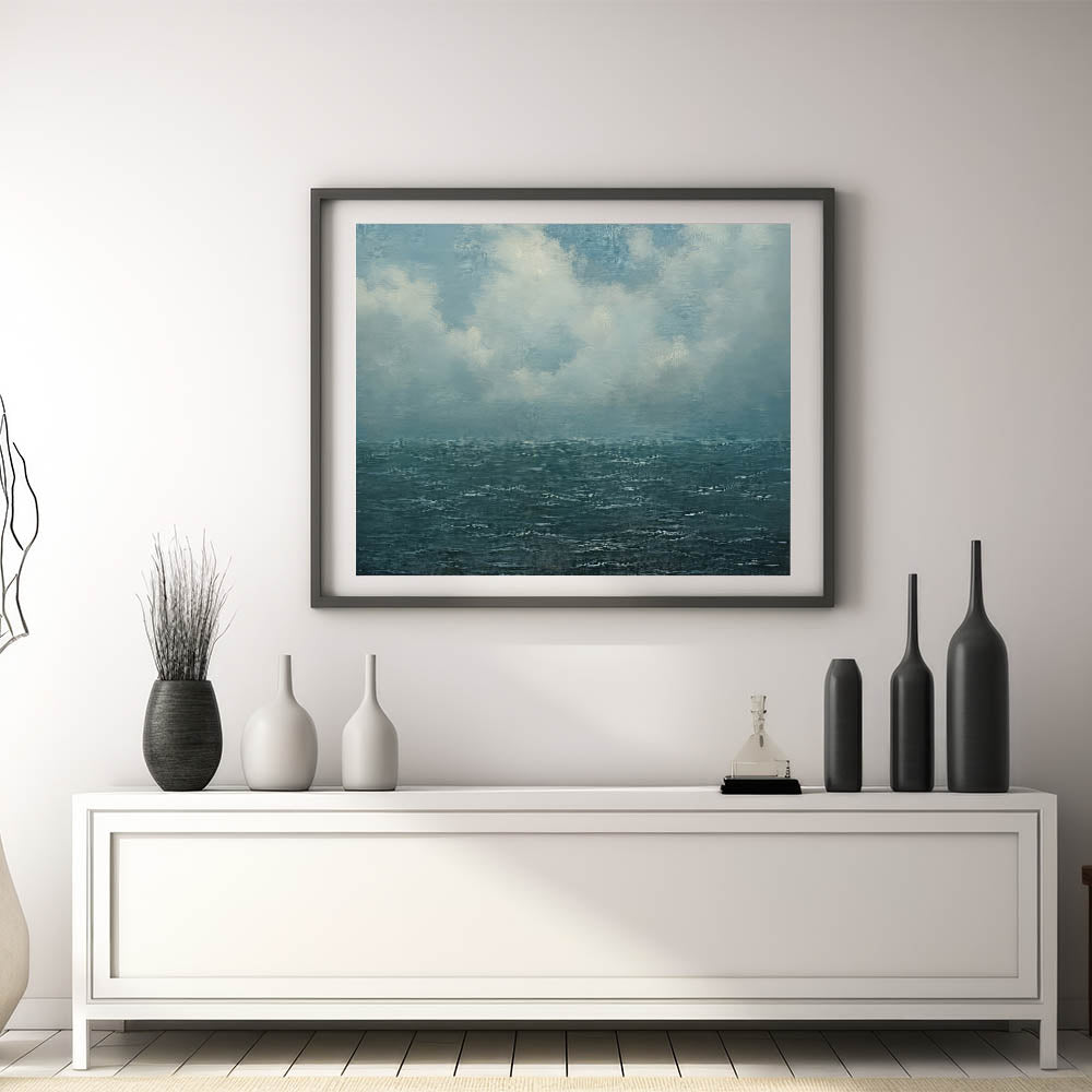 Invite tranquility into your home with this vintage landscape art, capturing the serene beauty of a calm ocean under a vast, cloudy sky. The soft blues and gentle waves create a peaceful atmosphere, making this piece perfect for anyone who appreciates the soothing presence of the sea. This artwork evokes the timeless elegance of nature’s beauty and is ideal for vintage-inspired decor.
