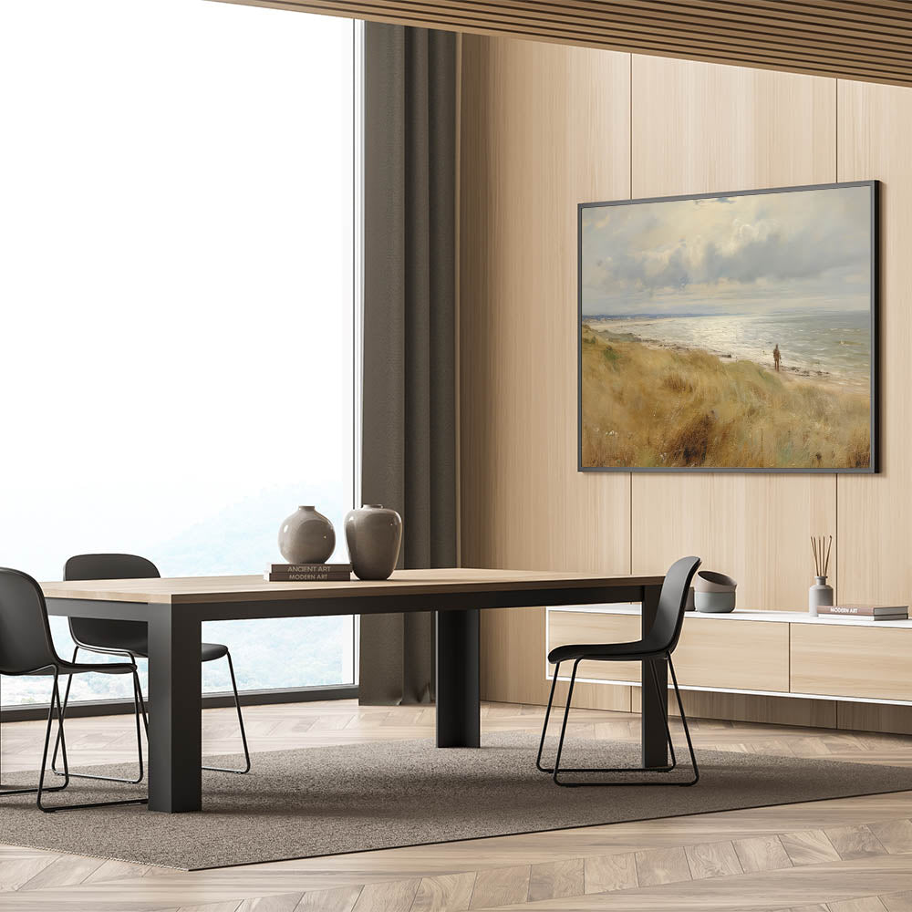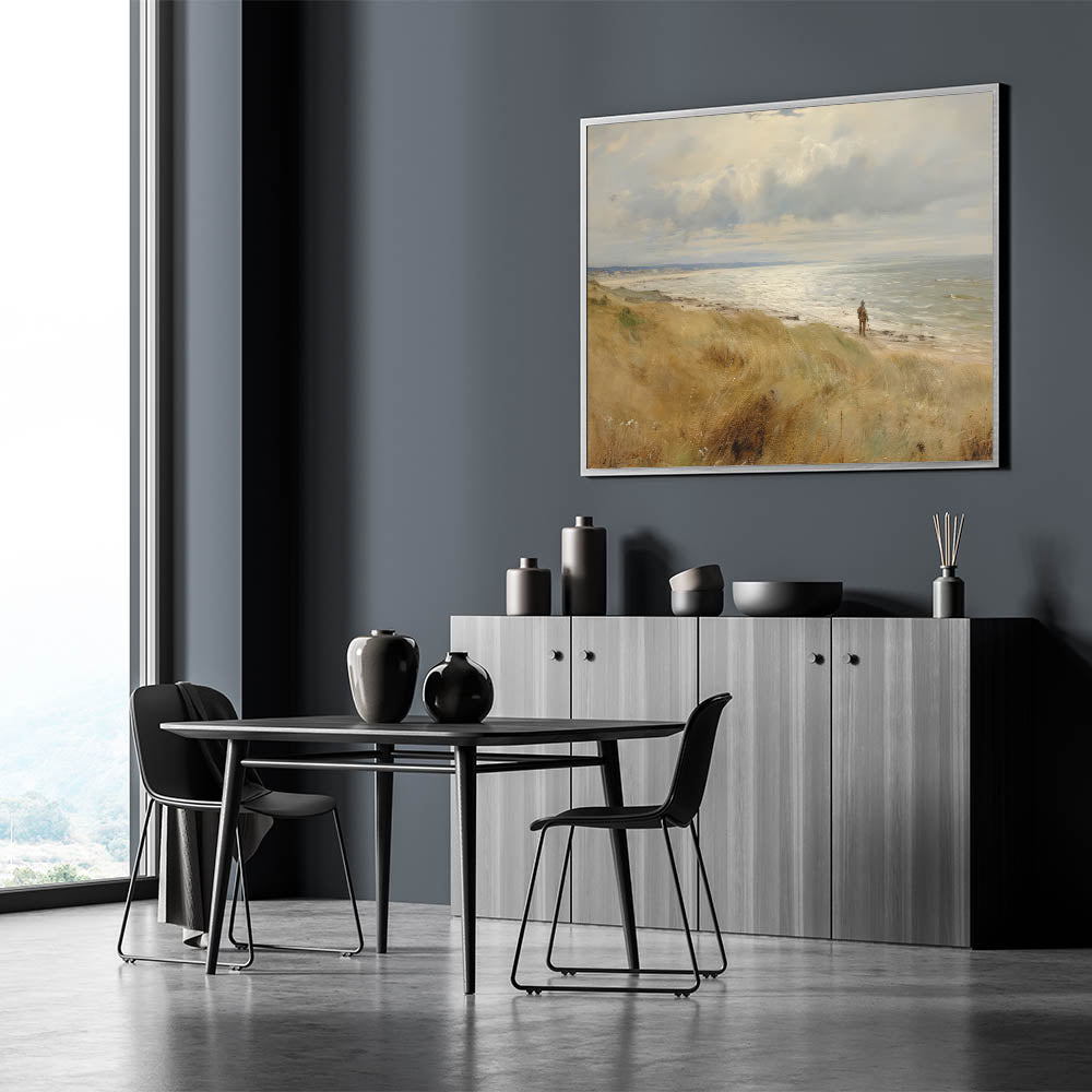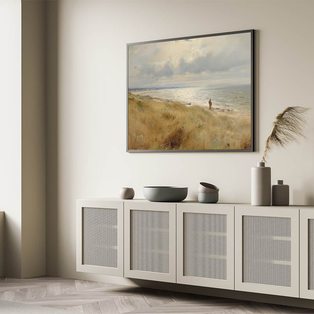 This vintage landscape art captures the beauty of a peaceful coastal beach scene, where a solitary figure strolls along the shoreline, taking in the serene ocean view. The soft waves of the sea meet the golden grasses of the dunes, creating a harmonious blend of nature's elements. With a soft color palette of blues, golds, and greens, this piece evokes a sense of tranquility, perfect for adding a calm, nostalgic vibe to your home decor.