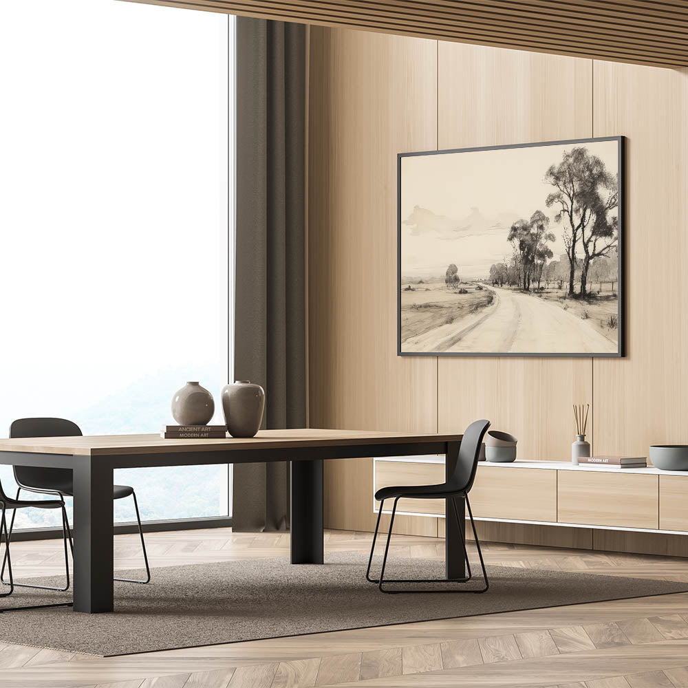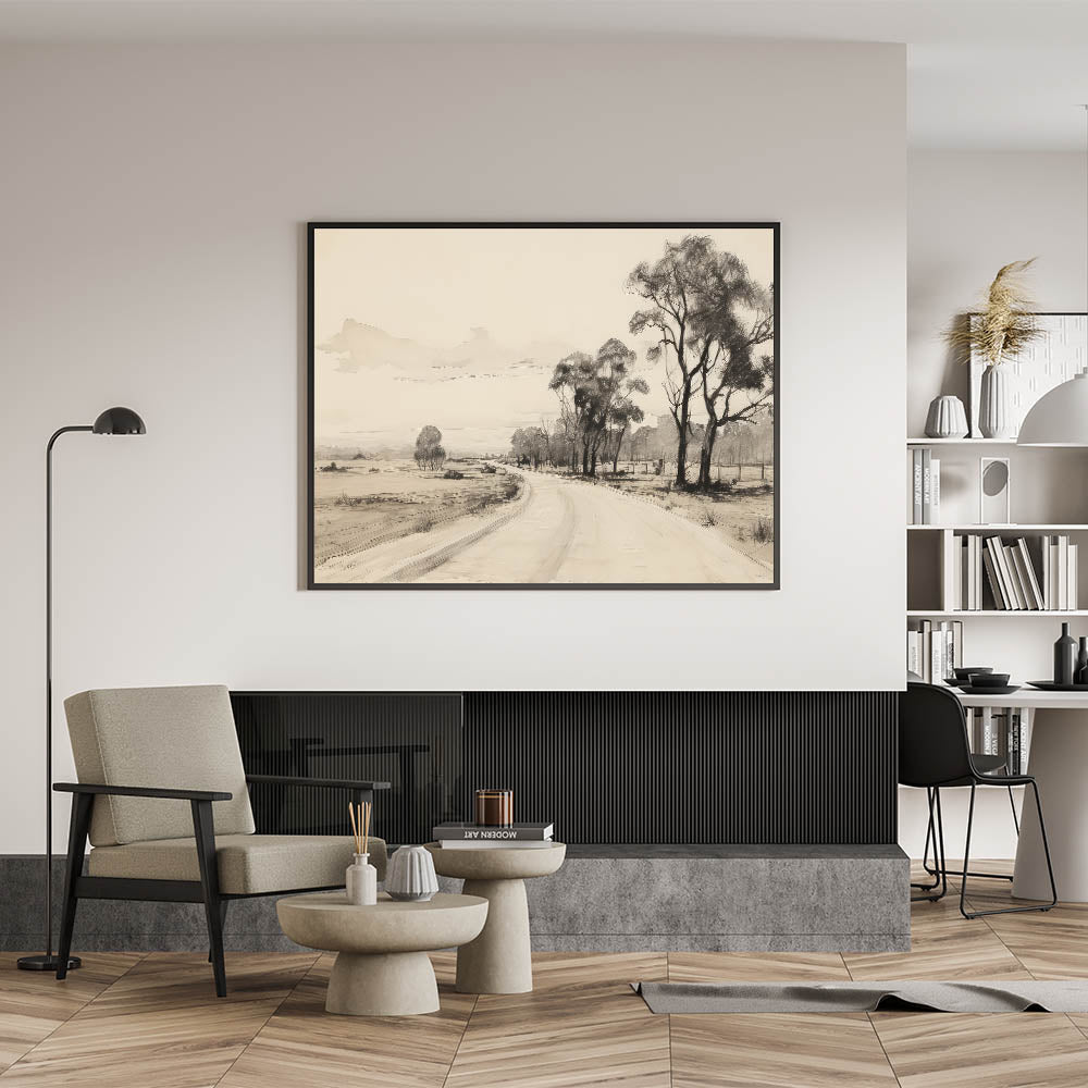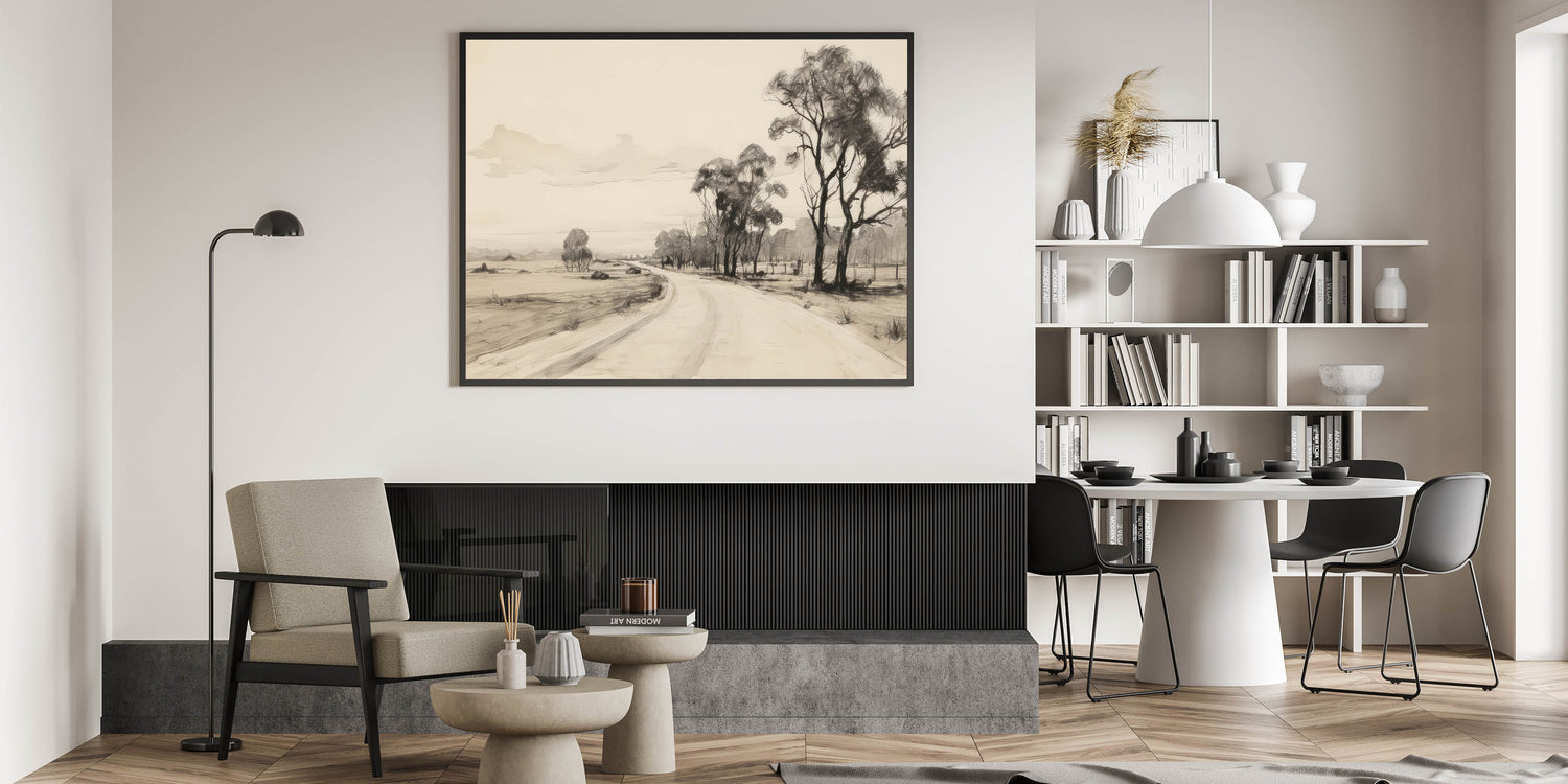 This vintage landscape art captures the essence of a peaceful countryside road, beautifully rendered in black-and-white ink. The winding road, lined with tall trees and vast open fields, evokes a sense of tranquility and nostalgia, transporting you to simpler times. Perfect for lovers of classic landscape prints, this artwork brings a touch of vintage charm and rustic elegance to your home decor.