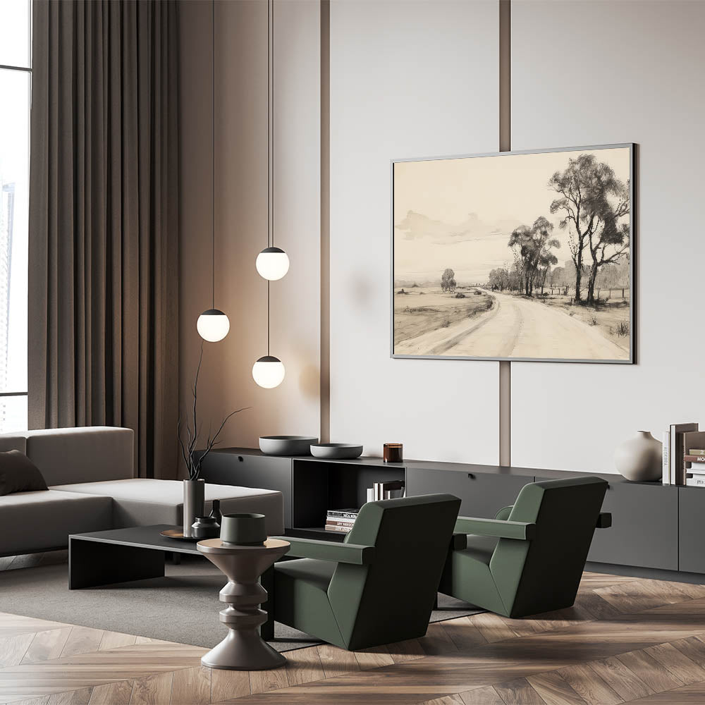 This vintage landscape art is perfect for anyone who appreciates the beauty of rural scenes and the charm of classic ink drawings. The peaceful road and surrounding trees make it an ideal piece to bring a sense of tranquility and nostalgia into your home.