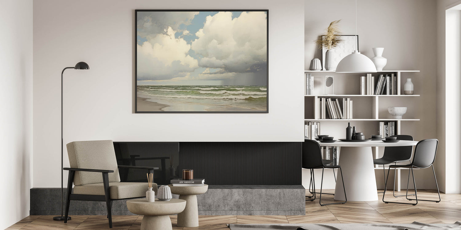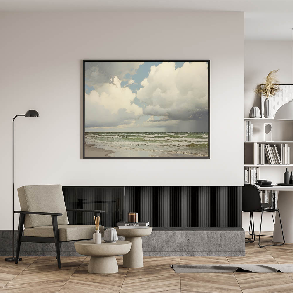 - High-quality vintage print of a dramatic beach scene with clouds and ocean waves.