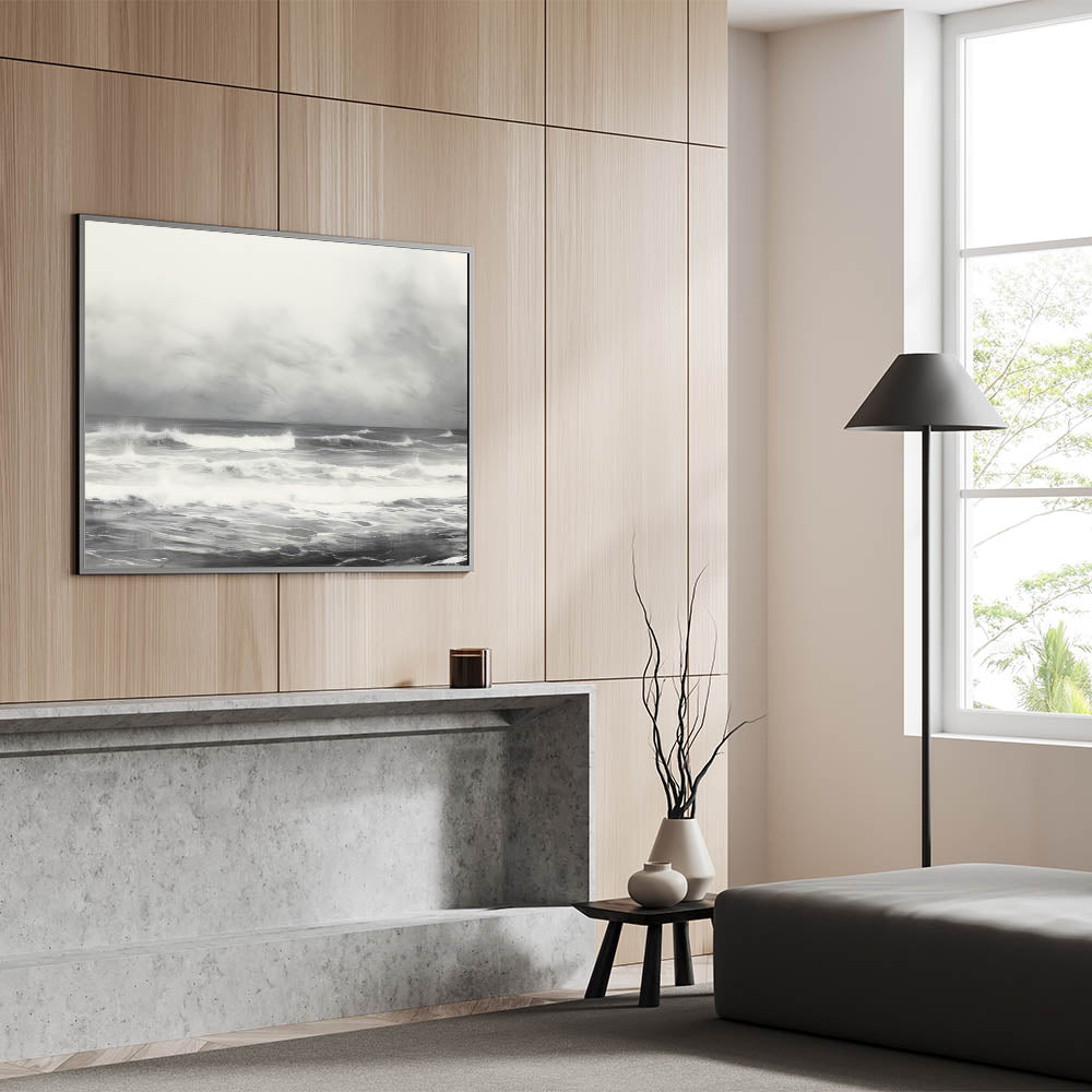Experience the raw beauty of the ocean with this dramatic vintage landscape art print. Featuring powerful ocean waves crashing against the shore under a moody, cloudy sky, this piece captures the untamed beauty of nature in all its glory. The monochromatic tones and swirling water create a sense of movement and depth, making it the perfect artwork for those who appreciate vintage-inspired coastal scenes.