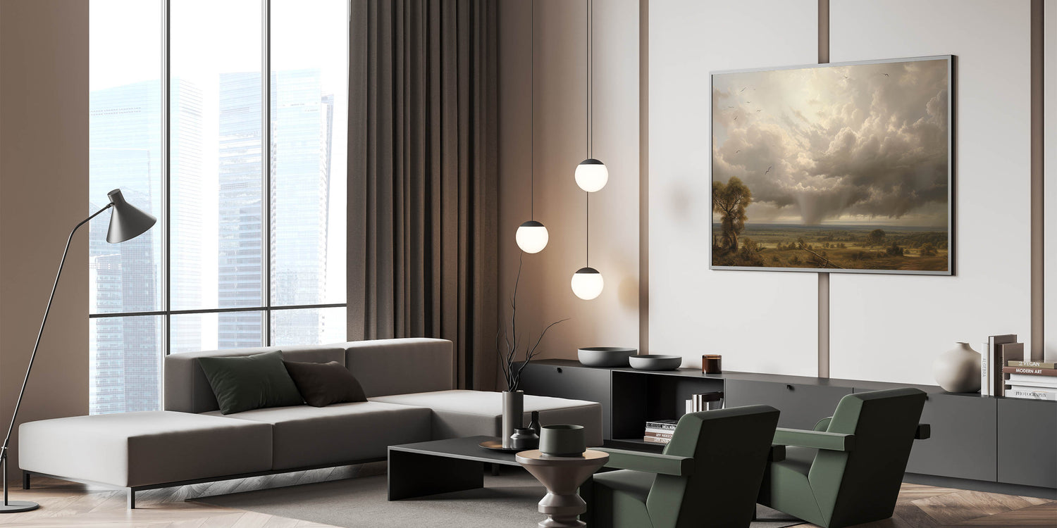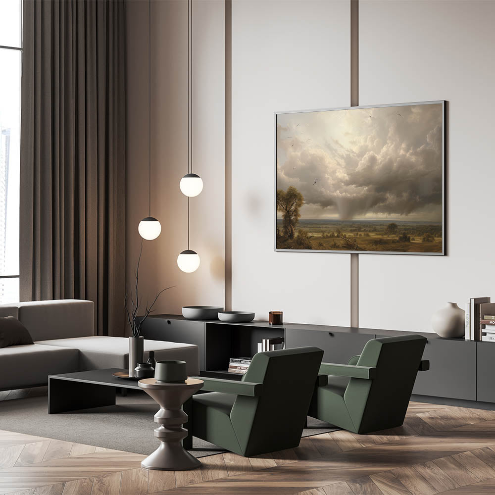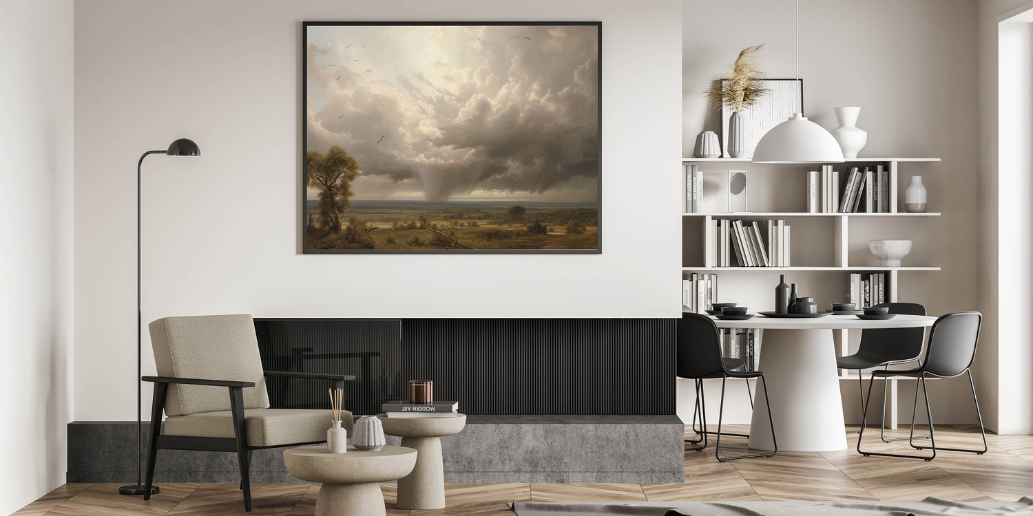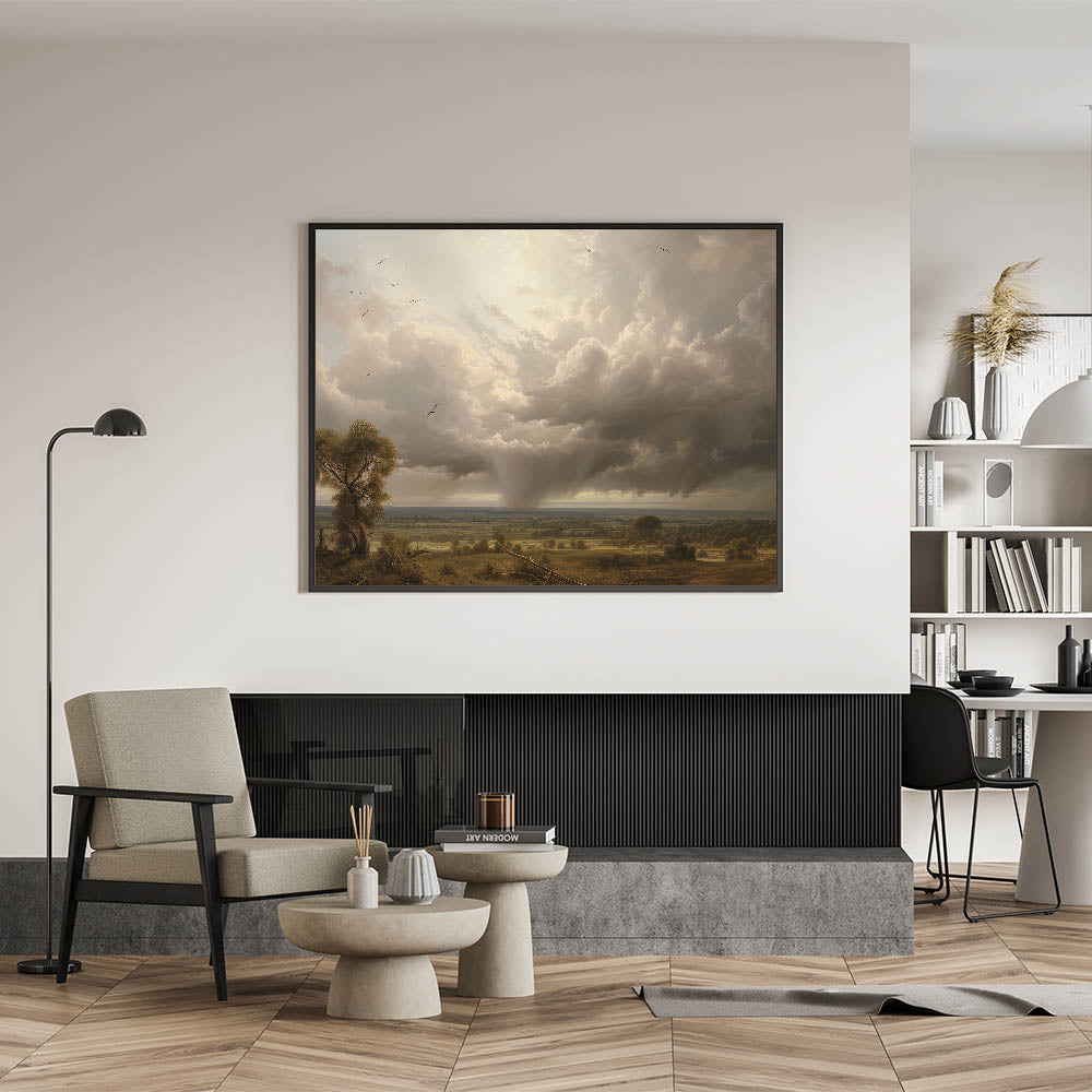 - Vintage-inspired landscape print with a powerful sky and tranquil countryside