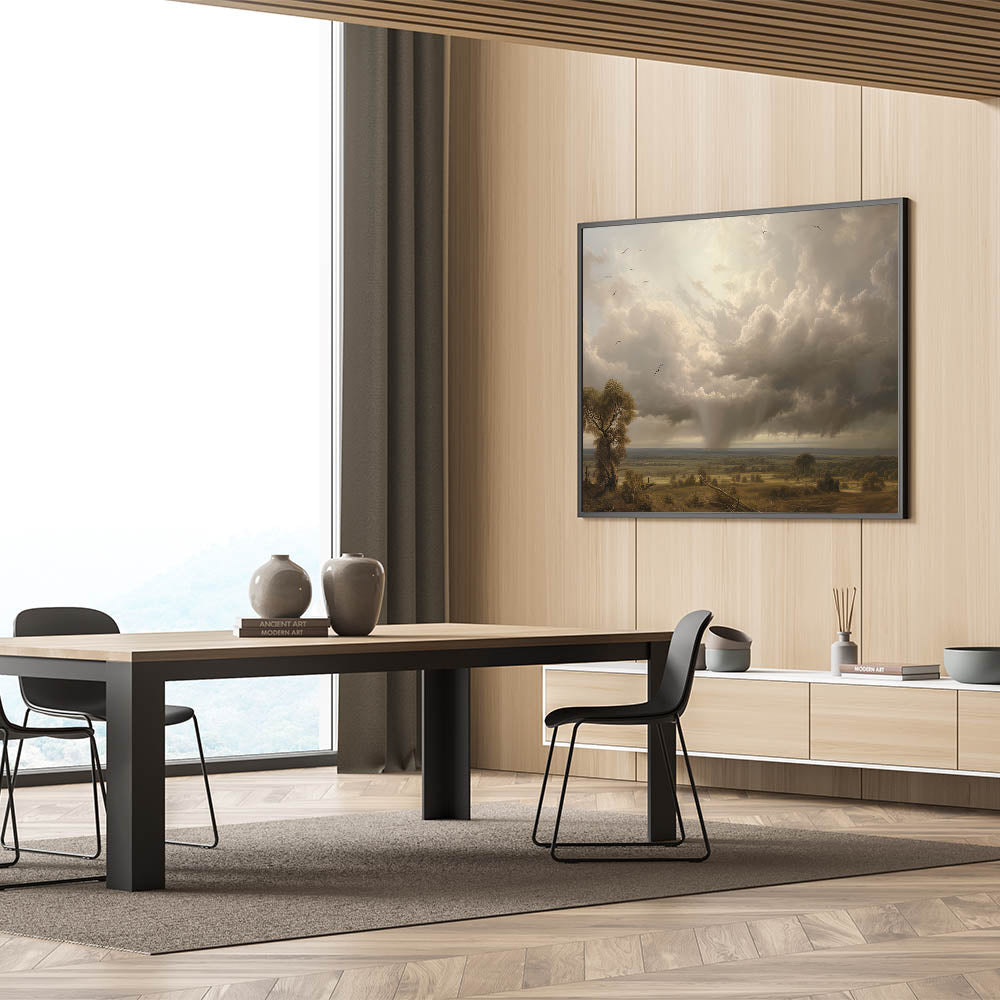 This breathtaking vintage landscape art captures the raw beauty of nature, featuring a dramatic sky filled with billowing clouds over a vast, peaceful countryside. The stunning contrast between the light breaking through the clouds and the serene landscape beneath creates a timeless scene that evokes a sense of awe and tranquility. Ideal for vintage landscape enthusiasts, this piece brings the splendor of nature's power and elegance to your home.