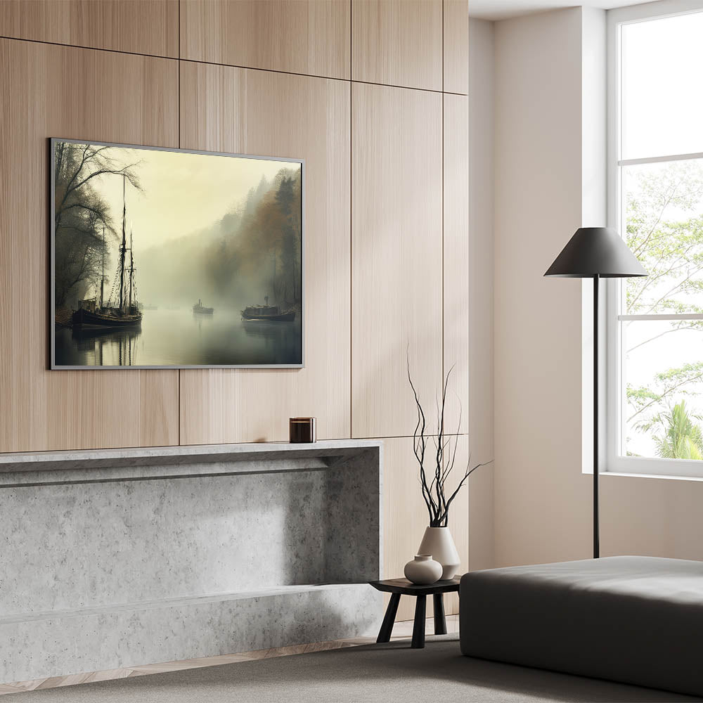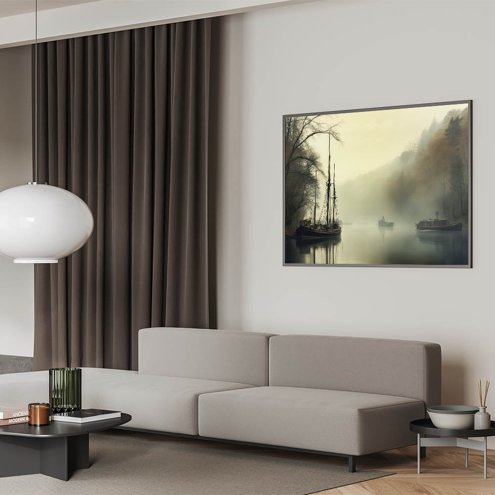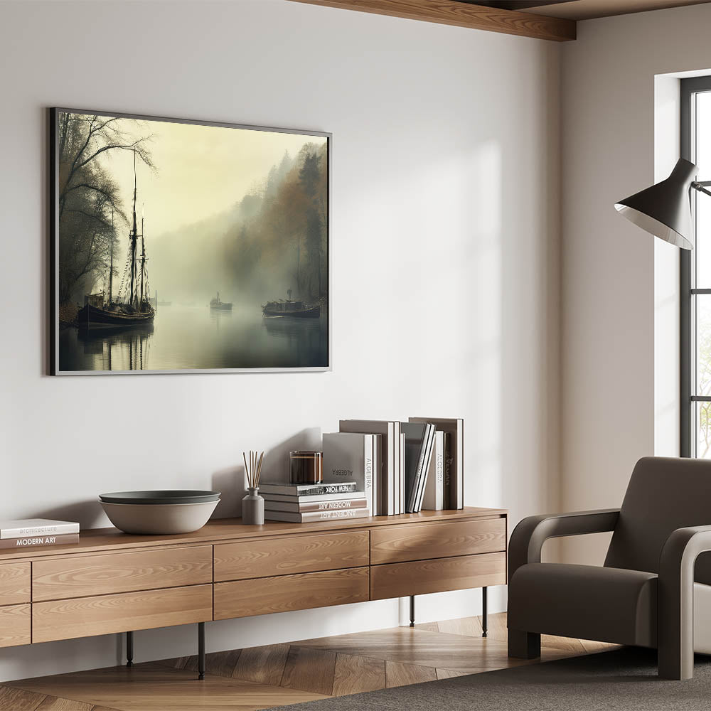 This vintage landscape art beautifully captures the mysterious beauty of a foggy river scene, with old boats peacefully drifting along the water. Bare trees line the misty banks, their reflections mirrored in the calm river. The muted tones and soft fog create a nostalgic and tranquil atmosphere, perfect for adding a vintage touch to your home decor. Ideal for lovers of nature-inspired art and serene landscapes, this piece brings timeless charm and elegance to any space.