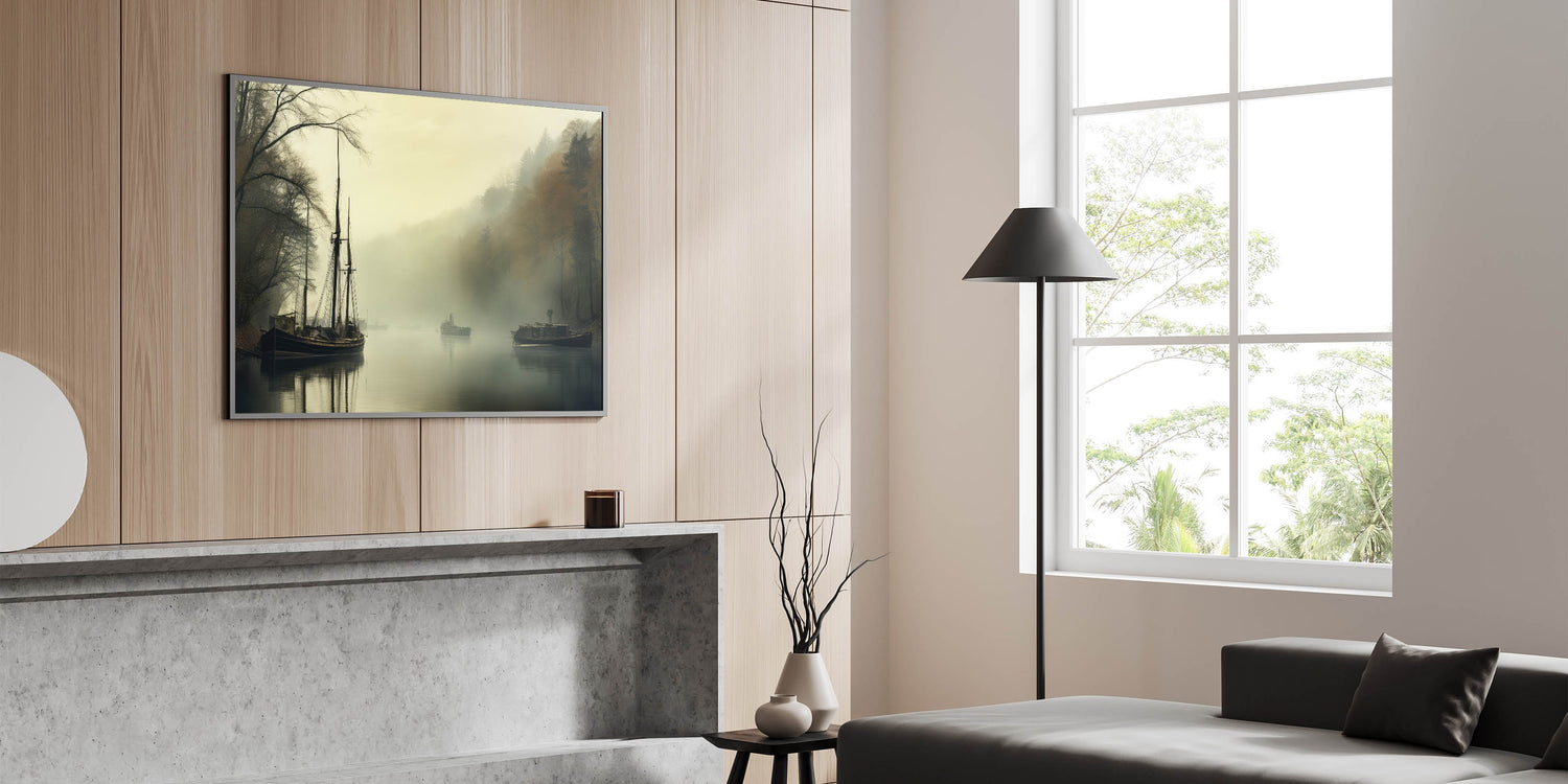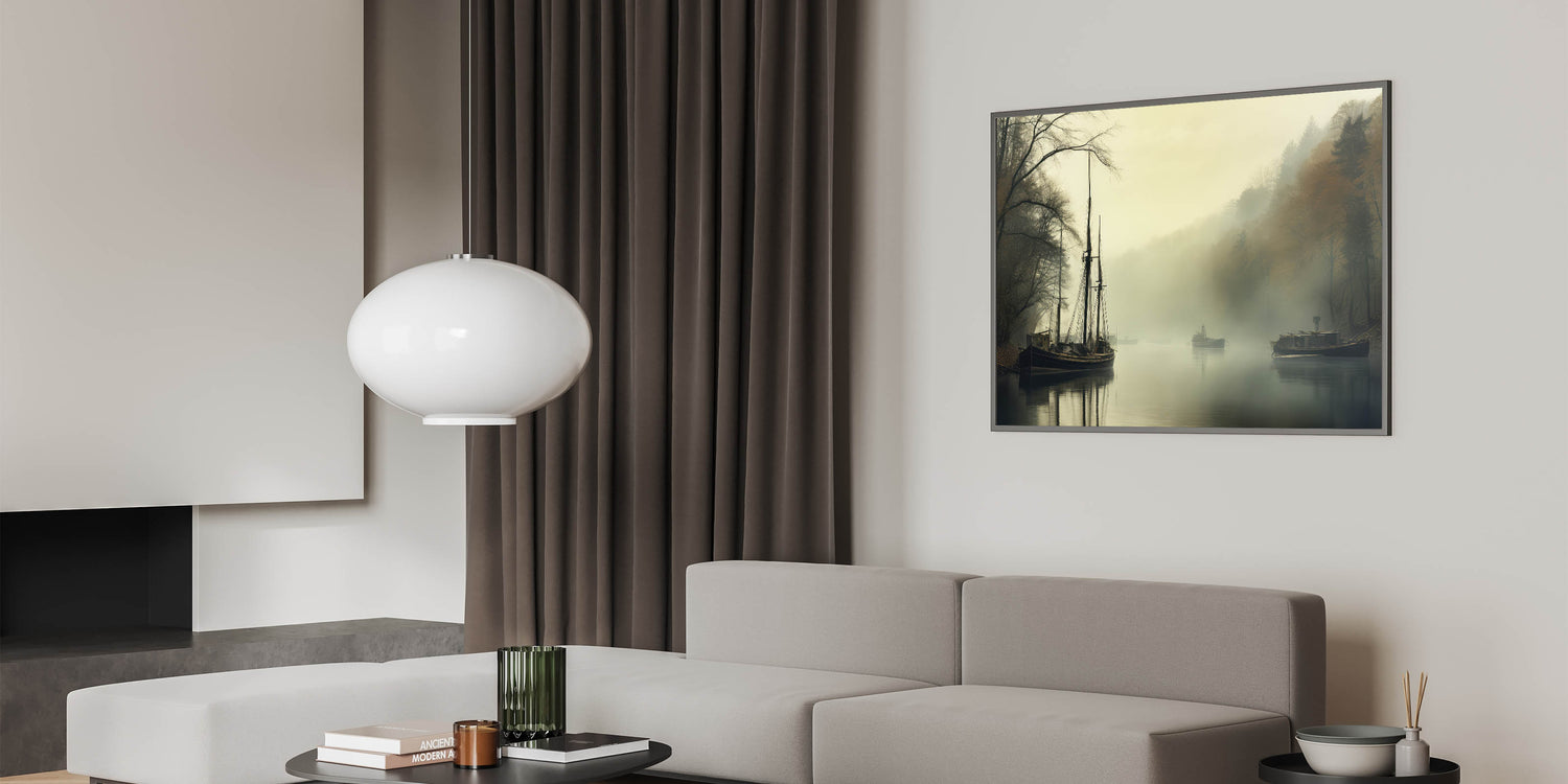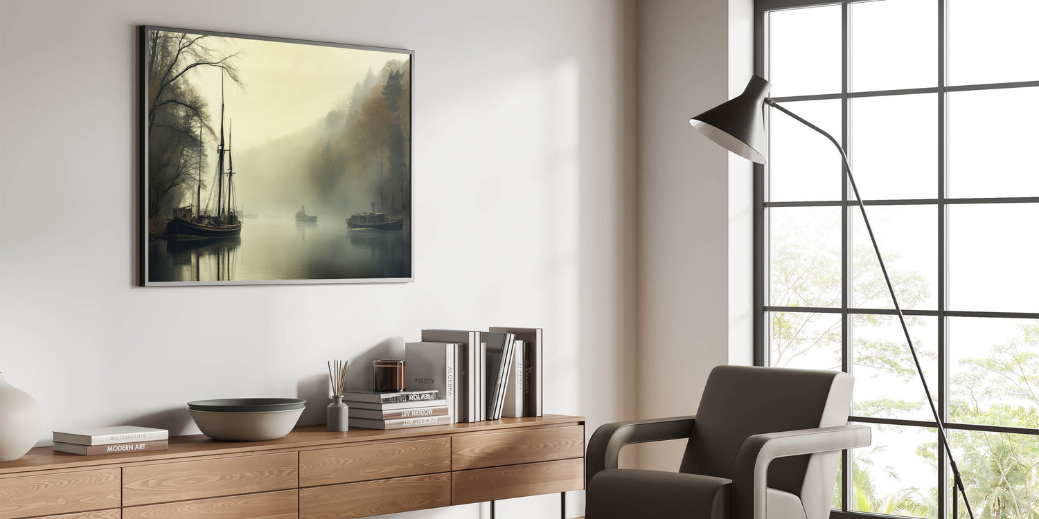 This vintage landscape art beautifully captures the mysterious beauty of a foggy river scene, with old boats peacefully drifting along the water. Bare trees line the misty banks, their reflections mirrored in the calm river. The muted tones and soft fog create a nostalgic and tranquil atmosphere, perfect for adding a vintage touch to your home decor. Ideal for lovers of nature-inspired art and serene landscapes, this piece brings timeless charm and elegance to any space.