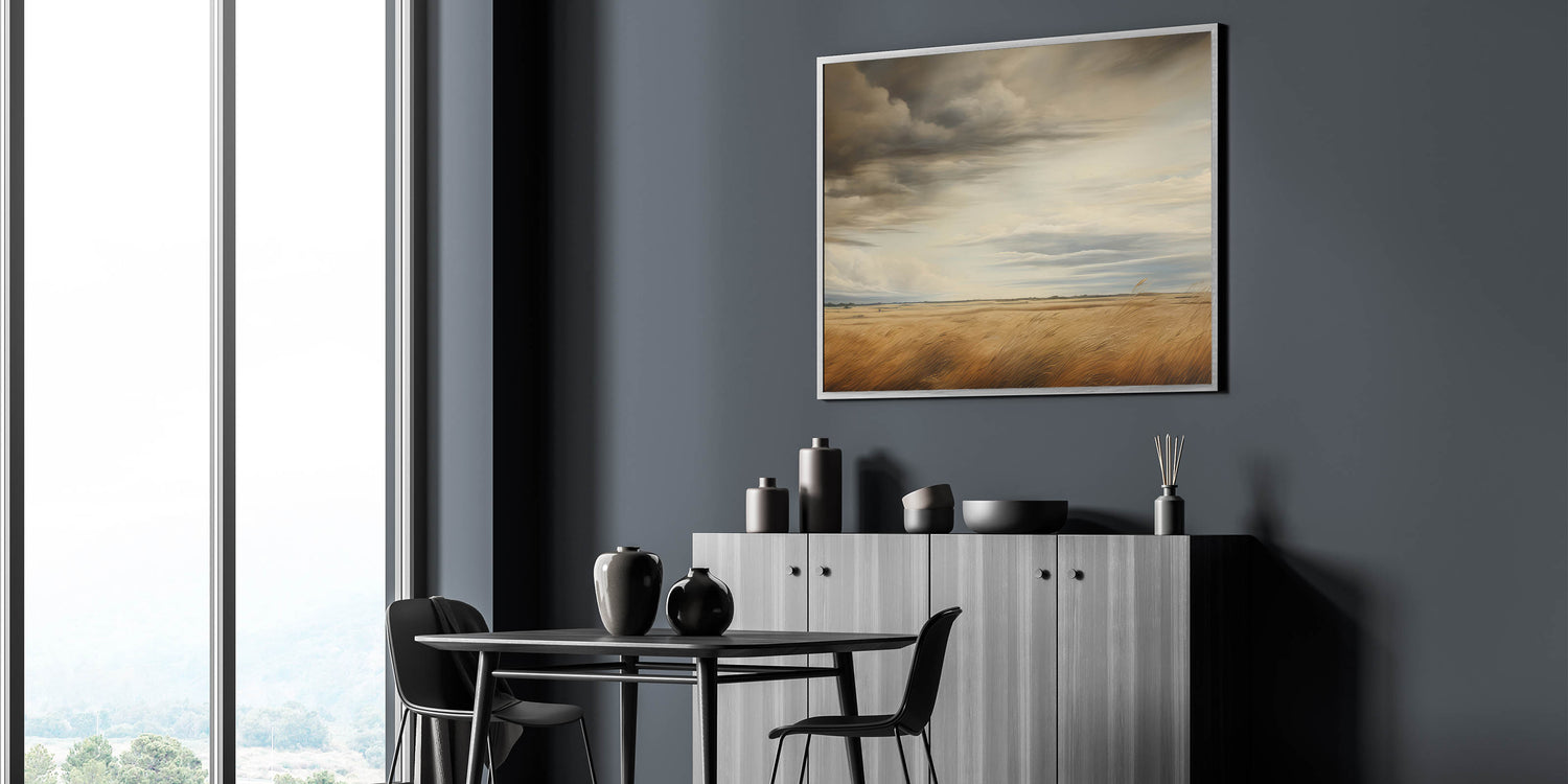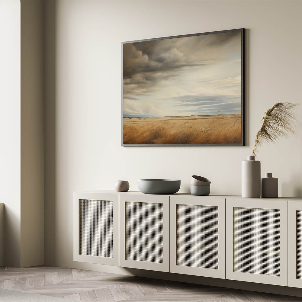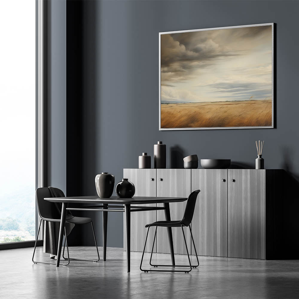 This vintage landscape art captures the grandeur of a vast golden field beneath dramatic, swirling skies. The rich tones of the wheat and the ever-changing clouds above create a stunning contrast, evoking the beauty and power of nature. This piece brings a sense of peaceful solitude, perfect for lovers of rural landscapes and timeless art. Its powerful atmosphere makes it an ideal addition to vintage-inspired home decor, bringing a rustic charm to any space.