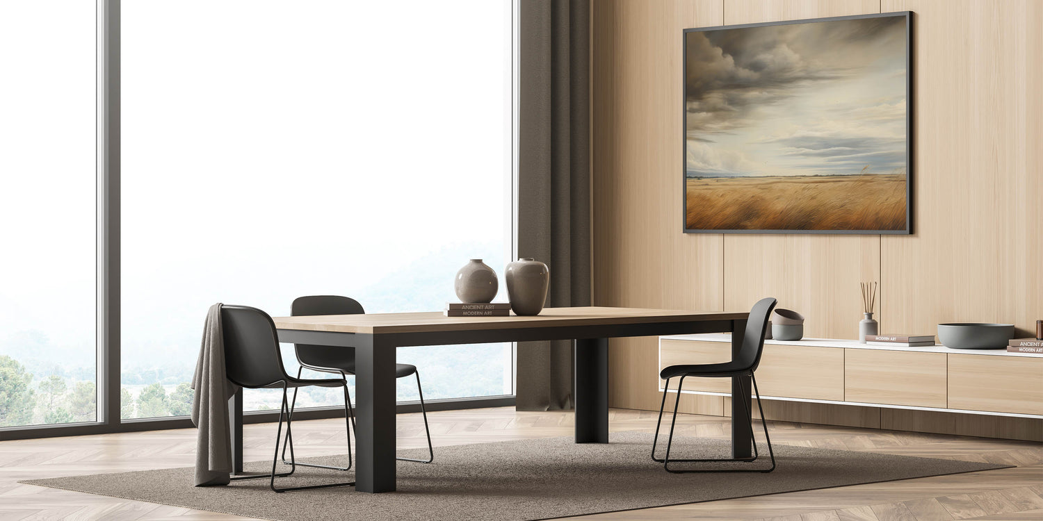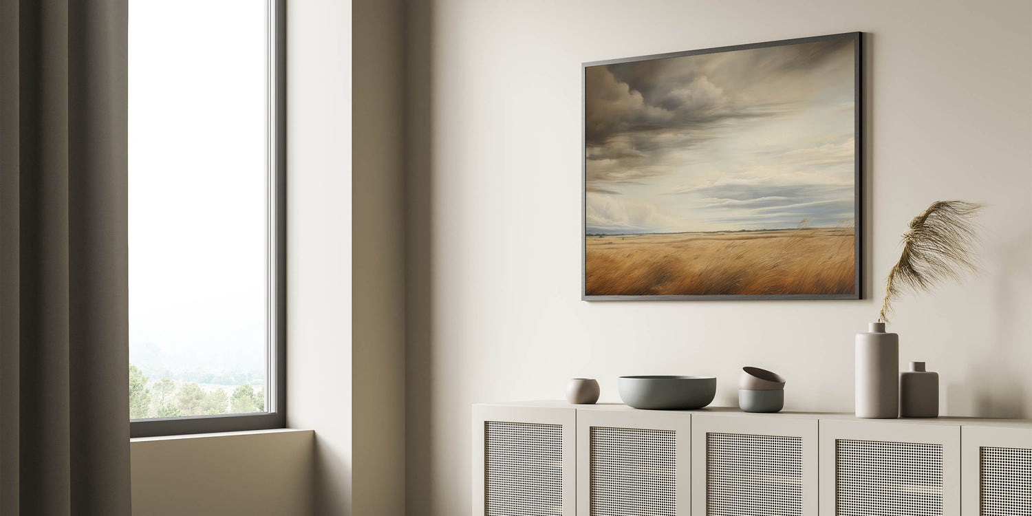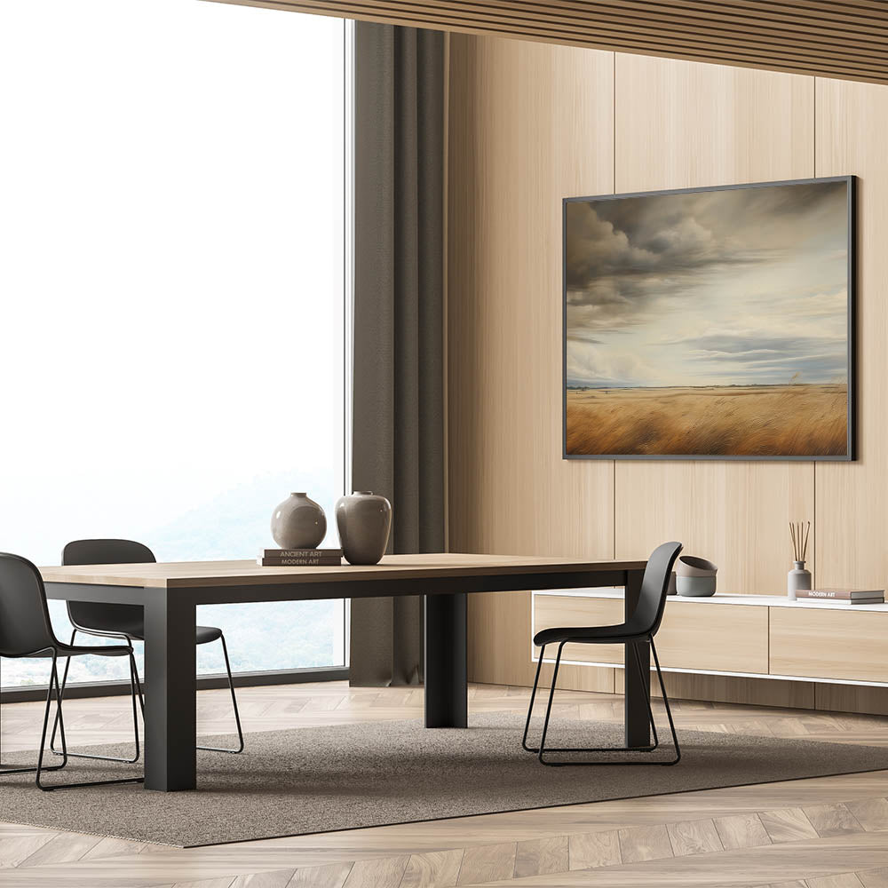 This vintage landscape art captures the grandeur of a vast golden field beneath dramatic, swirling skies. The rich tones of the wheat and the ever-changing clouds above create a stunning contrast, evoking the beauty and power of nature. This piece brings a sense of peaceful solitude, perfect for lovers of rural landscapes and timeless art. Its powerful atmosphere makes it an ideal addition to vintage-inspired home decor, bringing a rustic charm to any space.