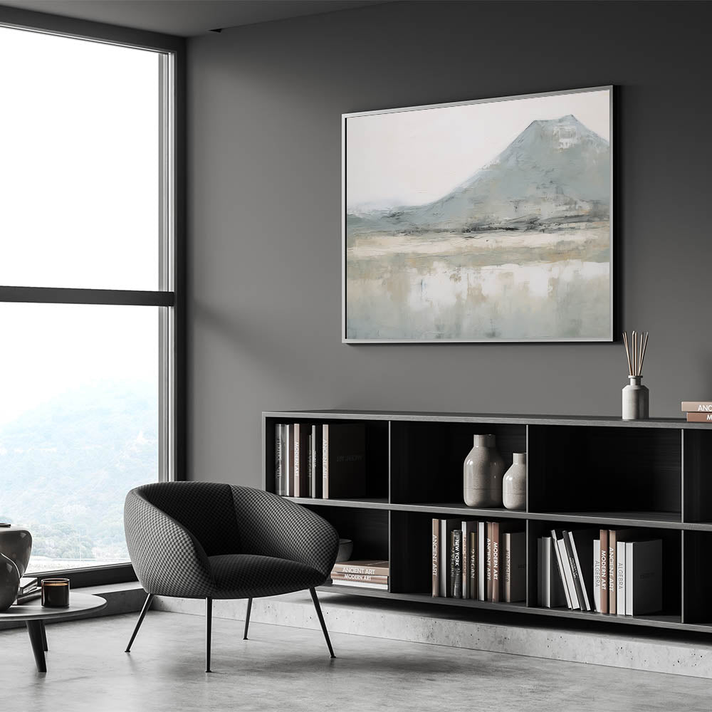 This vintage landscape art captures the majestic beauty of a misty mountain landscape, with soft hues of gray and beige creating a tranquil, dream-like atmosphere. The subtle reflection of the mountain in the calm water below adds depth and serenity to the scene. This piece is perfect for adding a sense of calm and timeless beauty to any room in your home, with its soft, natural tones and peaceful imagery.