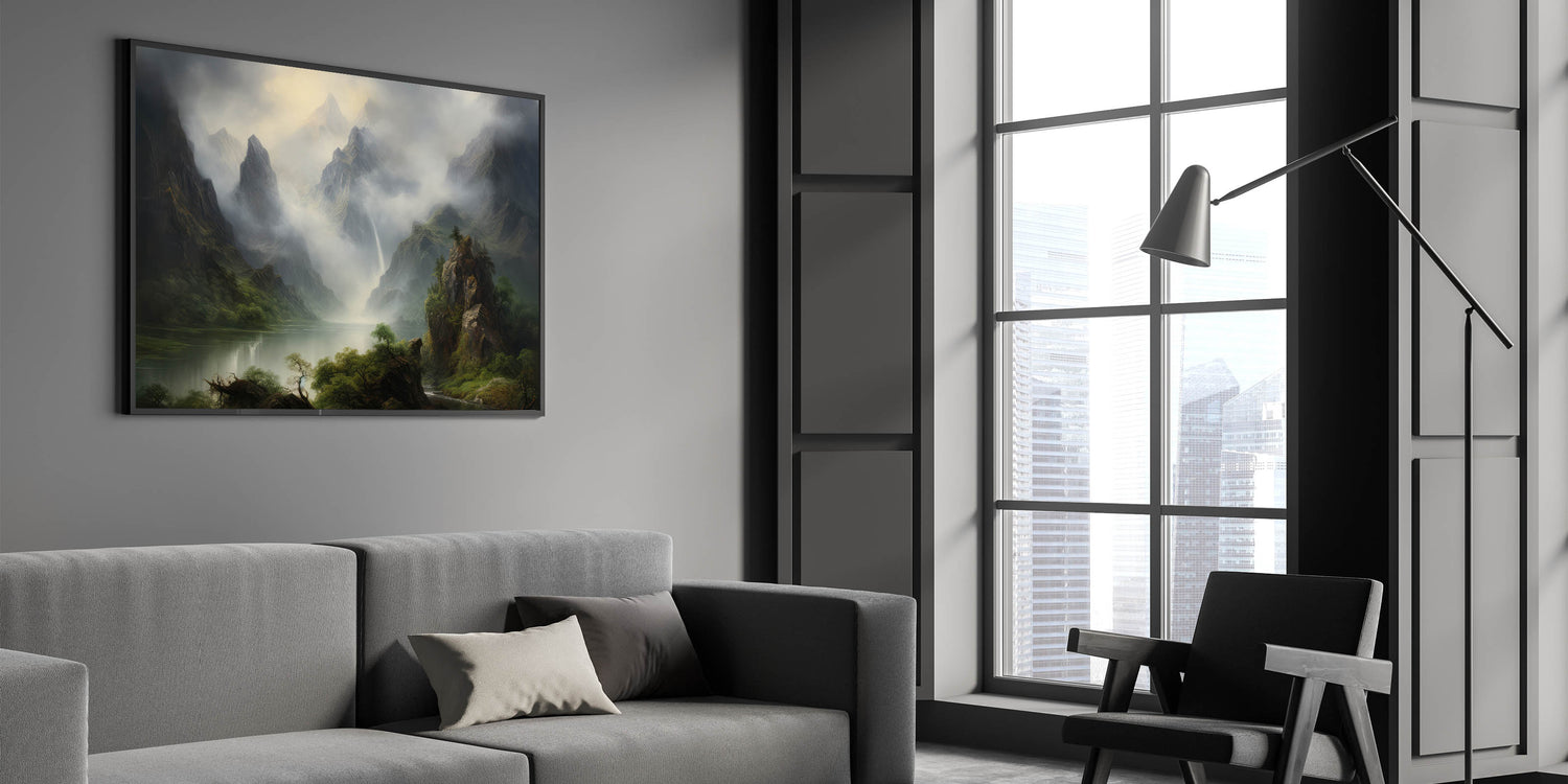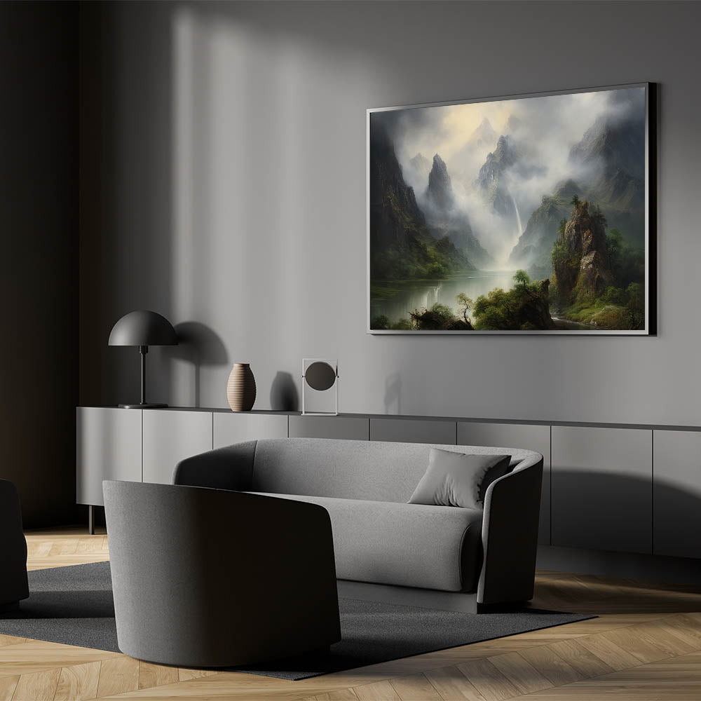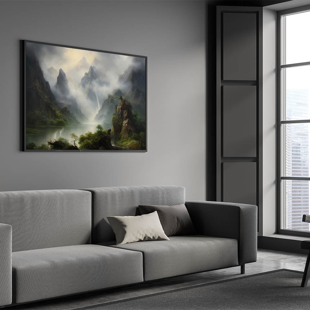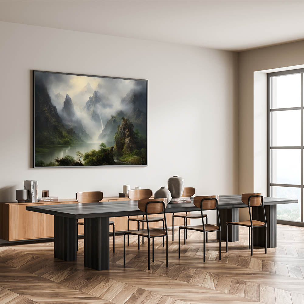 Let the serene yet powerful beauty of this misty mountain scene fill your home with a sense of calm and timeless elegance.