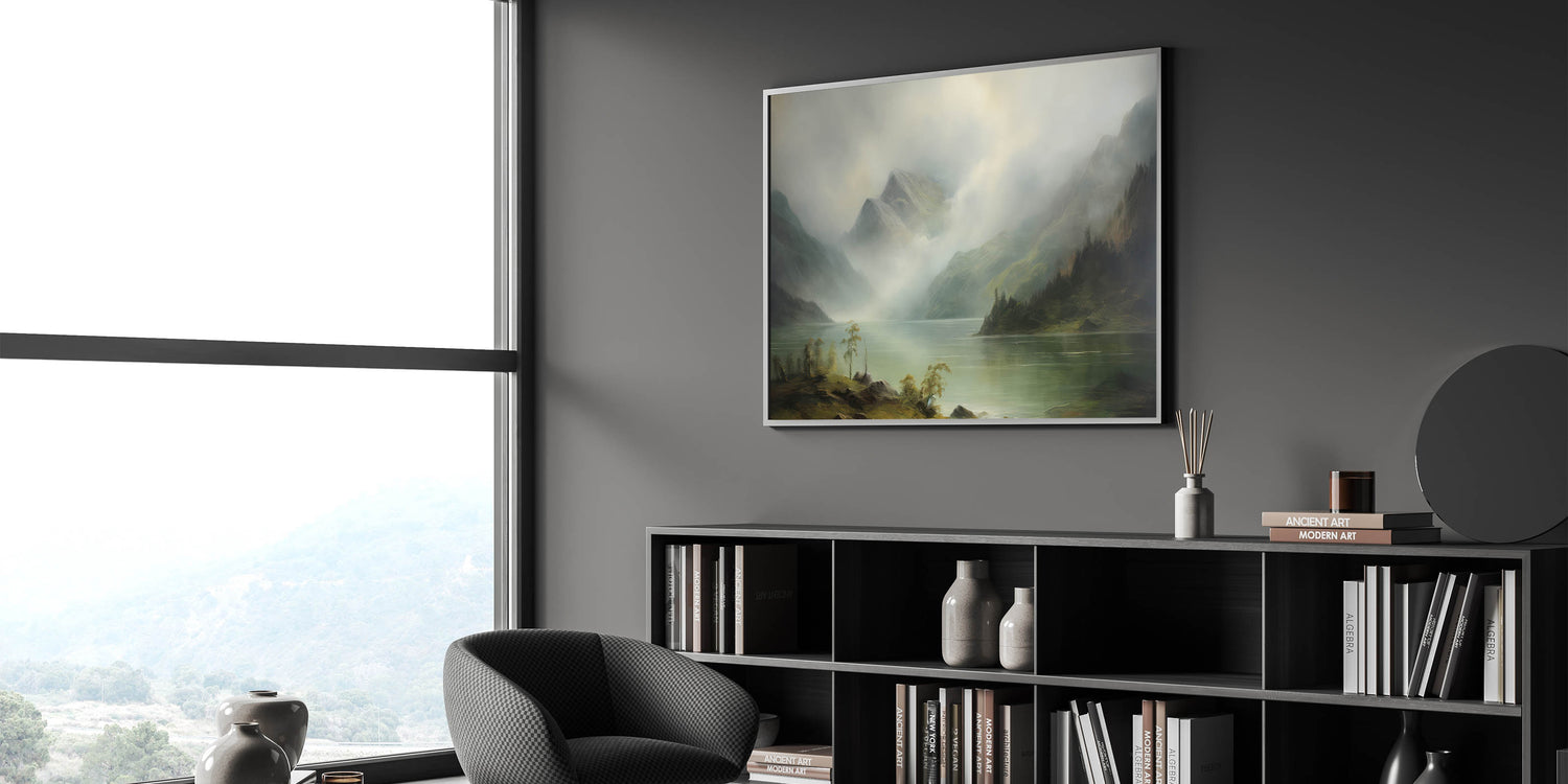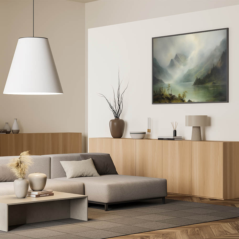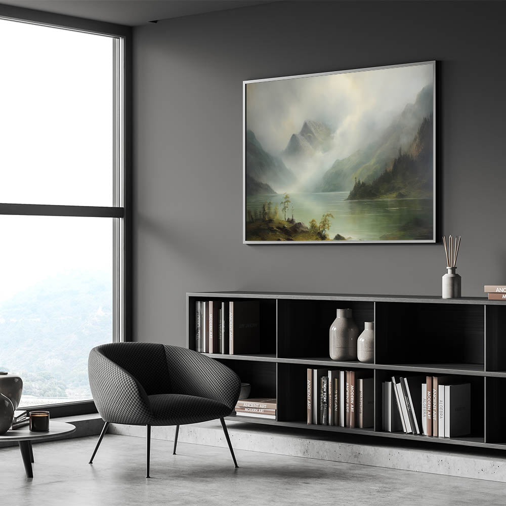 Add this serene and timeless scene to your home, bringing the beauty of misty mountains and quiet lakes into your space.