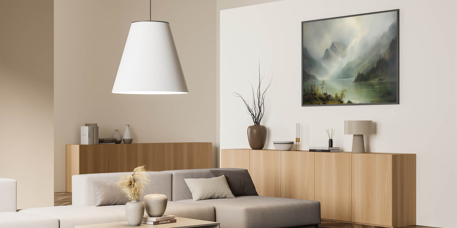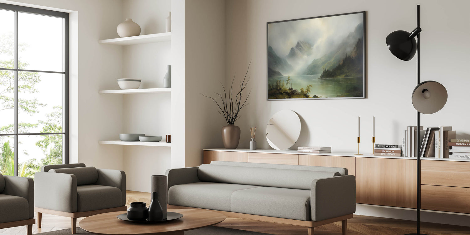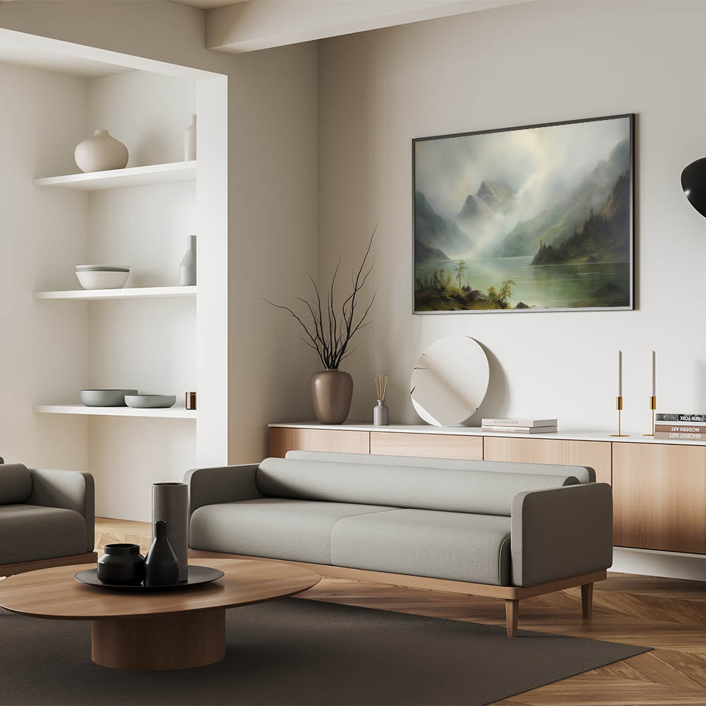 Add this serene and timeless scene to your home, bringing the beauty of misty mountains and quiet lakes into your space.