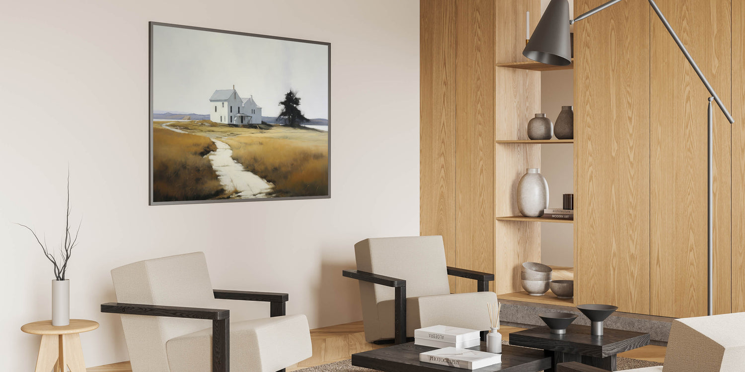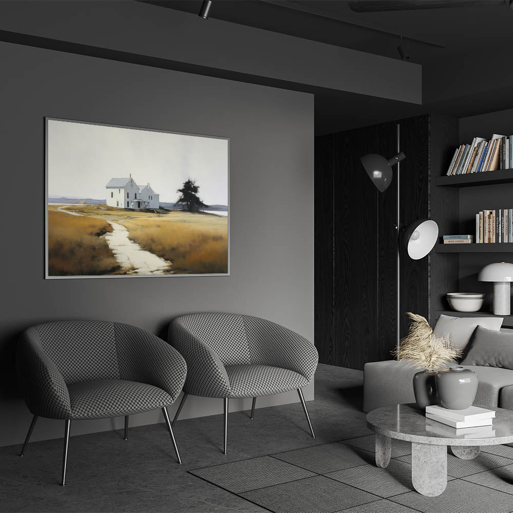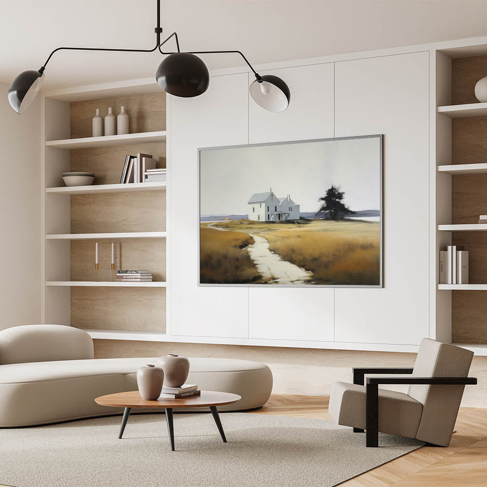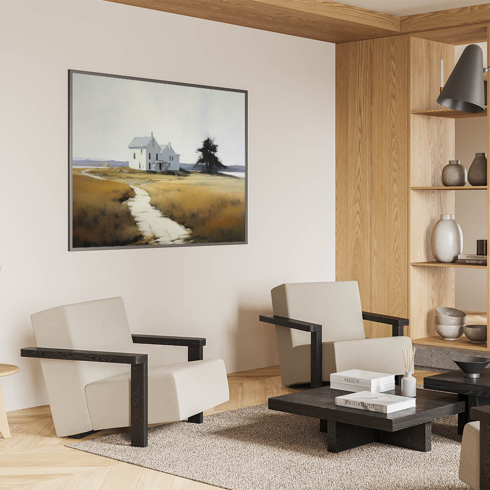 This vintage landscape art captures the calm and simplicity of rural life. A solitary house stands beside a winding path, with a lone tree in the foreground, all set against a serene countryside backdrop. The soft, earthy tones and expansive open field evoke feelings of tranquility and nostalgia, making it a perfect addition to any vintage-inspired home. The contrast between the bright white house and the soft, natural surroundings creates a striking yet peaceful scene that will bring warmth and charm to your space.