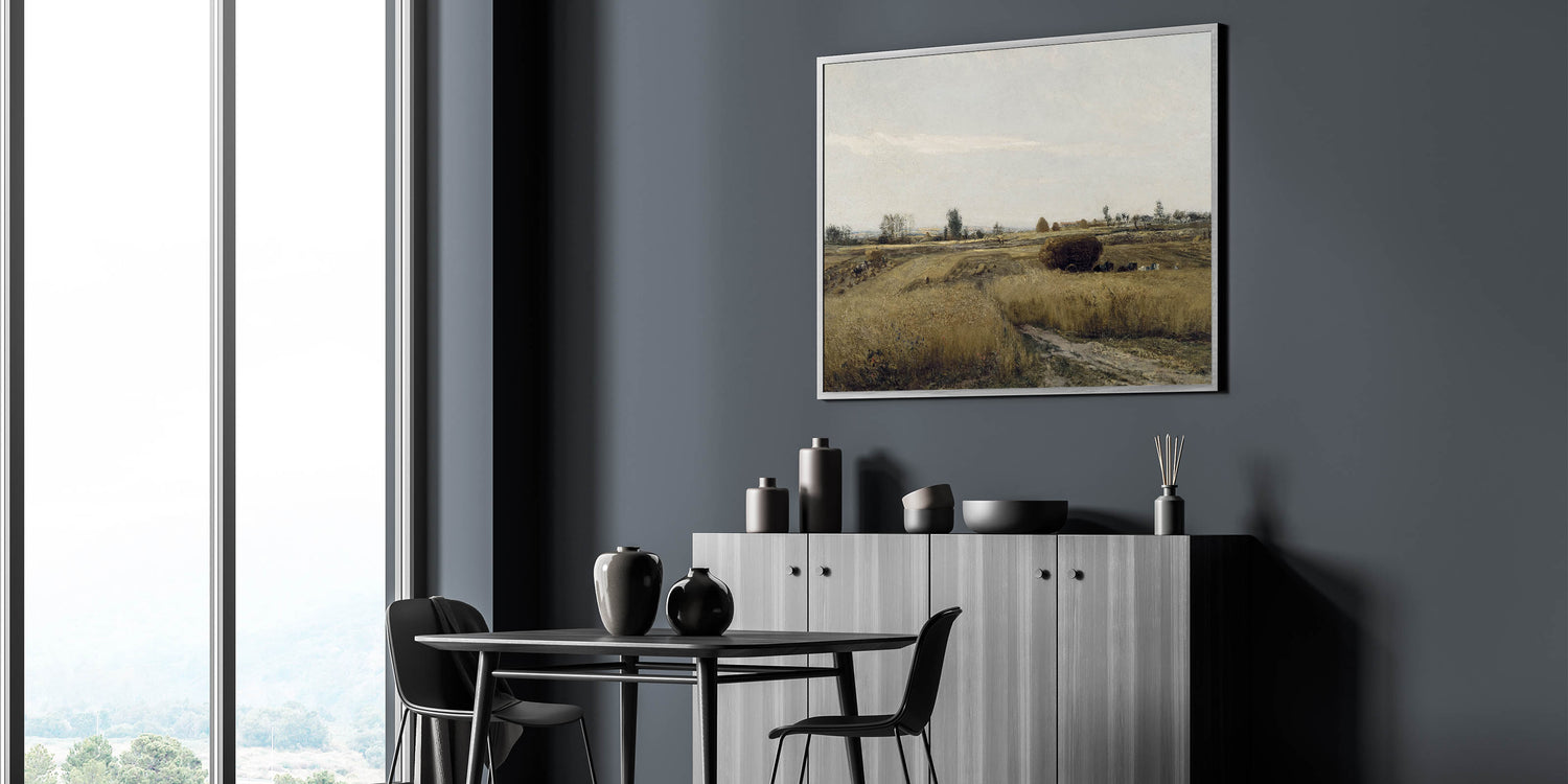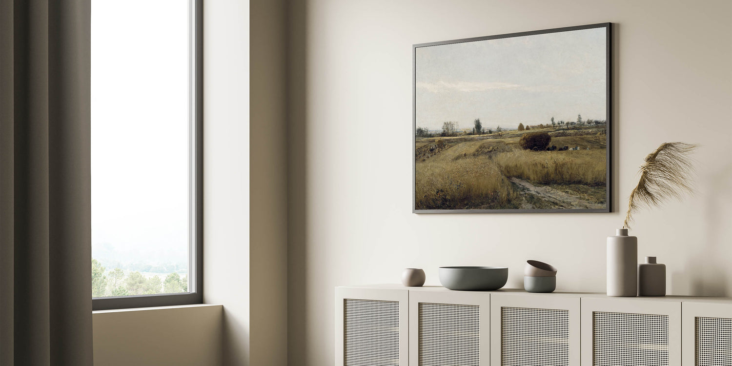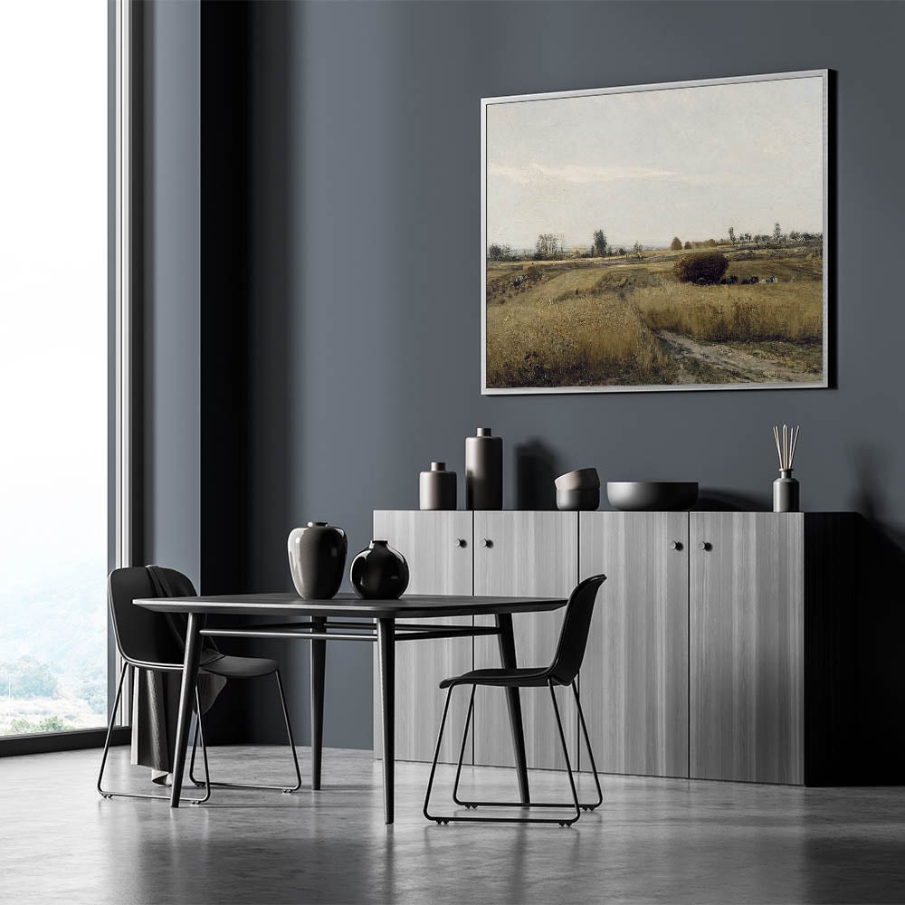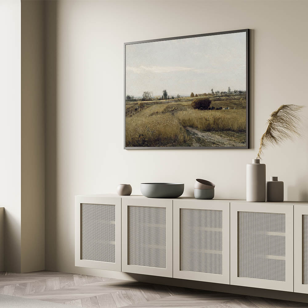 Introduction: Bring a sense of timeless charm to your home with this vintage landscape art. This peaceful rural scene captures the essence of an era long past, featuring a wide-open countryside with workers in the fields, distant trees, and a quiet, serene atmosphere. It’s the perfect piece to enhance your vintage decor and transport you to a simpler time.