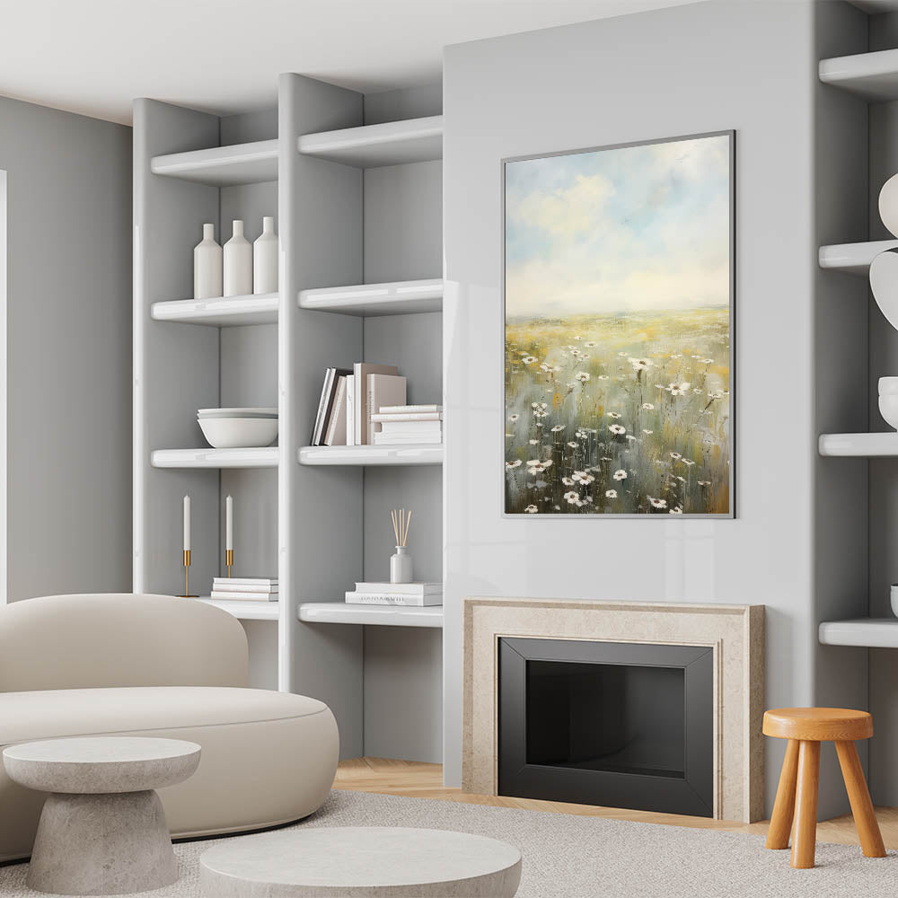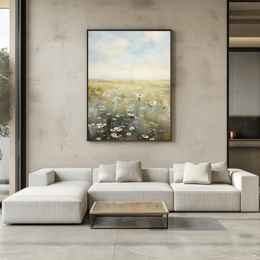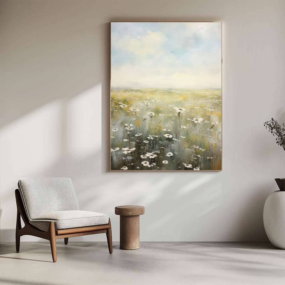 Immerse yourself in the tranquil beauty of this vintage landscape art, featuring a rustic meadow filled with delicate white flowers set against a serene sky. This piece captures the essence of timeless nature, offering a perfect nostalgic touch for your home decor. The soft yellow and green hues blend seamlessly with the white flowers, evoking a sense of calm and serenity ideal for creating a peaceful atmosphere.