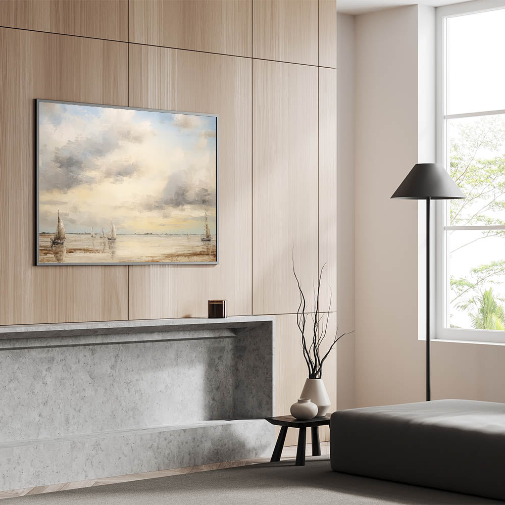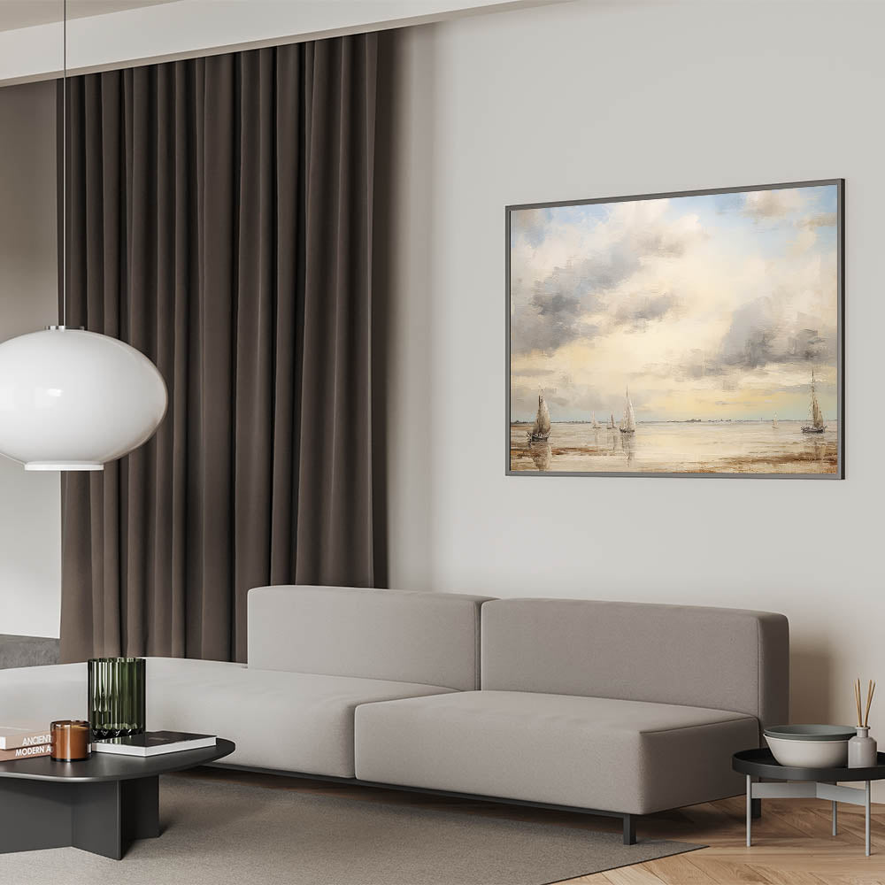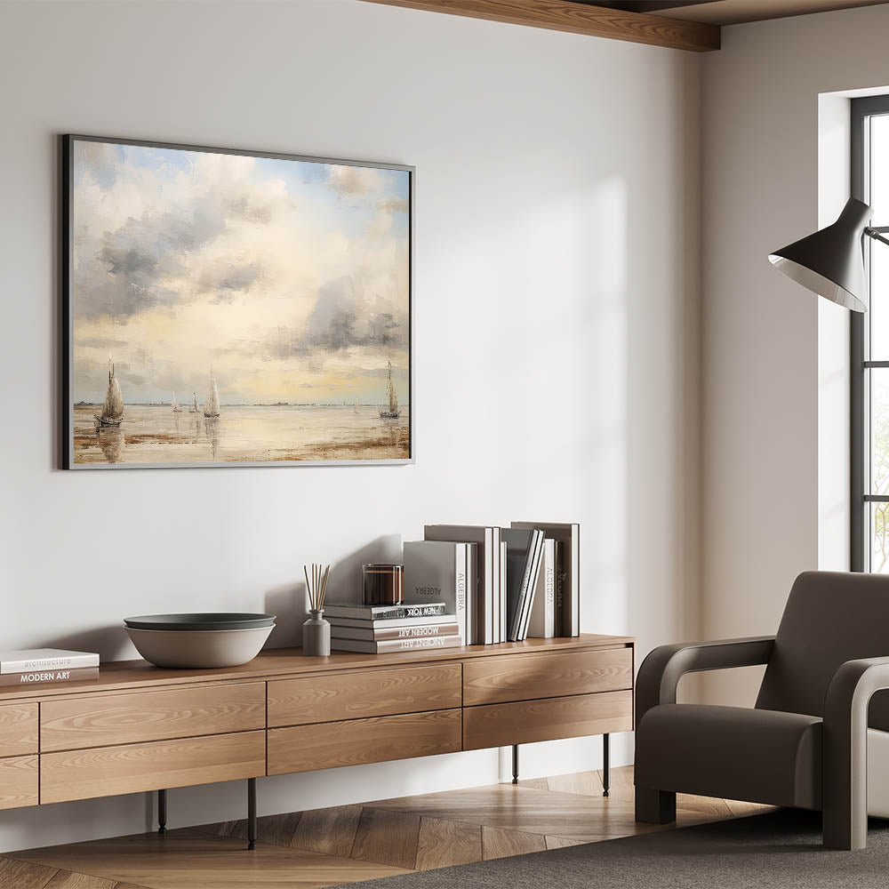 This beautiful vintage landscape art features several sailboats gliding gracefully across calm, reflective waters. The soft sky, with gentle clouds and light hues of blue and beige, adds to the serene atmosphere, evoking a sense of peace and timeless beauty. The perfect piece to enhance any space, this artwork captures the elegance of sailing on a quiet day, making it ideal for nautical or vintage-themed home decor.