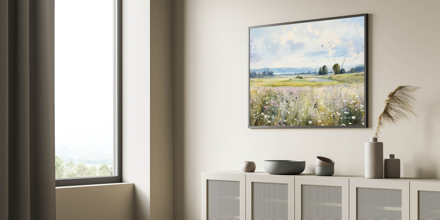 - Vintage-inspired landscape print featuring a serene floral meadow