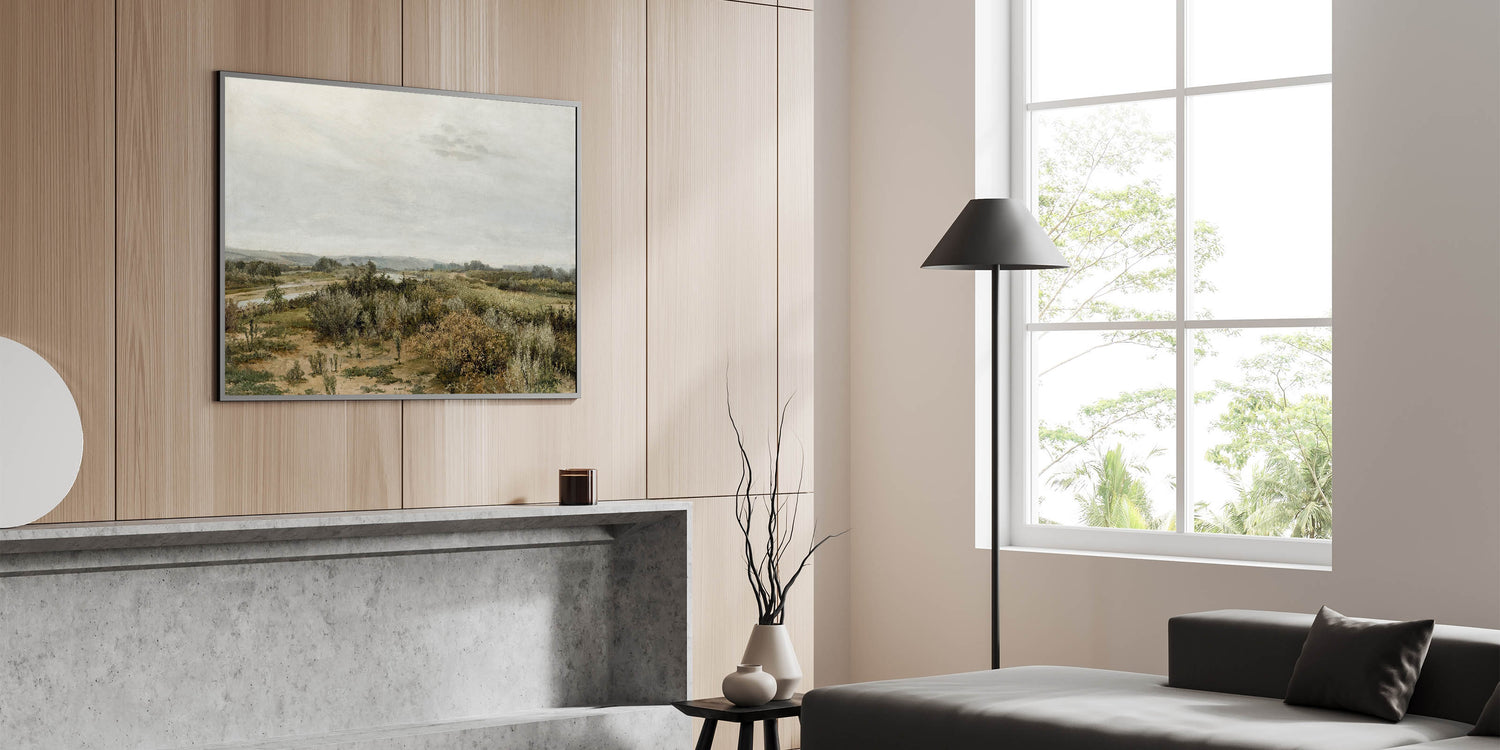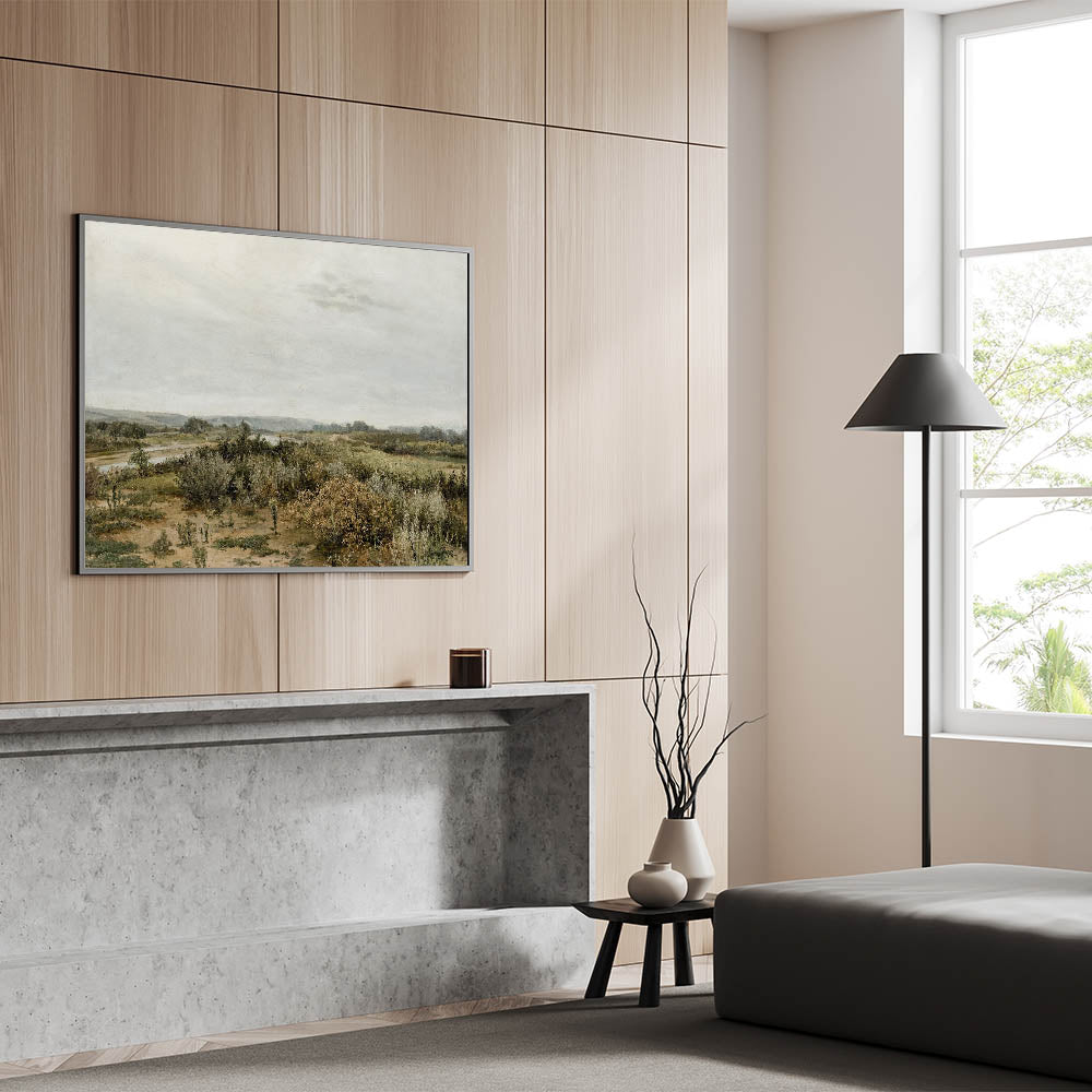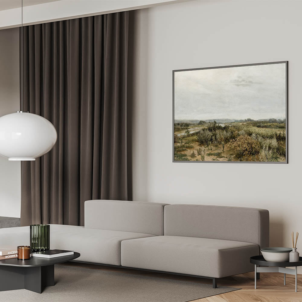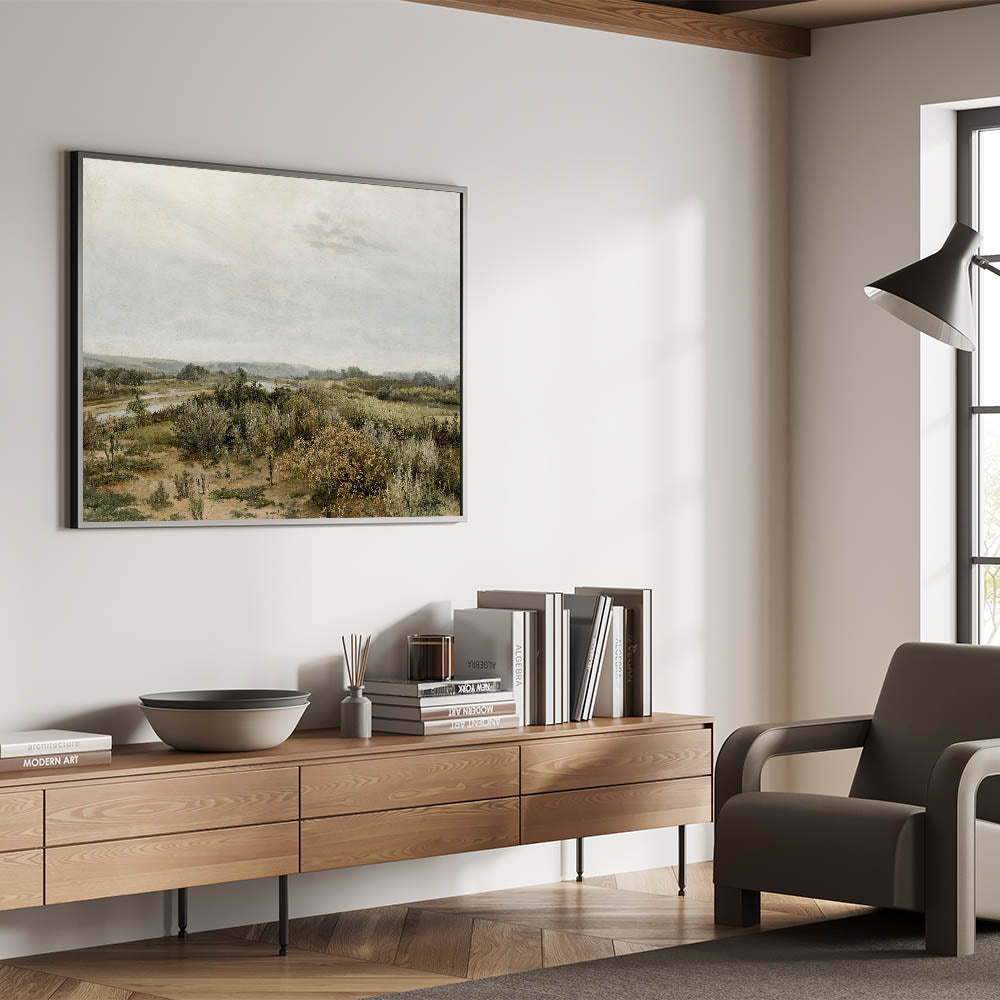 This Vintage Landscape Art captures the serene beauty of a tranquil countryside river scene. With soft, muted colors and a vast open landscape, this Classic Landscape Print brings timeless elegance to your decor. The quiet river meandering through the lush greenery evokes the calmness of nature, offering a peaceful escape into the past. Perfect for those who appreciate the nostalgic scenery of classic landscapes, this piece offers a glimpse into simpler times.