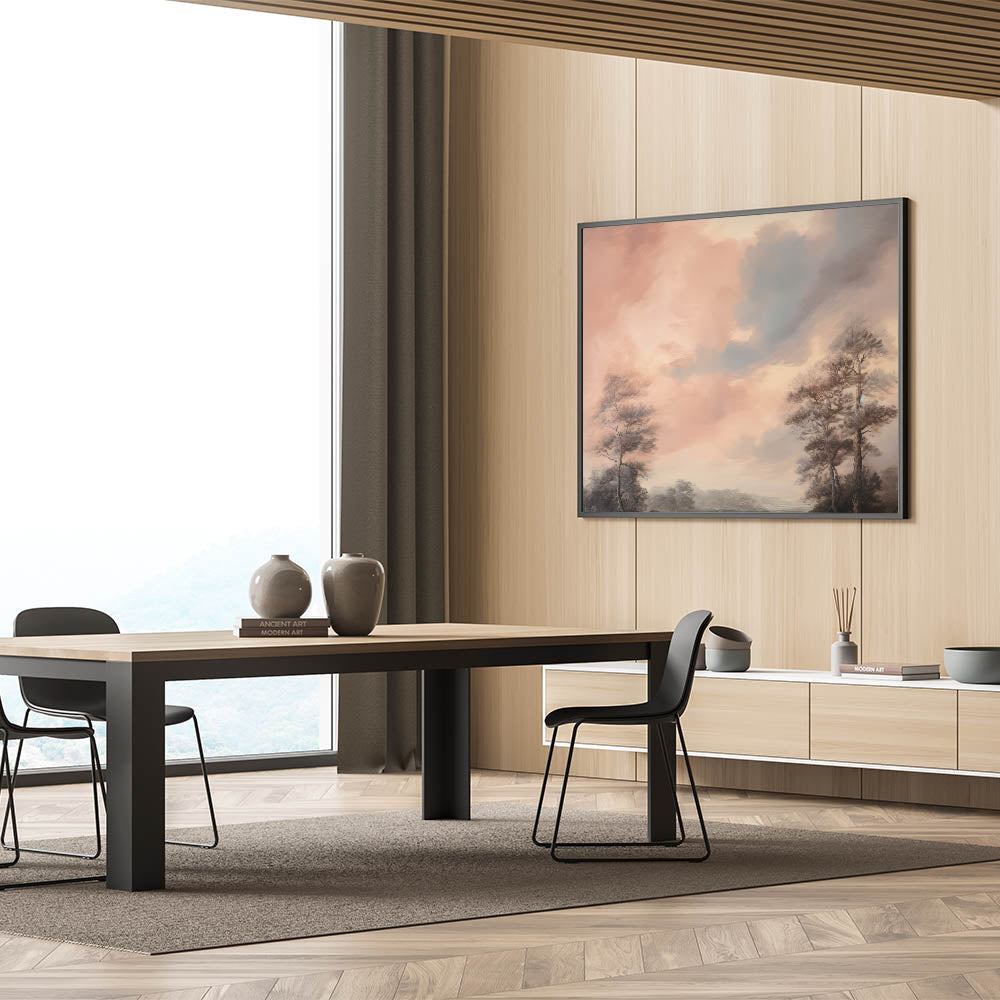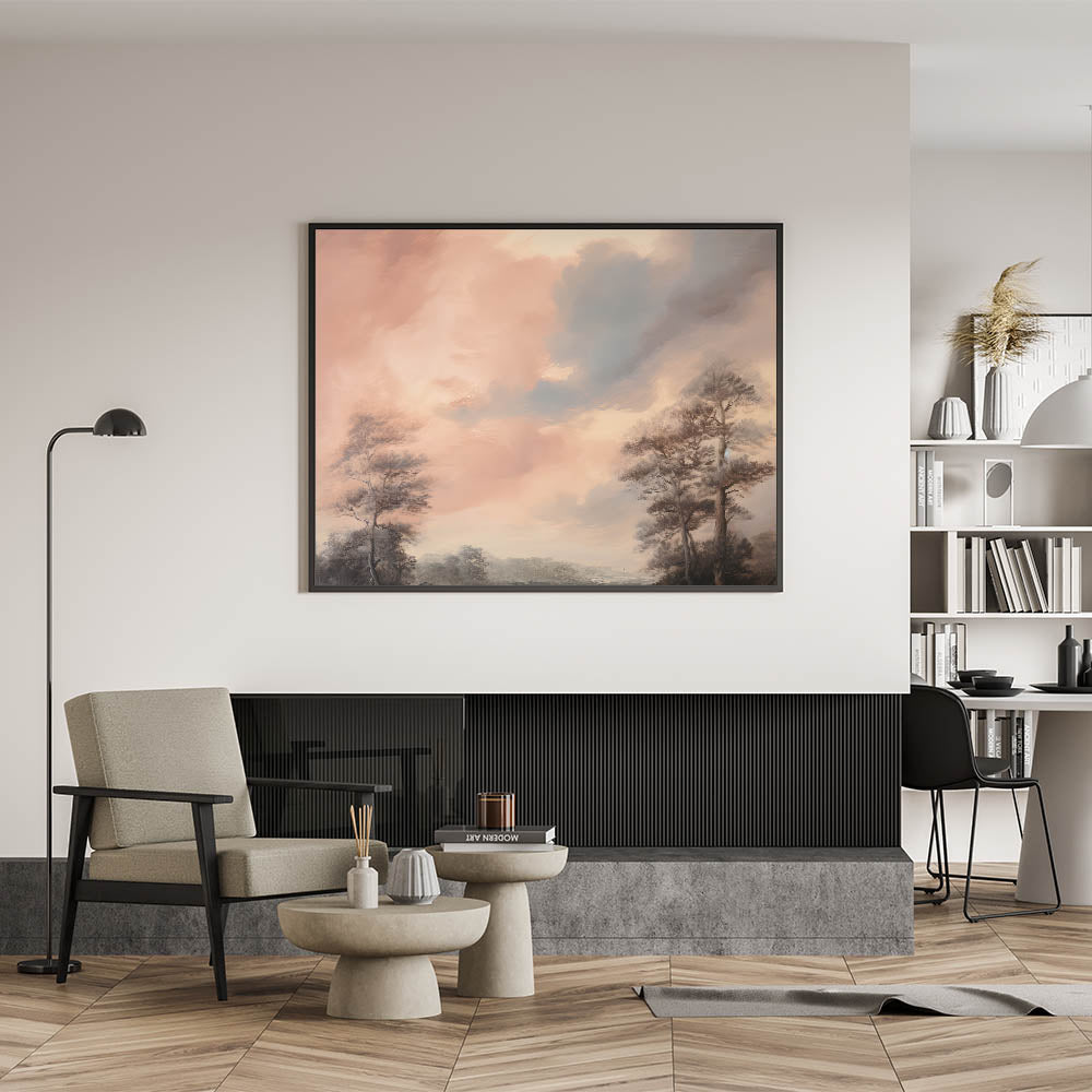 Immerse yourself in the tranquil beauty of this vintage landscape art, featuring a serene sky with soft, pastel hues and towering trees against a calm backdrop. The gentle clouds and muted tones create a peaceful ambiance, making this artwork perfect for adding a touch of vintage-inspired elegance to any room. The nostalgic scene captures the timeless beauty of nature in its most serene form.