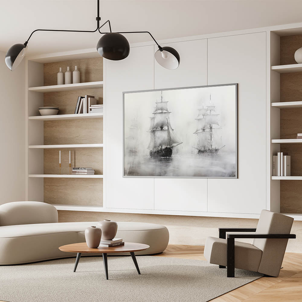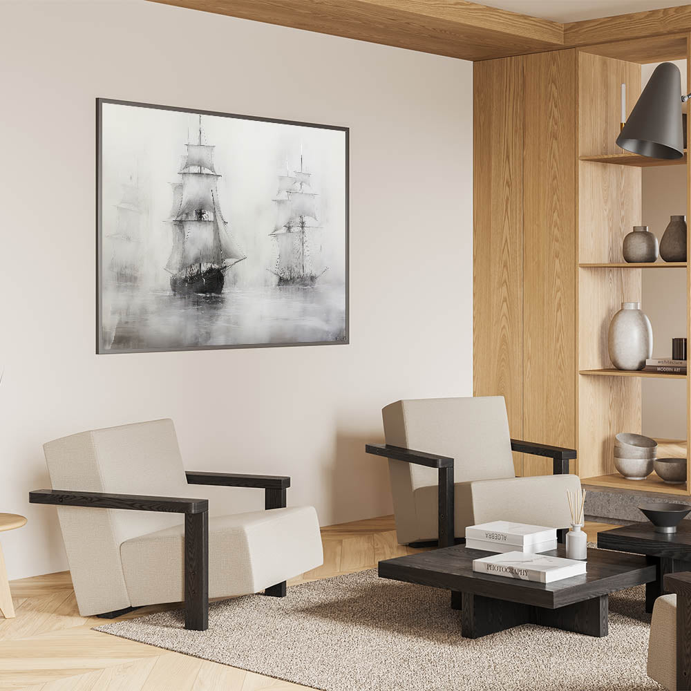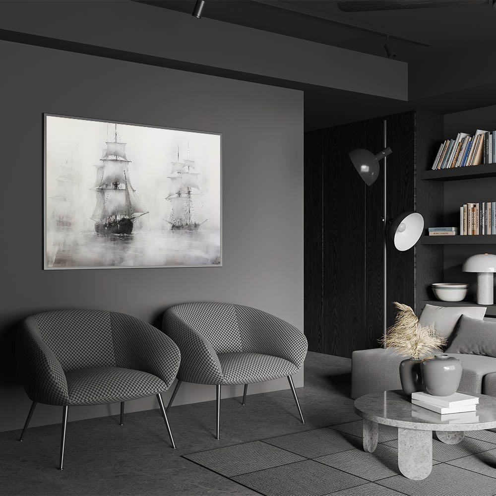 This vintage artwork of ships in the mist brings a touch of classic nautical charm to your home. Its moody, timeless design makes it an elegant addition to any collection of maritime-inspired art.