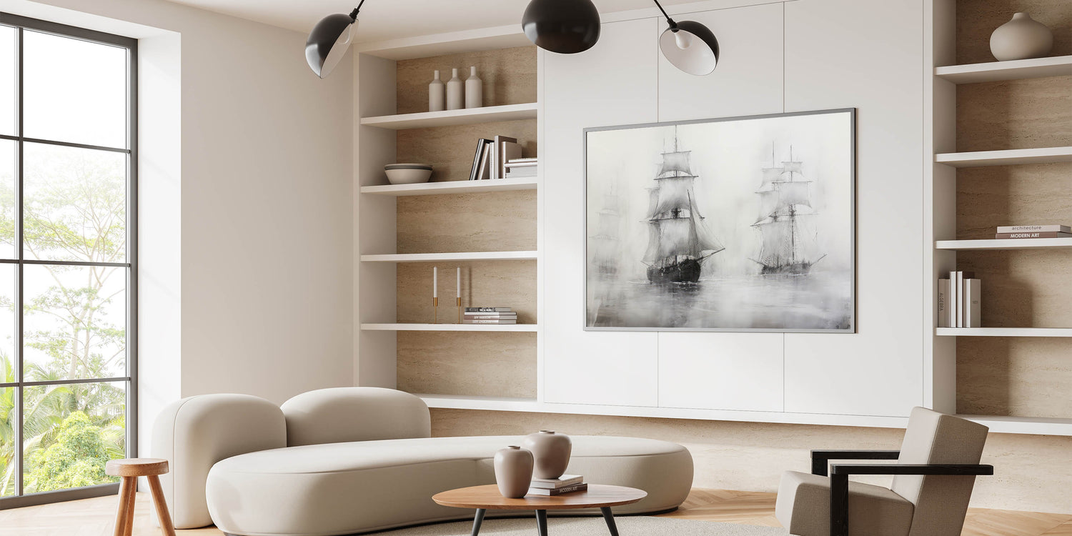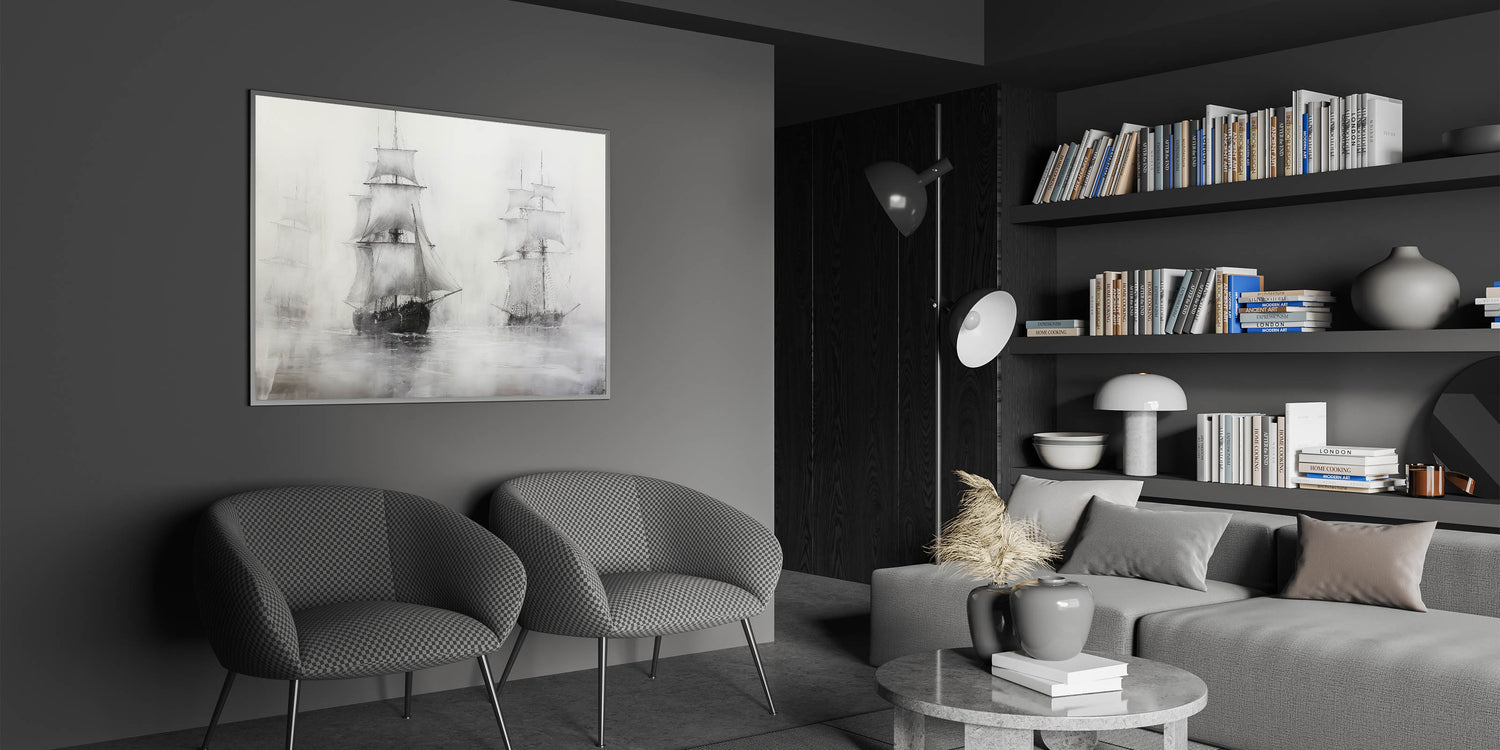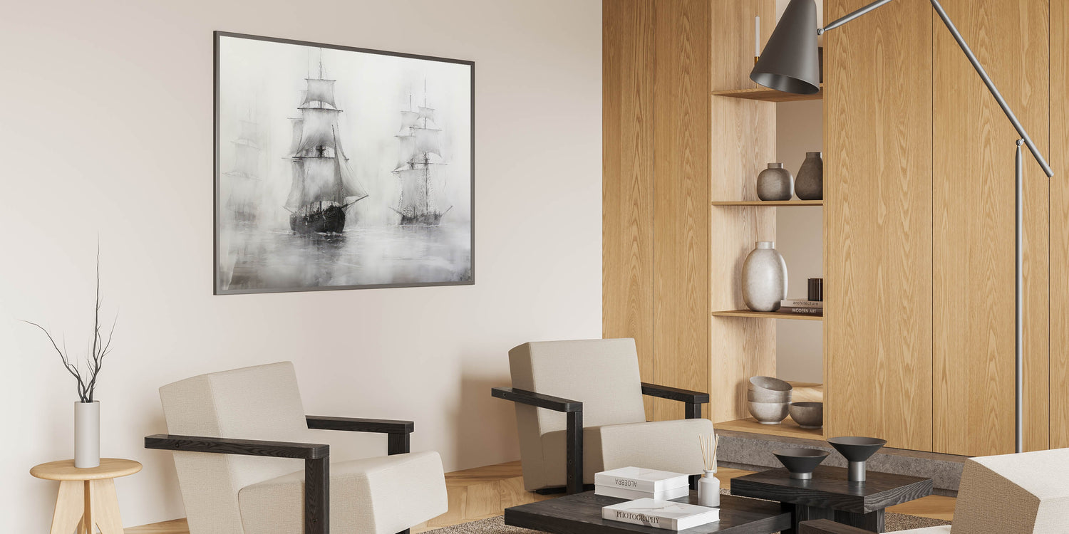 This vintage artwork of ships in the mist brings a touch of classic nautical charm to your home. Its moody, timeless design makes it an elegant addition to any collection of maritime-inspired art.