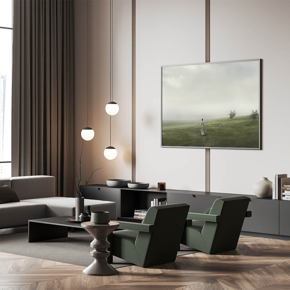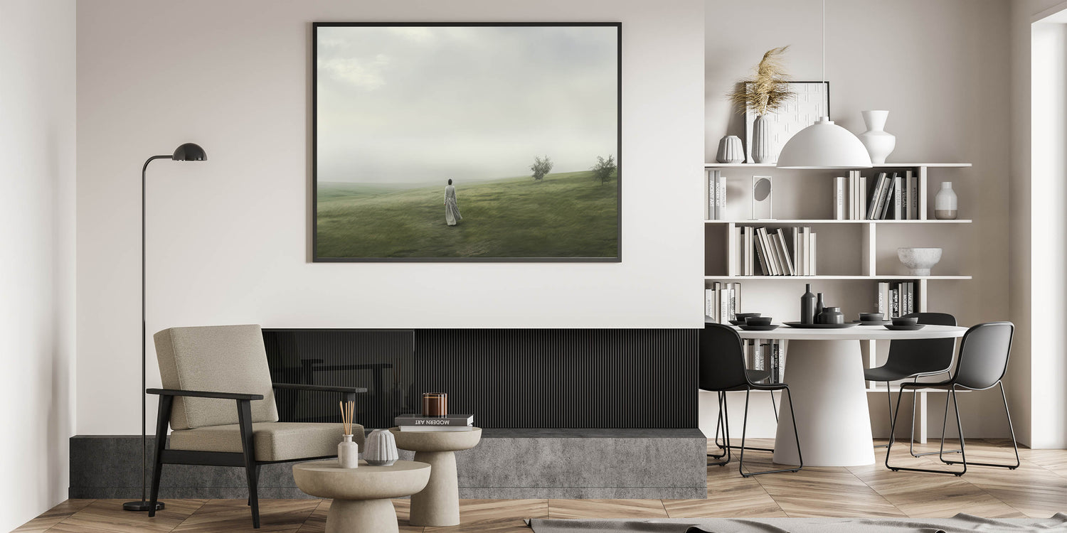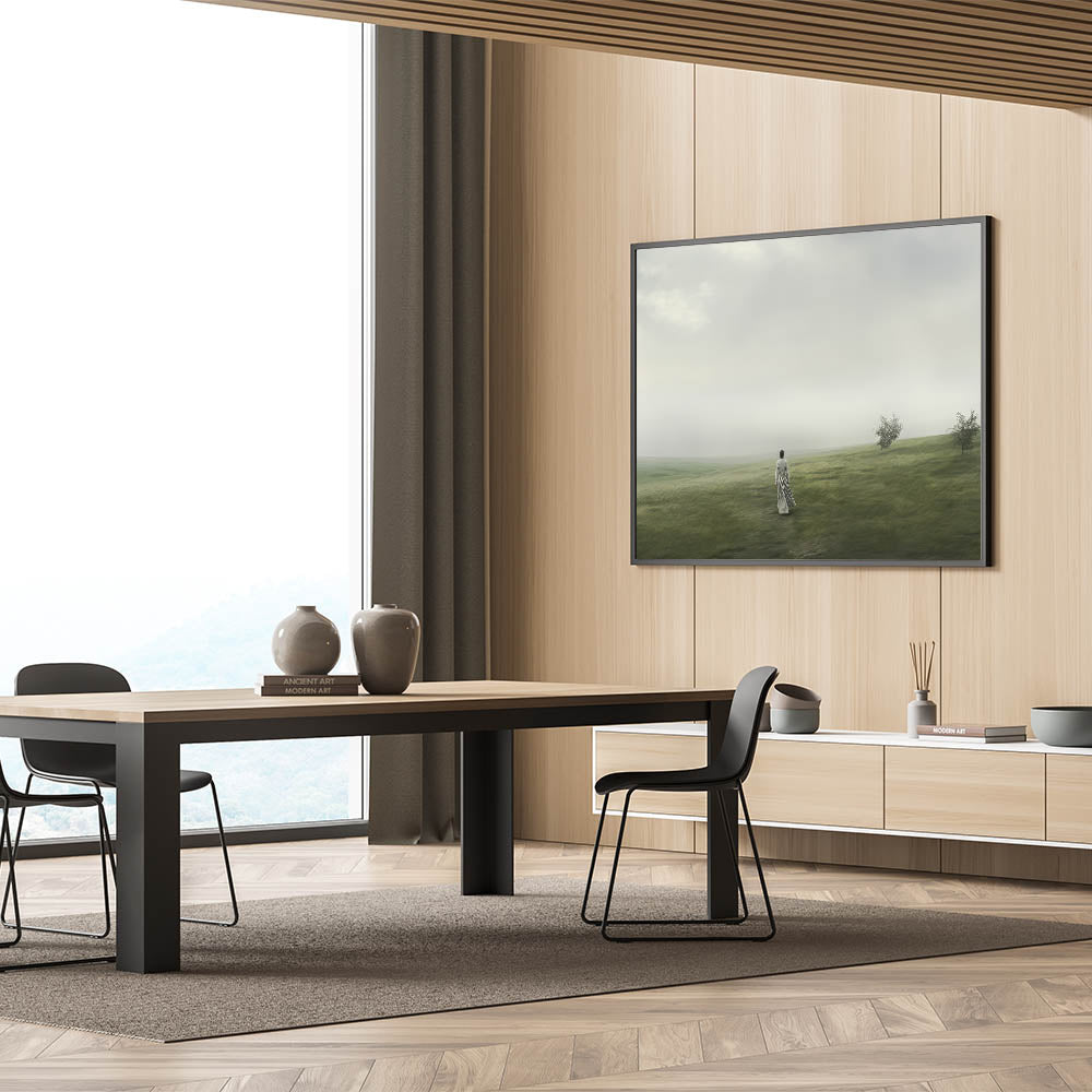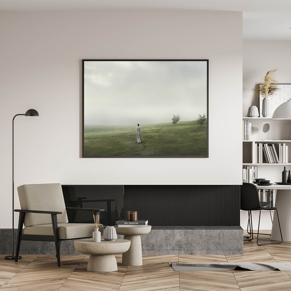 Step into a serene vintage landscape with this tranquil artwork. The piece captures the timeless beauty of a peaceful countryside, where a solitary figure walks through rolling green hills under a soft, misty sky. This stunning landscape art transports you to a quiet, nostalgic world, perfect for those who appreciate the elegance of retro landscapes and the charm of vintage nature wall art.