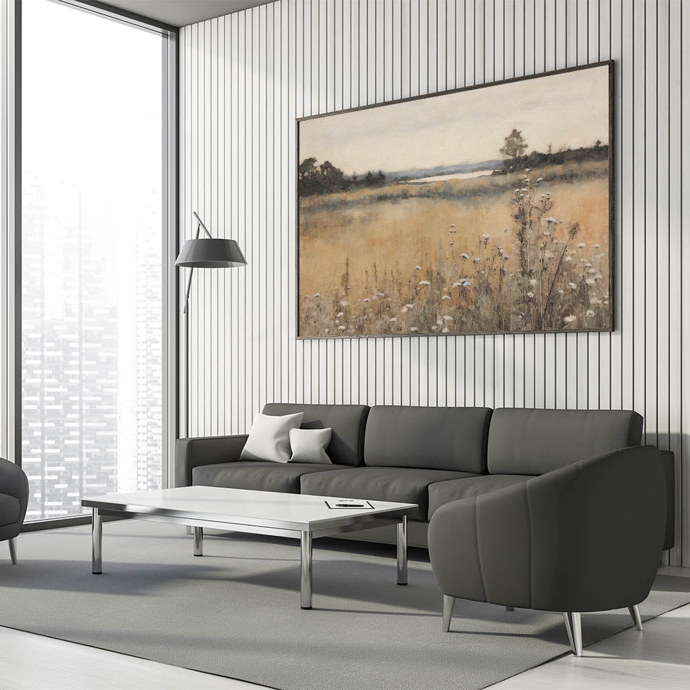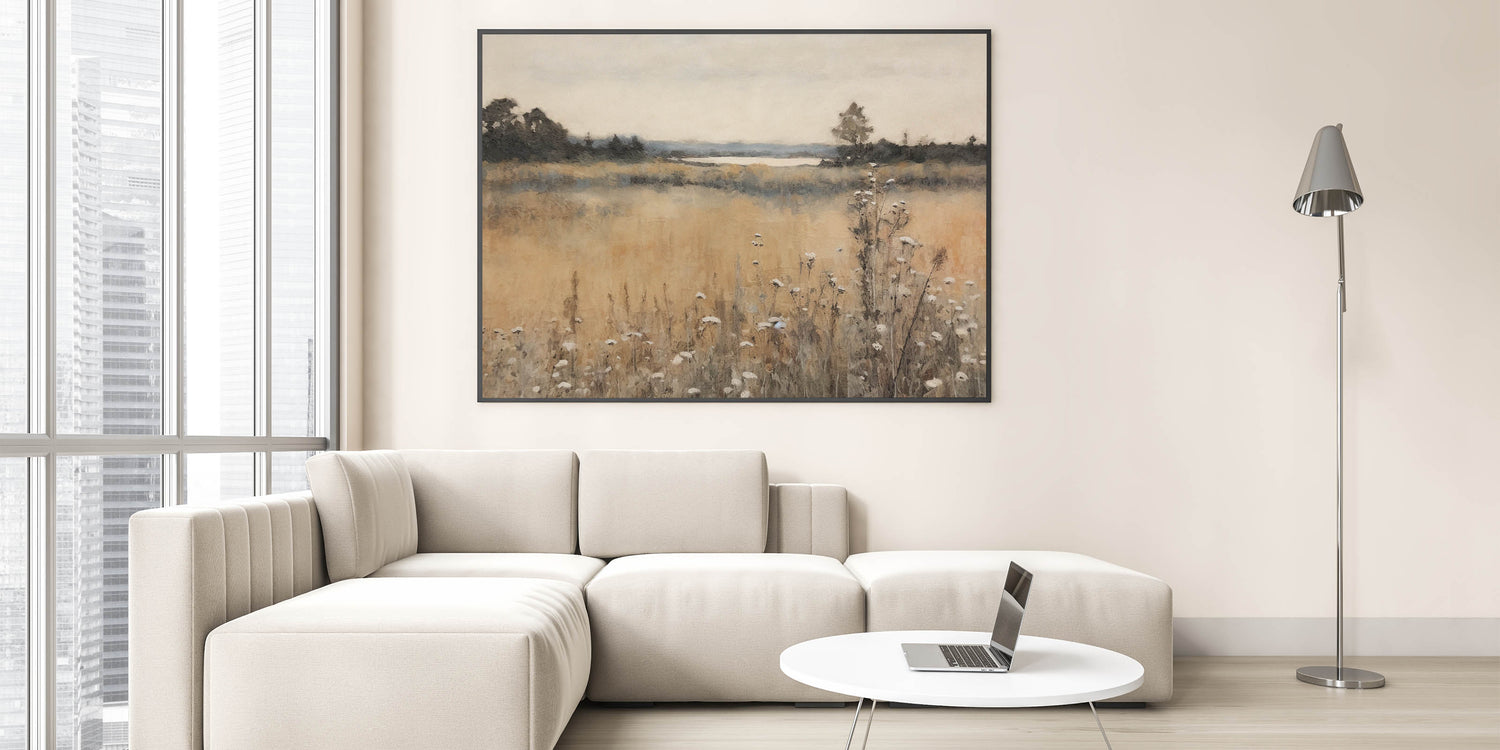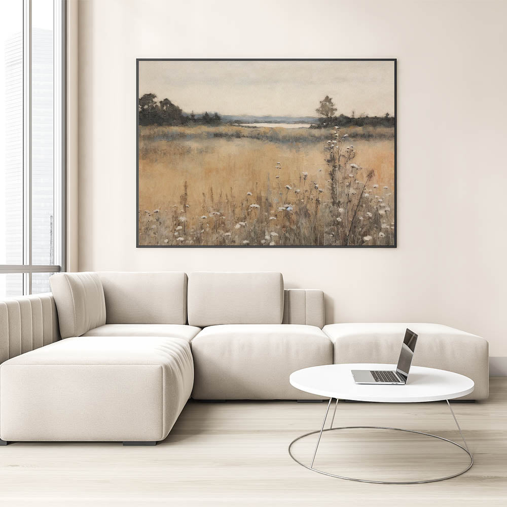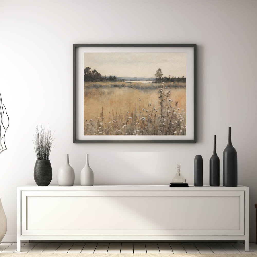 This vintage landscape art captures the serene beauty of a vast meadow adorned with delicate wildflowers, stretching out to the horizon. The soft, earthy tones of yellow and gray, paired with the peaceful expanse of nature, create a sense of calm and tranquility. This piece brings timeless charm to any space, making it the perfect addition to nature-inspired or vintage-themed home decor.