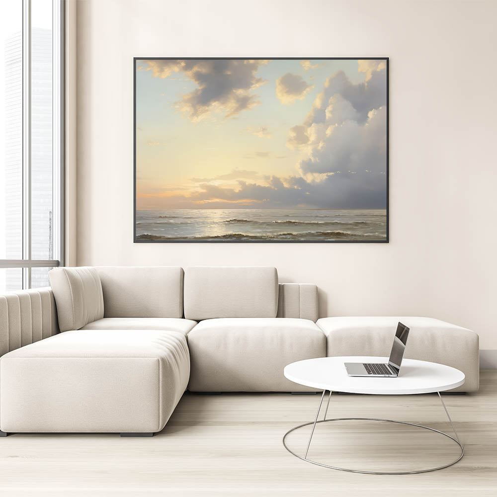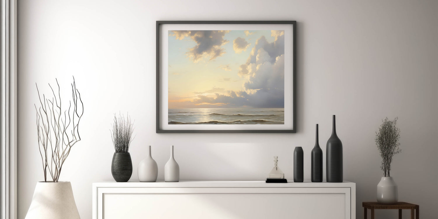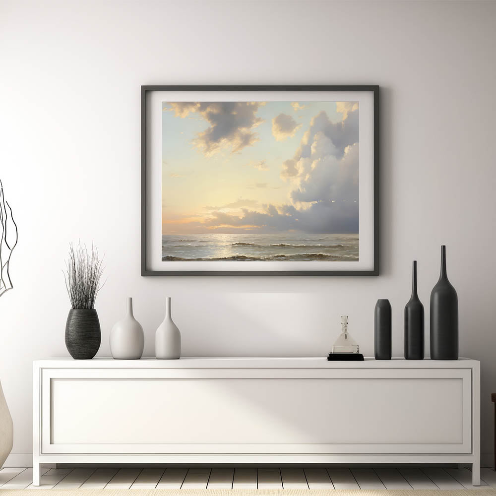 This breathtaking vintage landscape art captures the serene beauty of the ocean at sunset. The soft golden hues of the setting sun reflecting off the gentle waves create a peaceful and tranquil atmosphere. The dramatic clouds add depth and movement to the scene, making this piece perfect for adding a sense of calm and timeless beauty to your home decor. Whether you're drawn to seaside art or vintage maritime prints, this piece will enhance any room with its elegance.