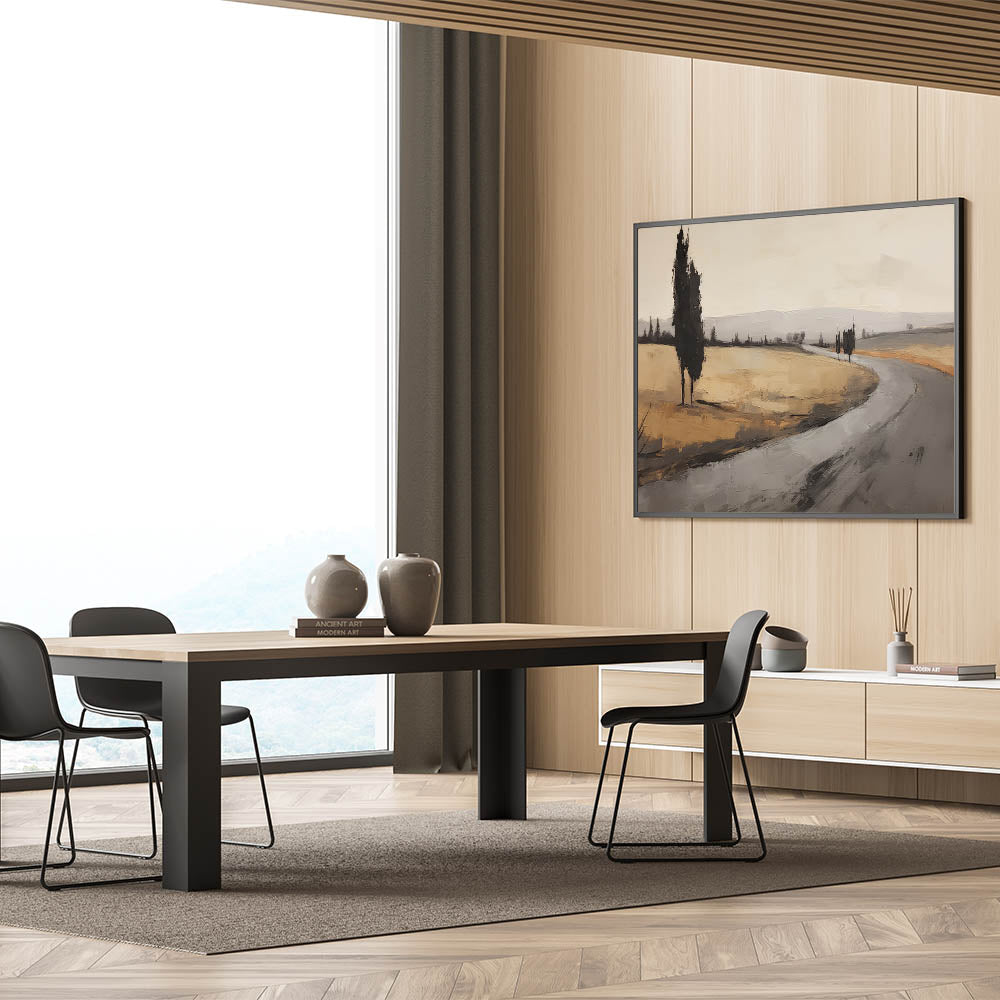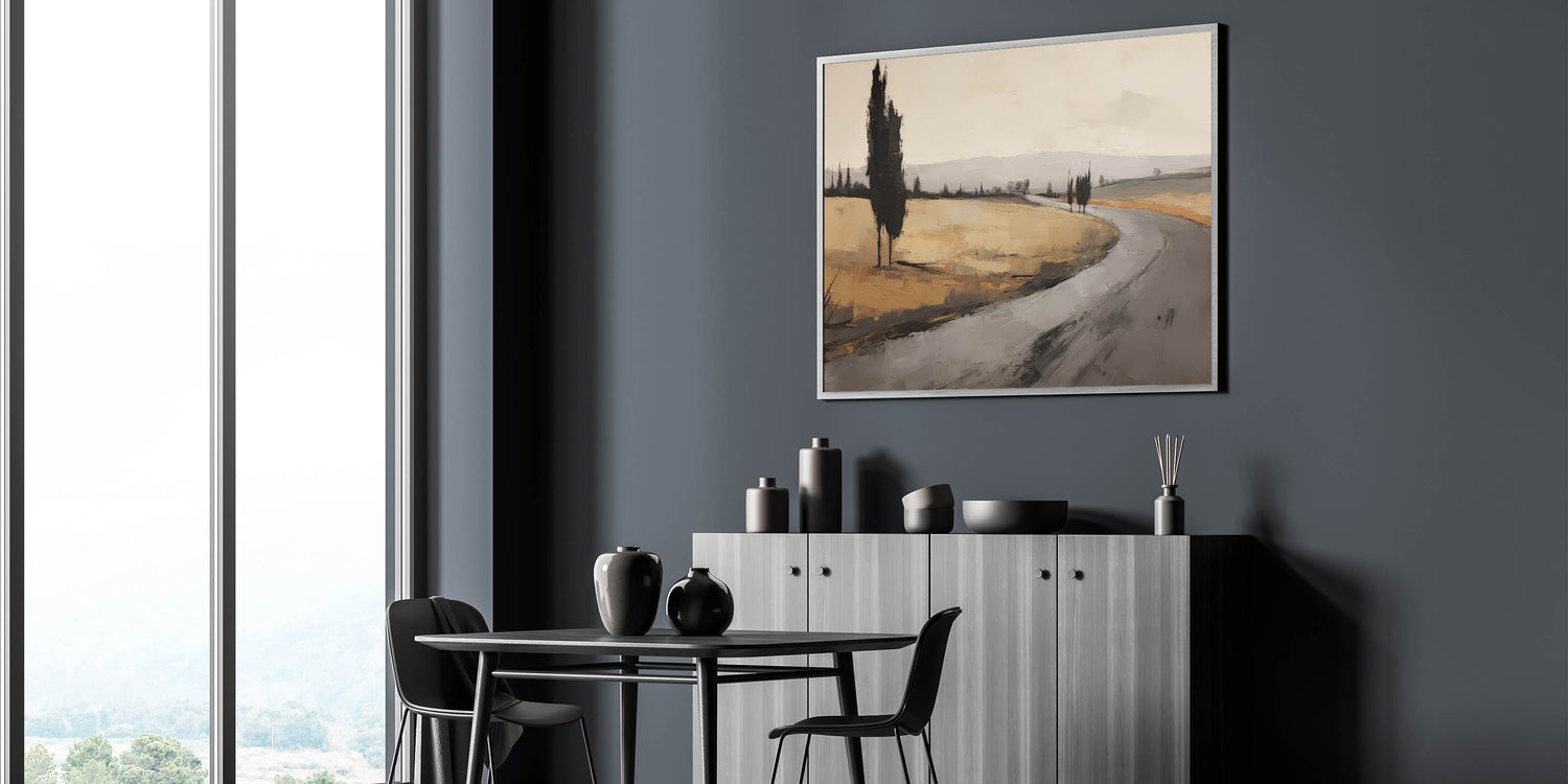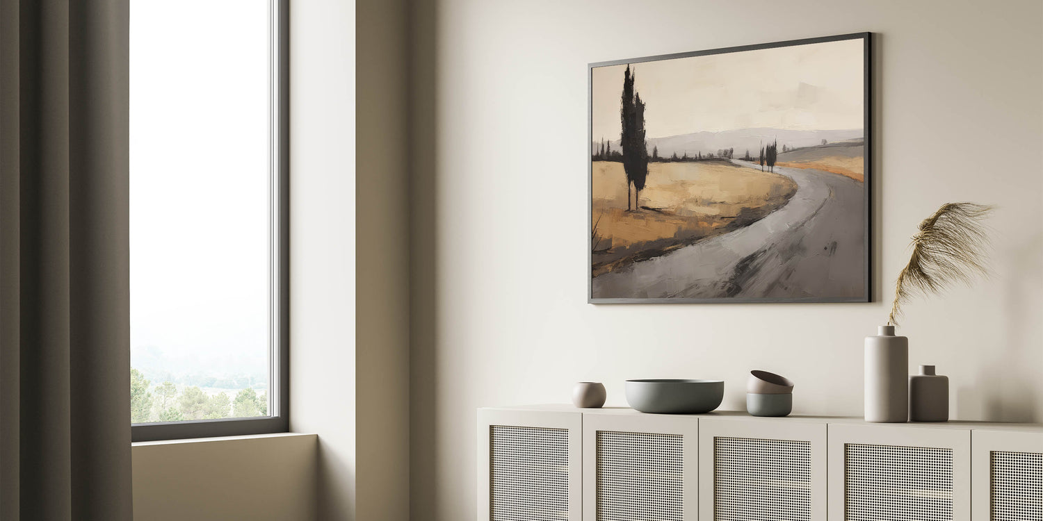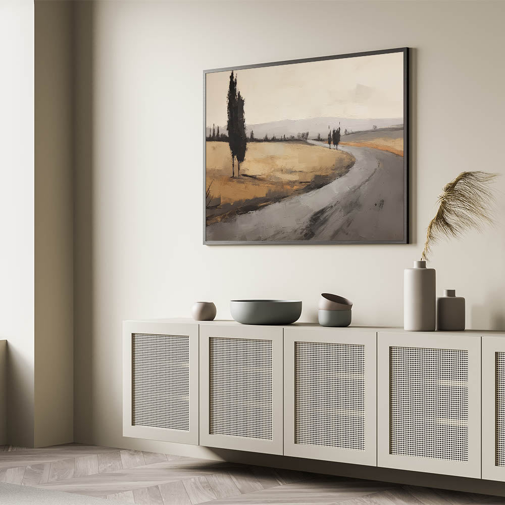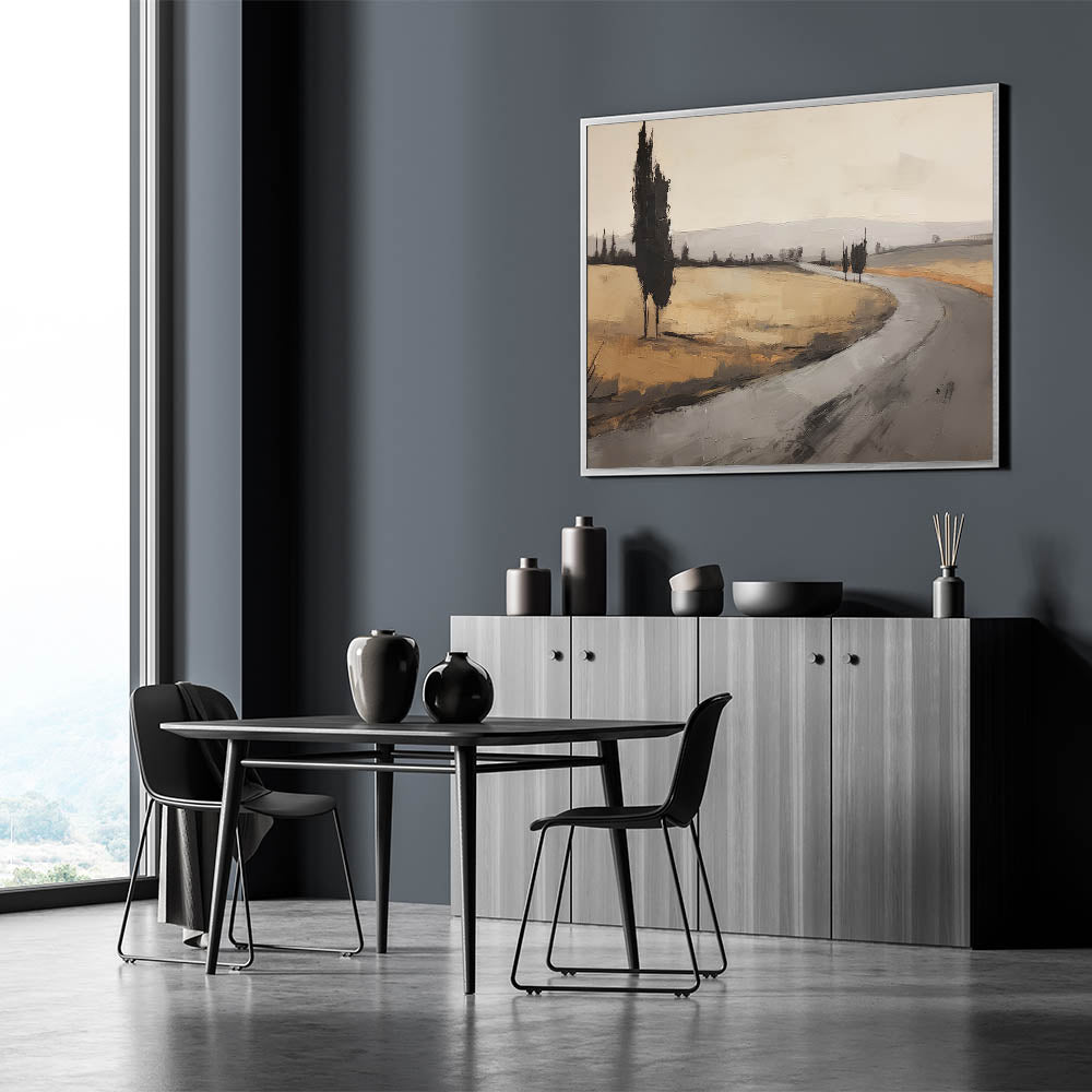 Bring the quiet elegance of this vintage landscape into your space, evoking the timeless beauty of nature and countryside roads.