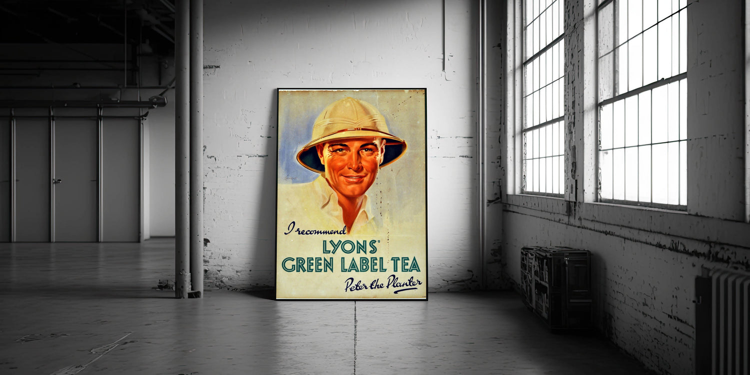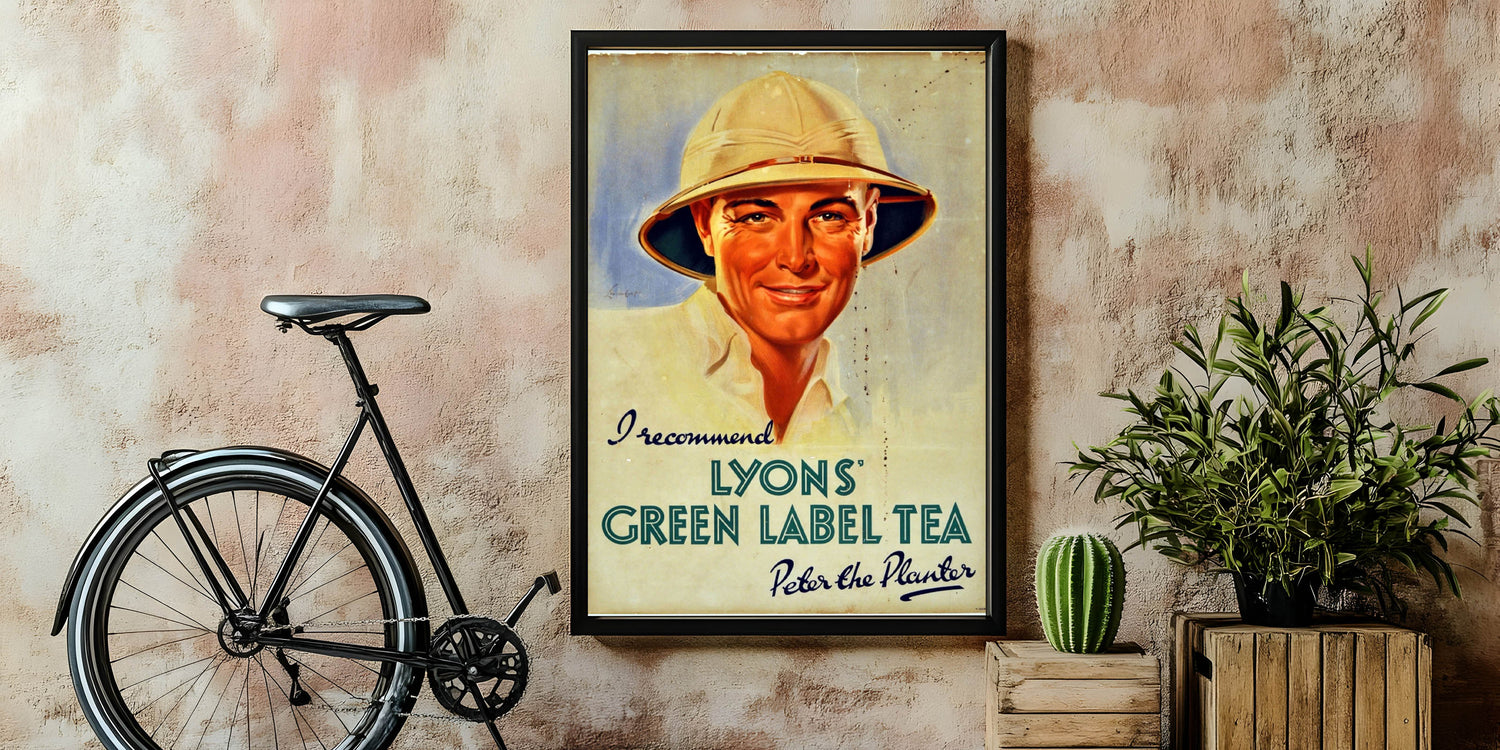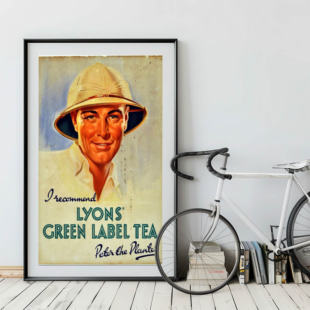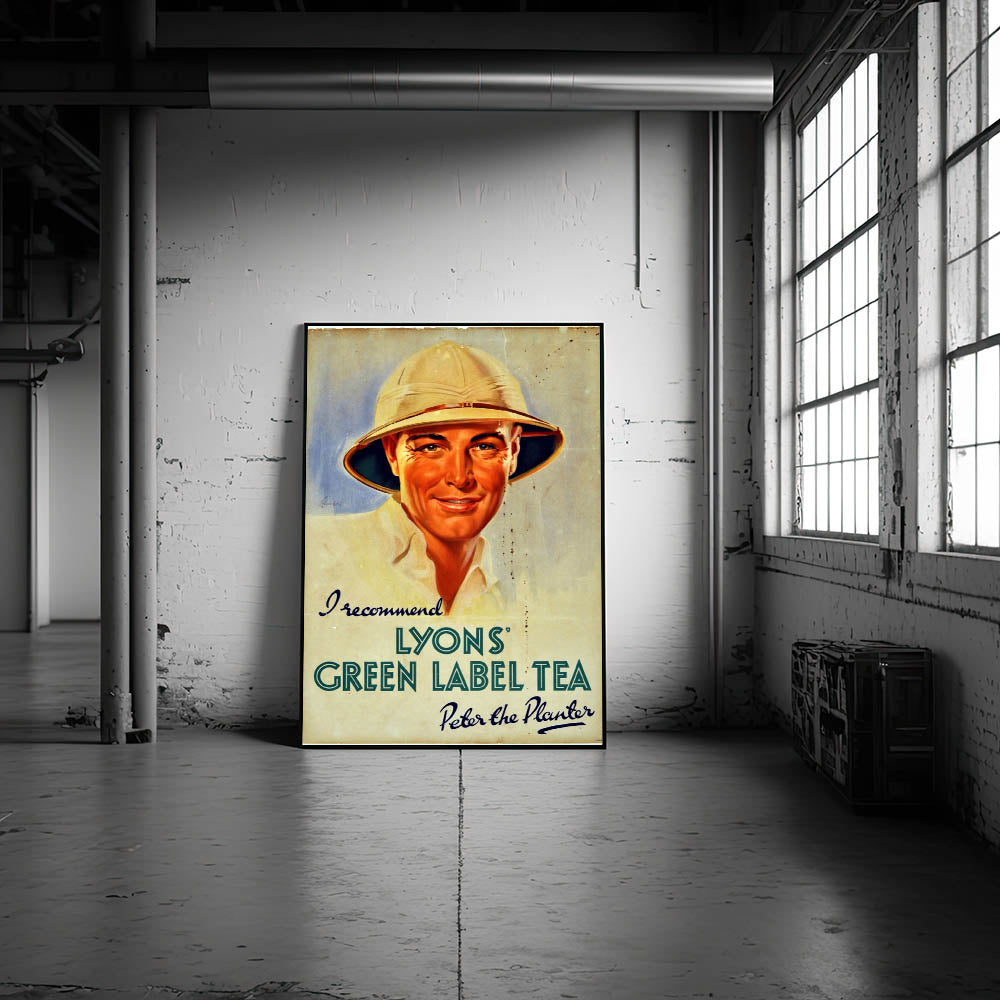 This charming vintage advertisement for Lyons' Green Label Tea features the iconic figure "Peter the Planter," who confidently recommends the quality tea. With his warm smile and adventurous spirit, Peter embodies the exotic, premium appeal of Lyons' tea. The vibrant colors and intricate details of the illustration make this retro print a delightful piece of advertising art.