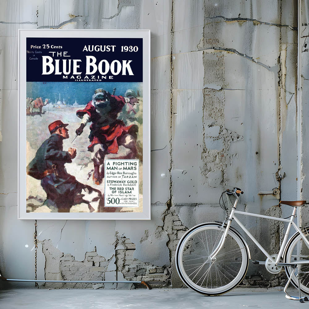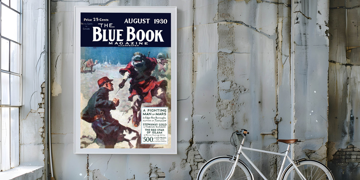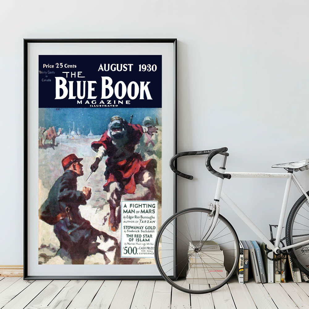 Capture the adventure and intrigue of a classic 1930 The Blue Book Magazine cover with this dramatic print, featuring A Fighting Man of Mars. The vivid illustration of a tense desert scene brings the world of Edgar Rice Burroughs’ tales to life. Whether you’re a collector of vintage magazine covers or simply love iconic retro prints, this piece will bring timeless appeal to your space.