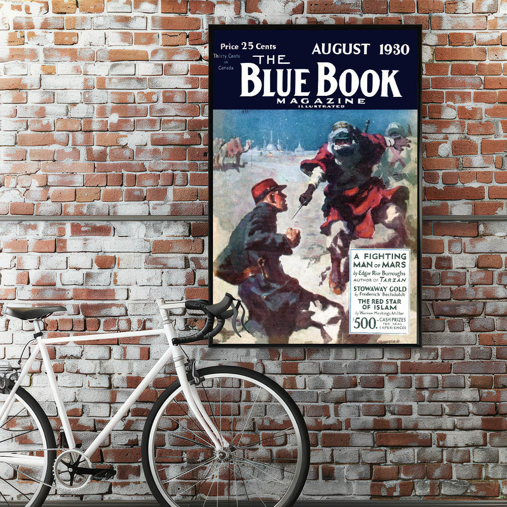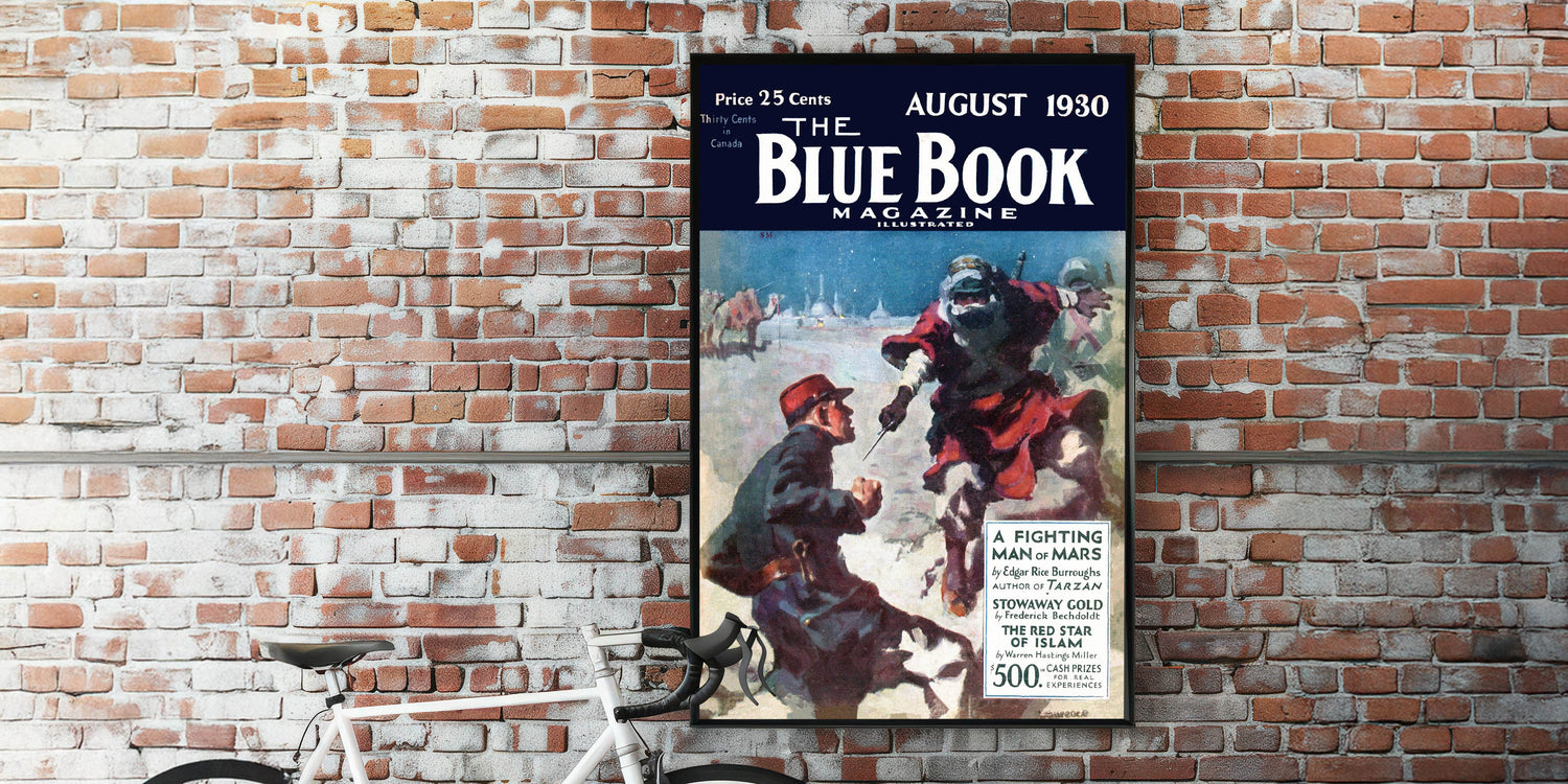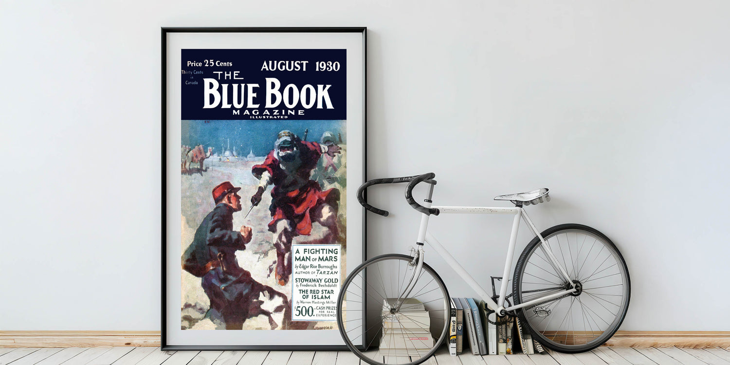 Capture the adventure and intrigue of a classic 1930 The Blue Book Magazine cover with this dramatic print, featuring A Fighting Man of Mars. The vivid illustration of a tense desert scene brings the world of Edgar Rice Burroughs’ tales to life. Whether you’re a collector of vintage magazine covers or simply love iconic retro prints, this piece will bring timeless appeal to your space.