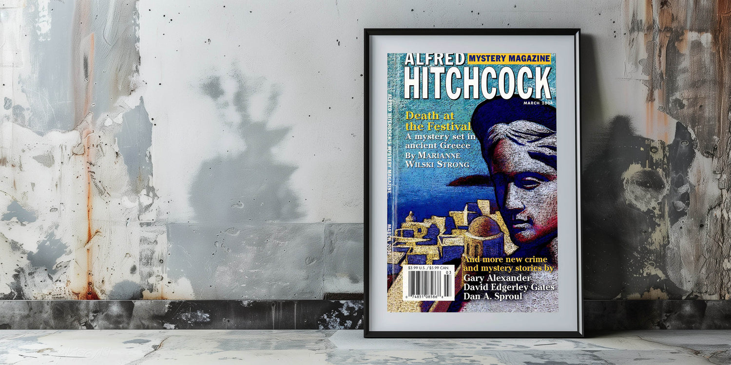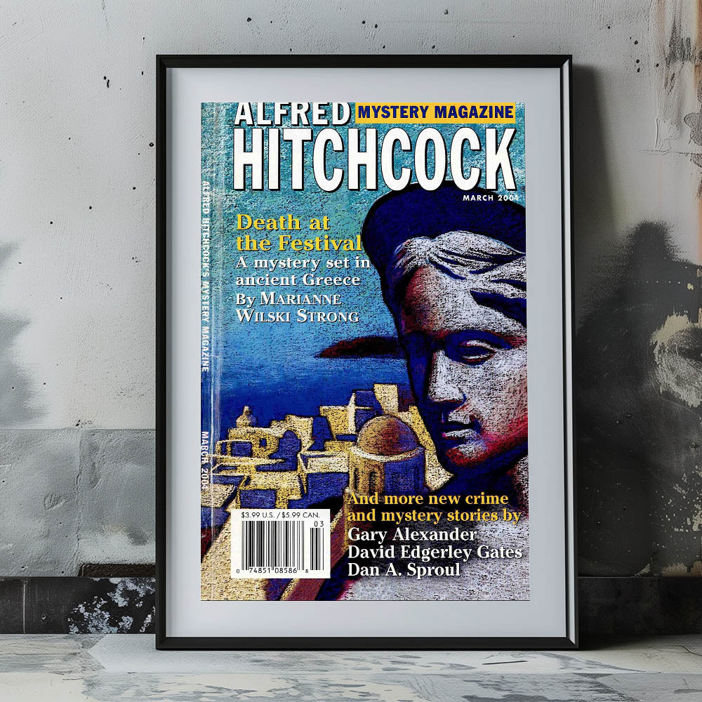 Dive into a world of mystery with this vintage magazine cover art from the Alfred Hitchcock Mystery Magazine, March 2004 edition. Featuring a stunning illustration of ancient Greece, this retro print is perfect for anyone who enjoys combining historical intrigue with a classic design. Ideal for those who appreciate classic magazine cover artwork, this cover will elevate any room.